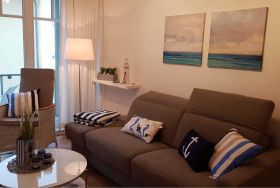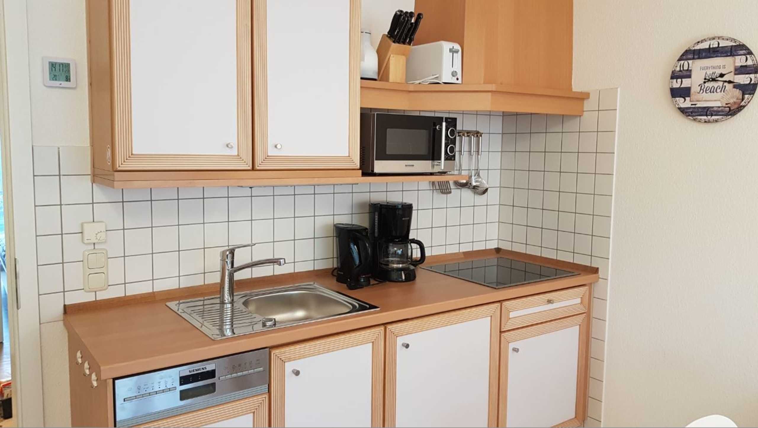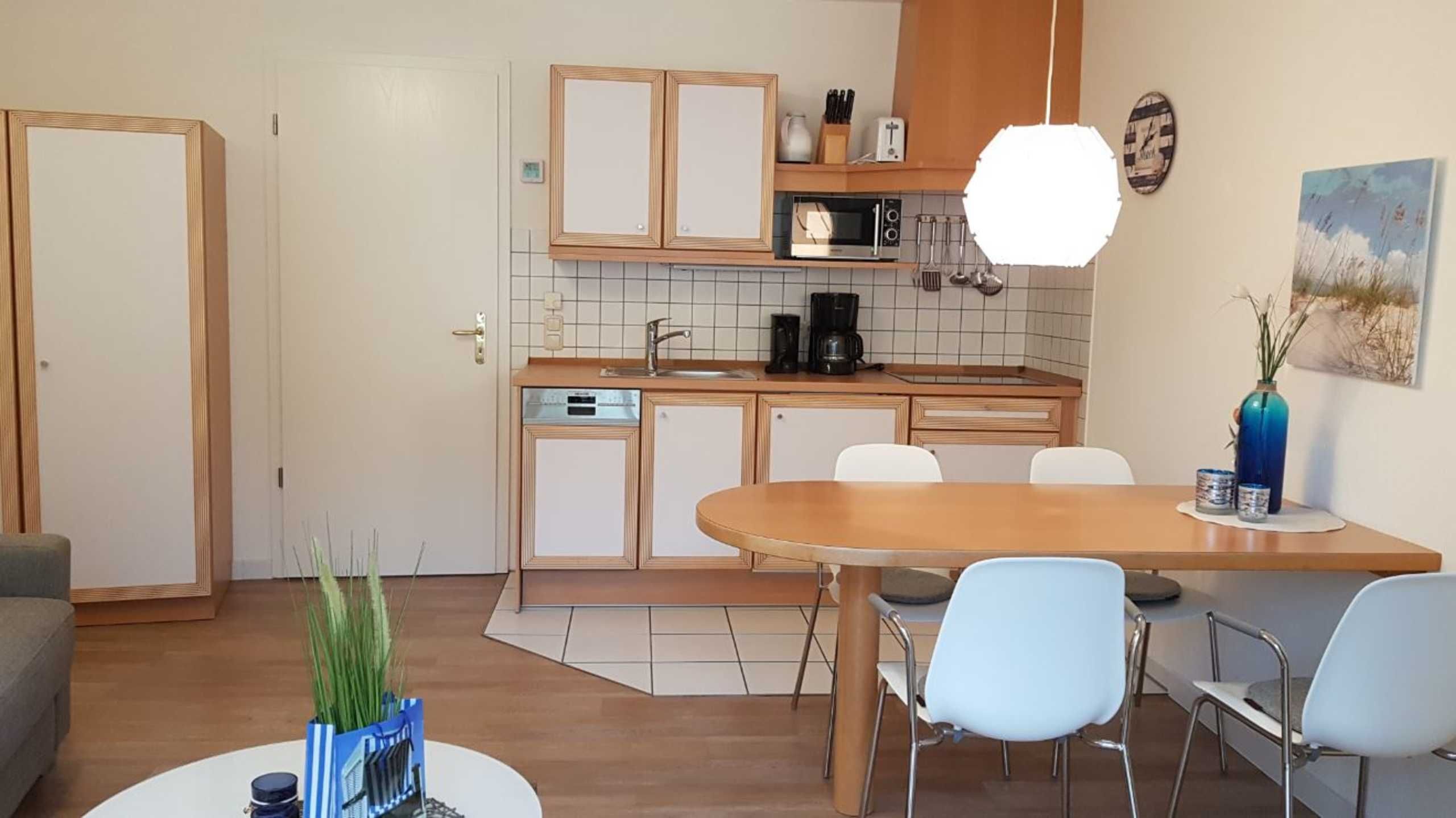 Die lichtdurchflutete, moderne und liebevoll eingerichtete Wohnung verfügt über eine komplett ausgestattete Küchenzeile, einen offenen Wohn-Essbereich mit hochwertigen, komfortablen Schlafsofa (1,40m x 2,00m), Flachbild -TV, DVD-/CD Player, Kleiderschrank.