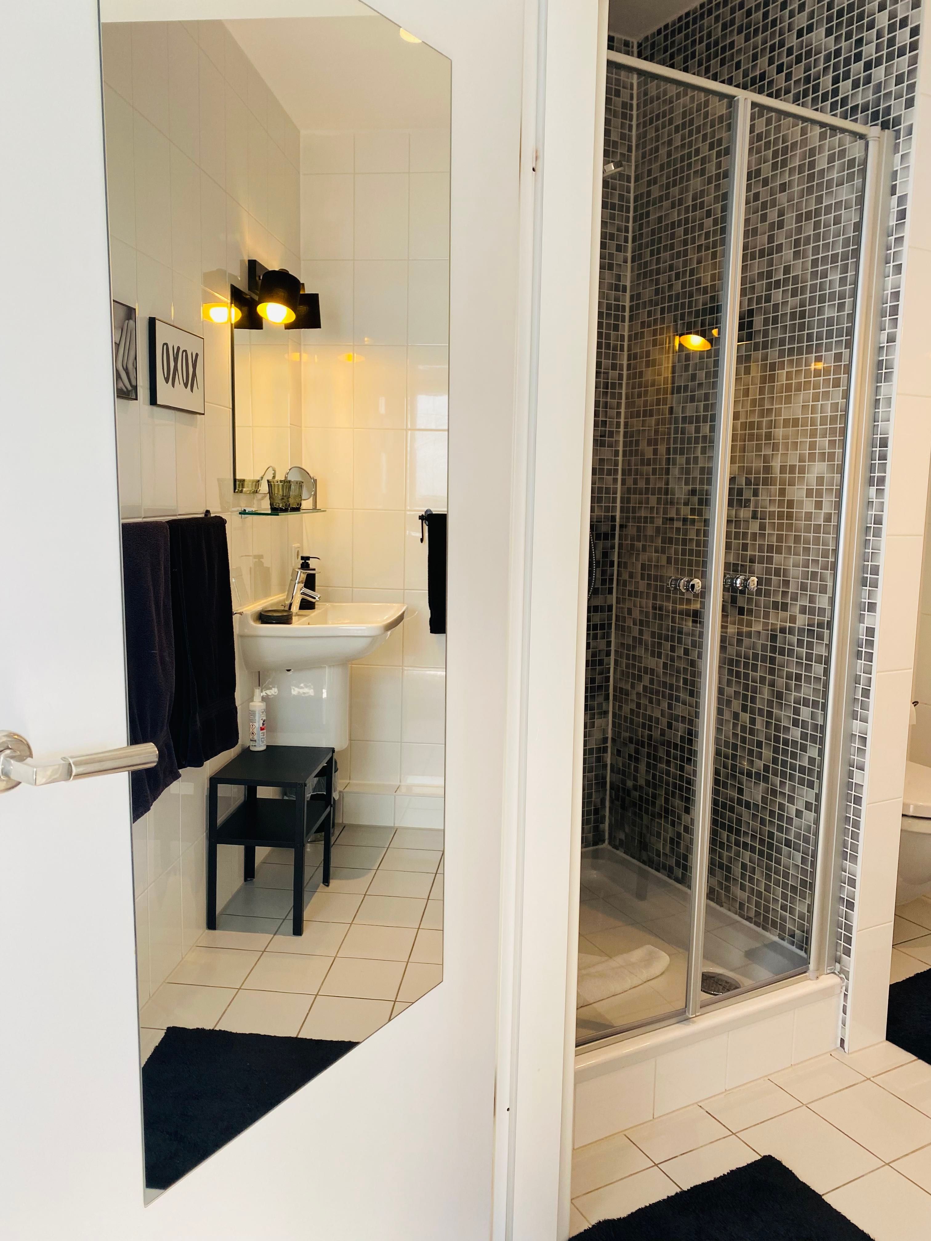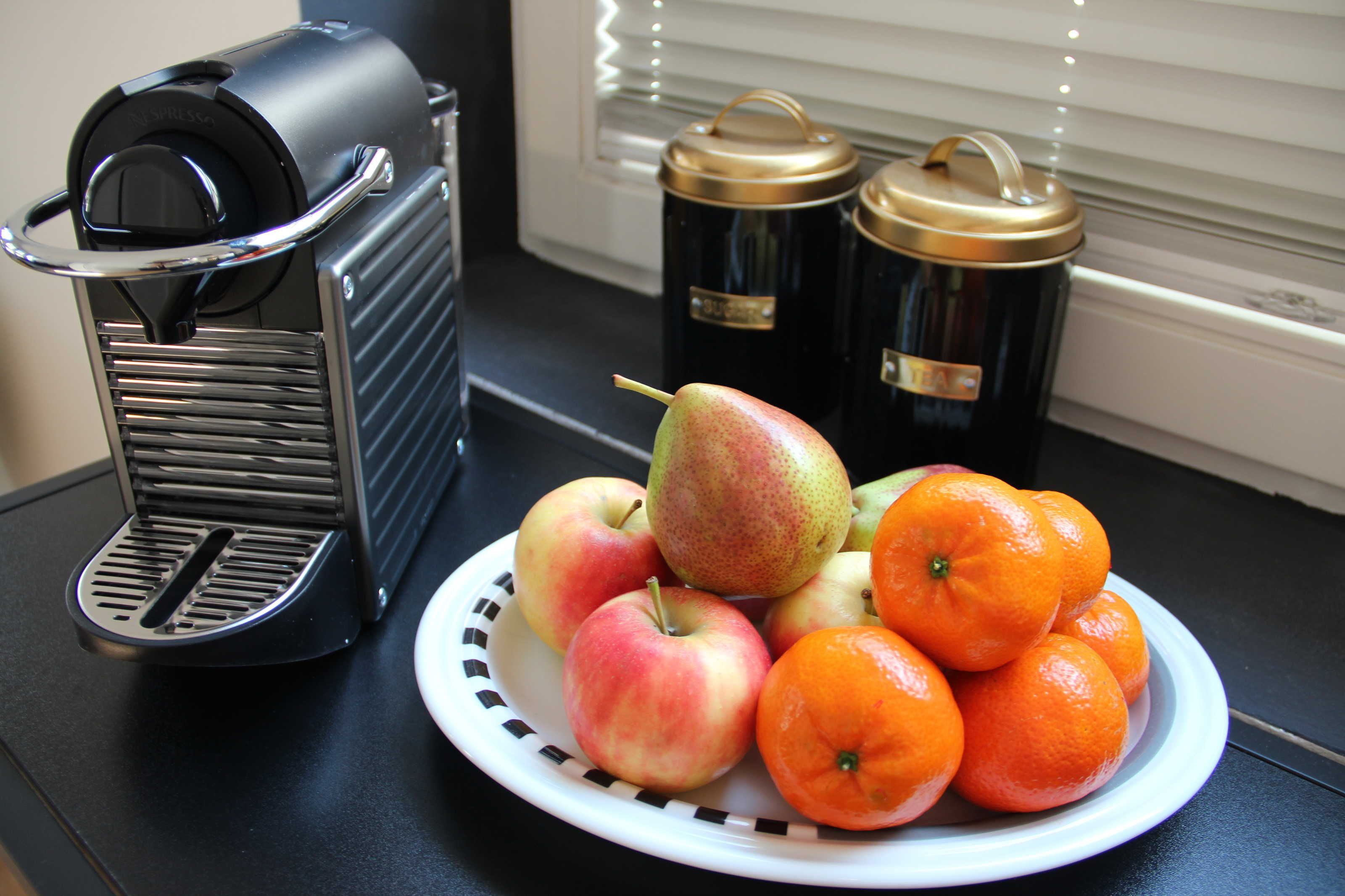 Doppelbett, Bettwäsche, Pantry Küche mit Kühlschrank & Herd, Duschbad mit Fön & Handtüchern, Smart - TV und Internet. Die Pantryküche ist mit Geschirr, Gläsern, Besteck, Töpfen und einer Pfanne, einer Kaffeefilter- und einer Nespressomaschine, Toaster, Wasserkocher und anderen Gebrauchsgegenständen ausgestattet.