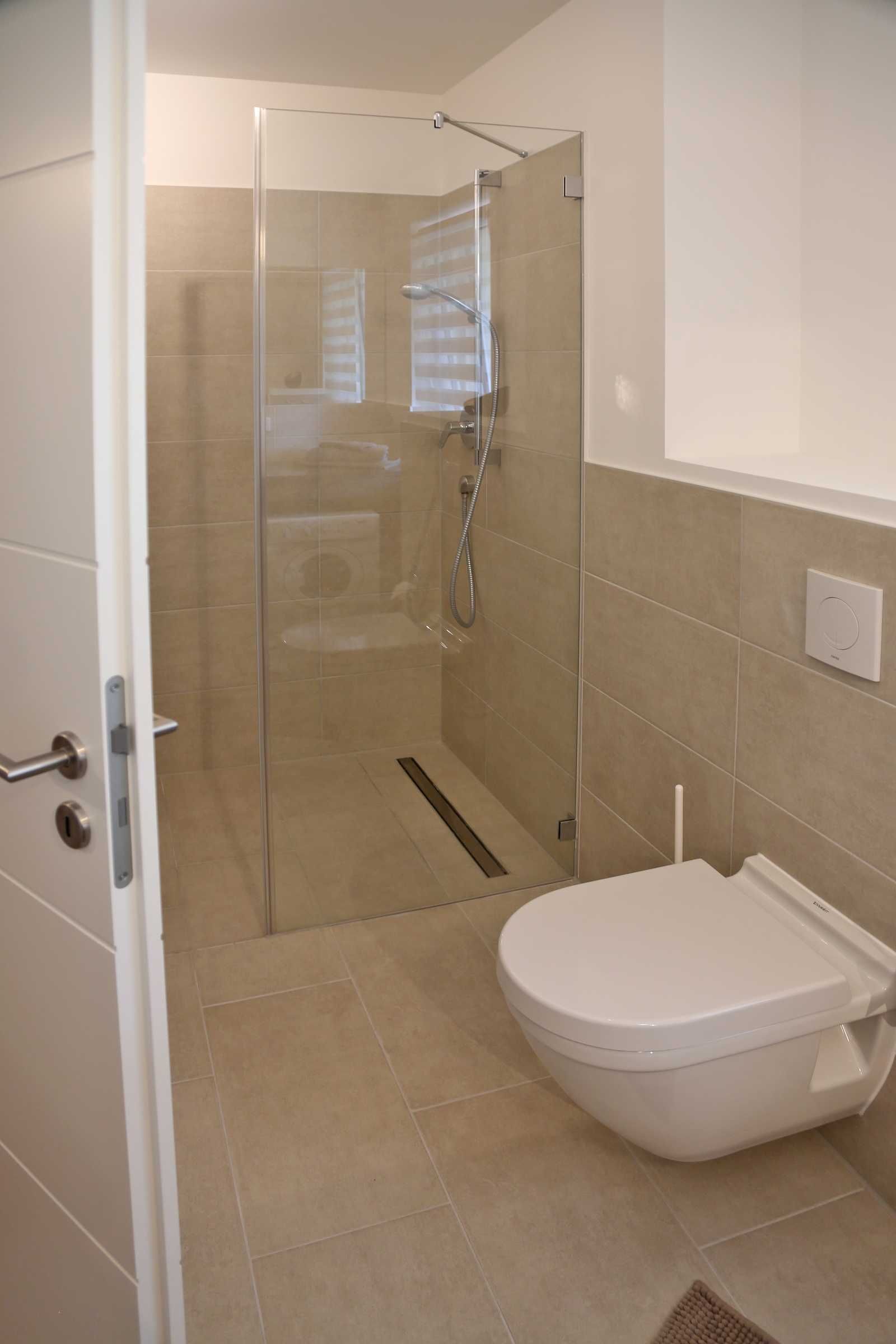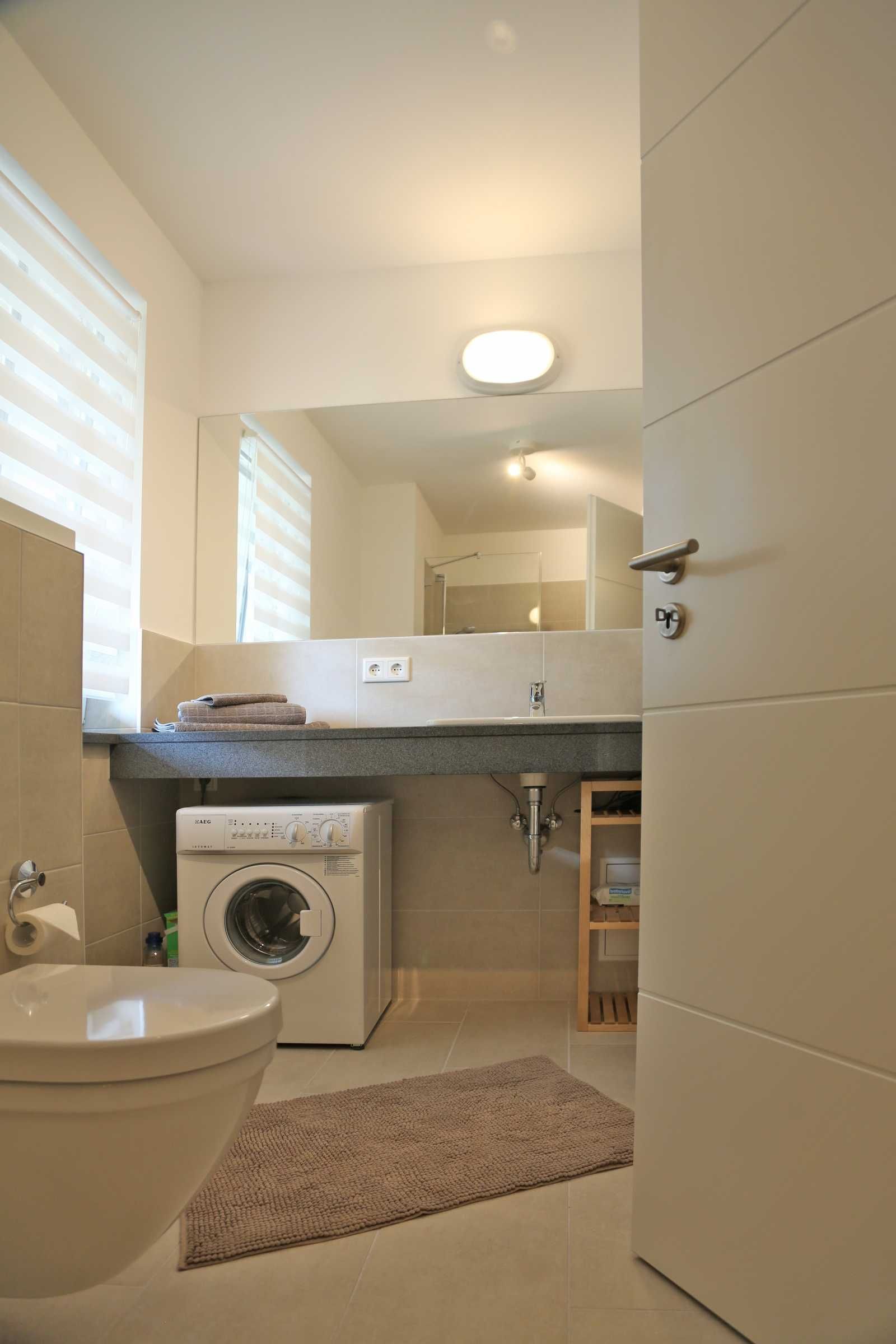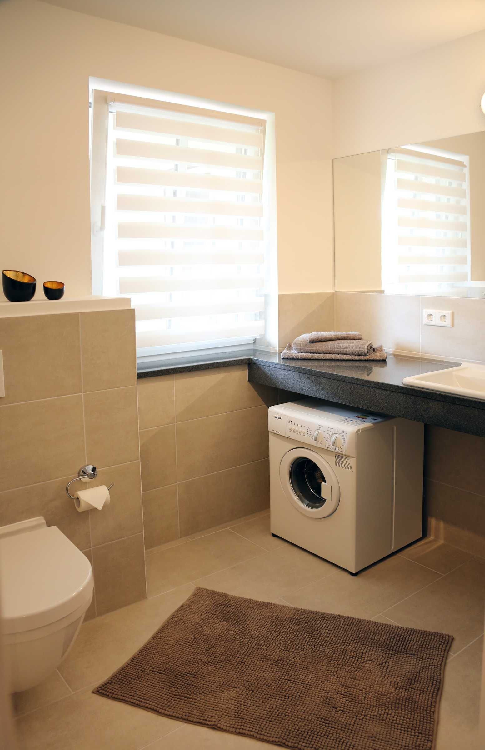 Das neben dem Kinderschlafzimmer liegende Bad verfügt neben den sanitären Anlagen (ebenerdige Dusche, Waschtisch, WC) über einen Haartrockner und eine kleine Waschmaschine, die Sie kostenlos nutzen können.