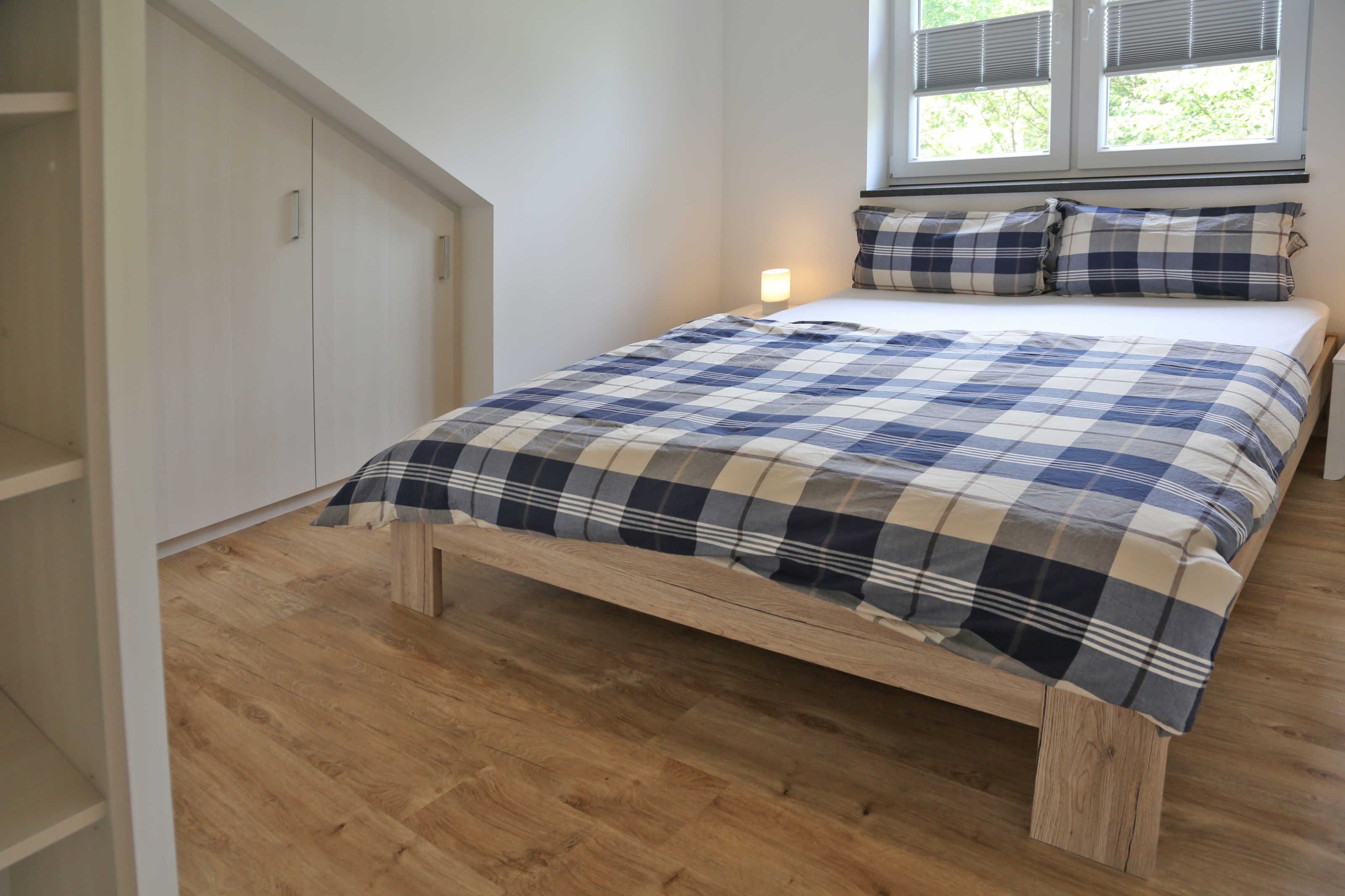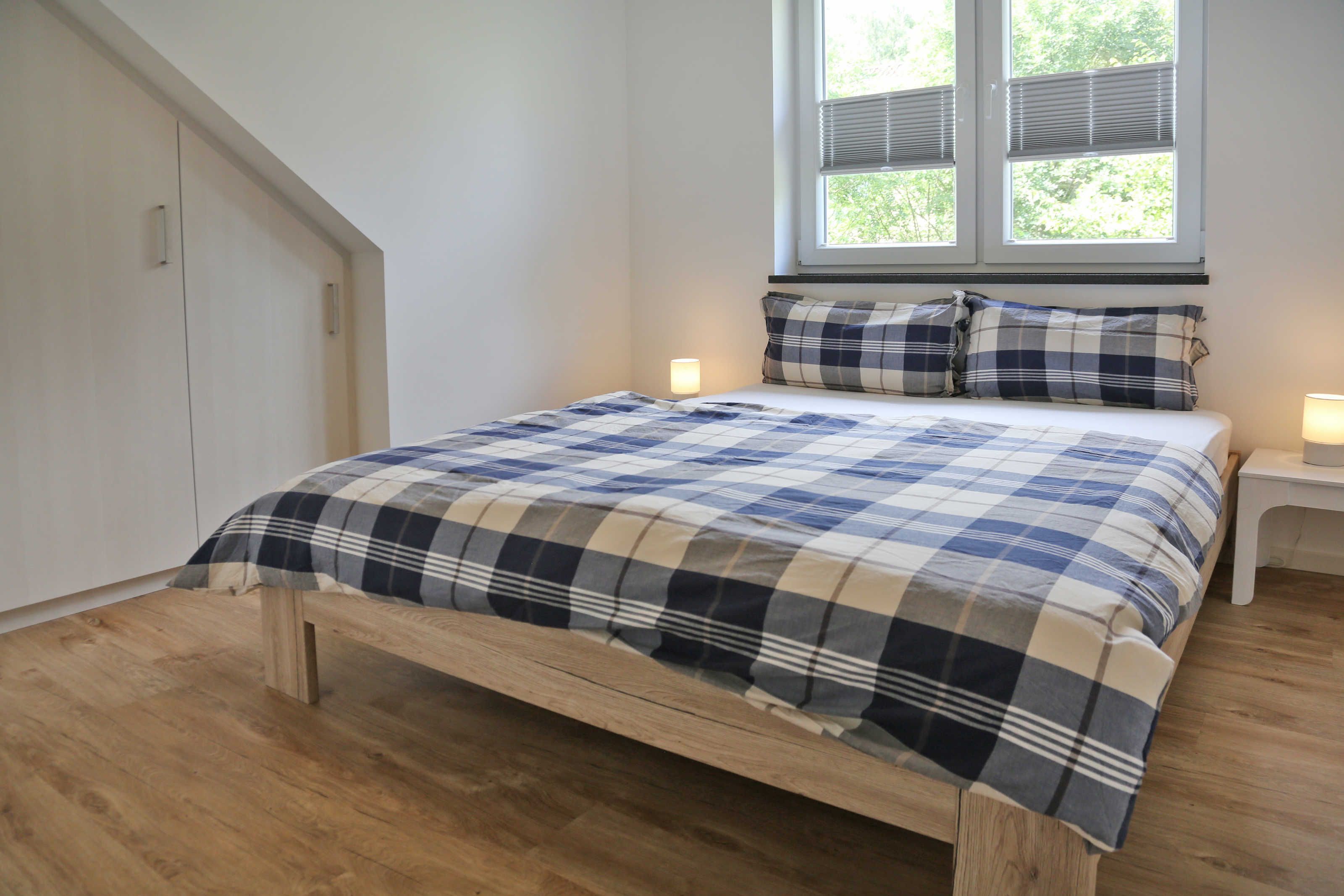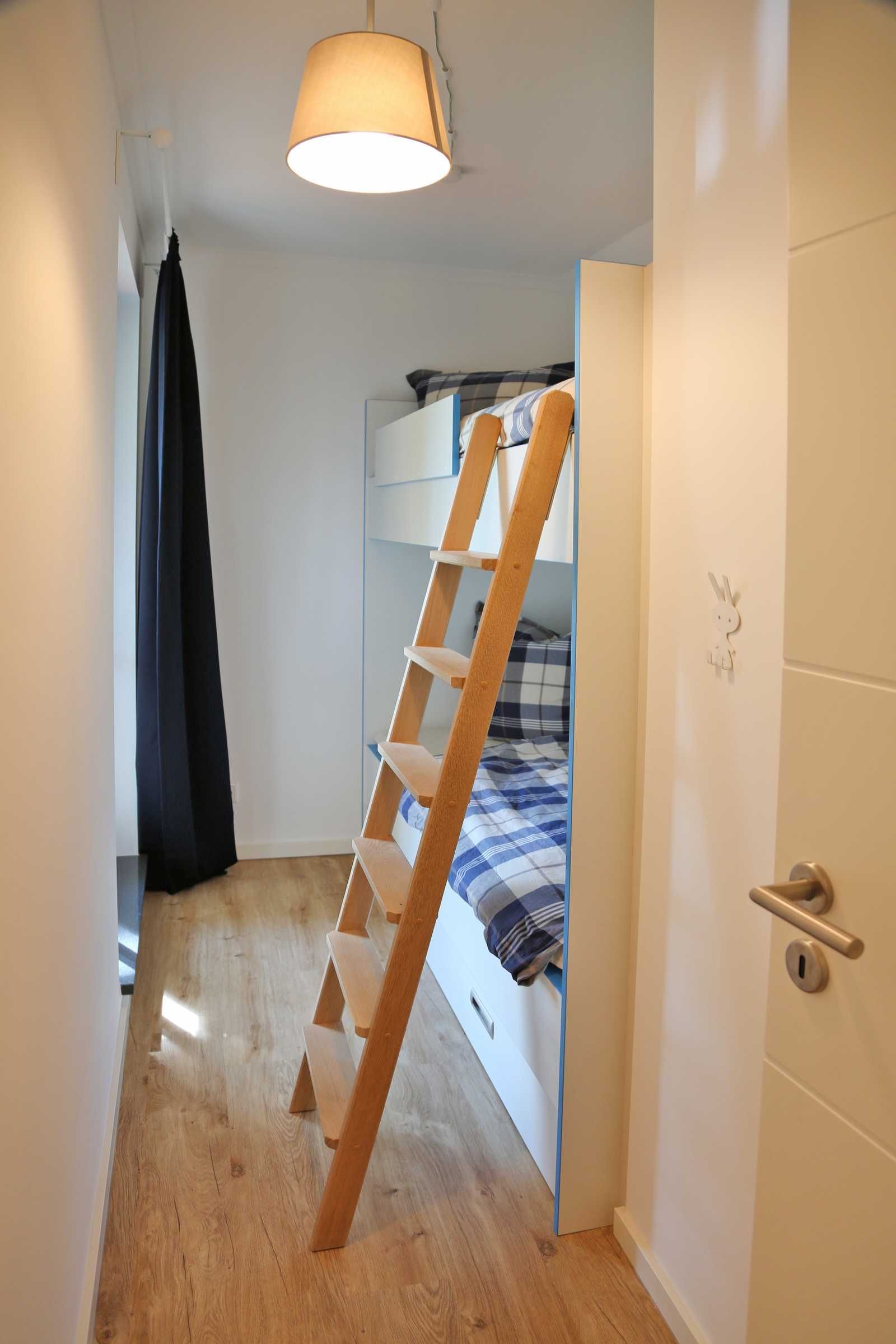 Bei uns finden Sie zwei Schlafzimmer: Ein Schlafzimmer mit einem Doppelbett der Größe 160cm x 200cm sowie ein kleines Kinderschlafzimmer mit einem Etagenbett.