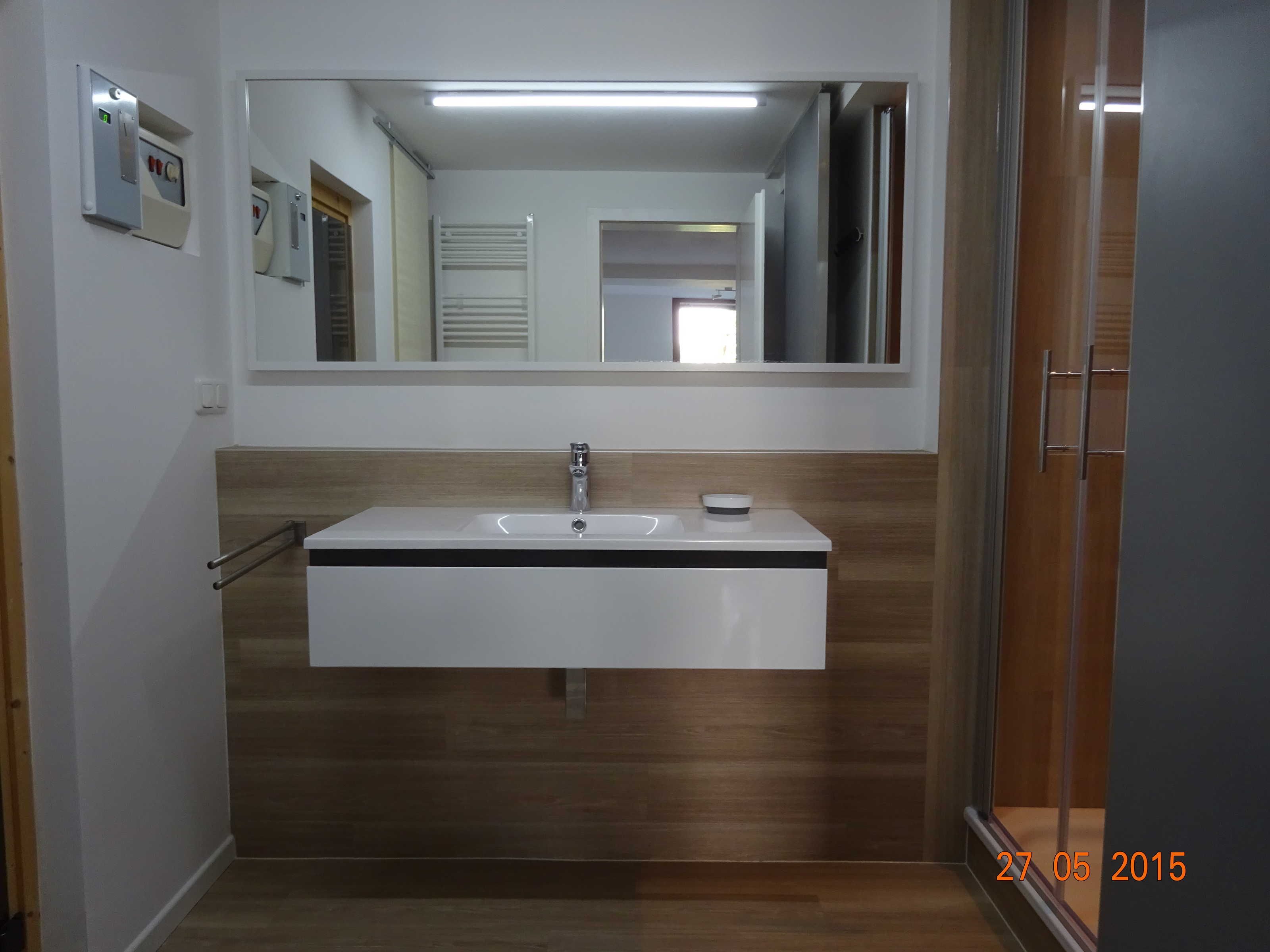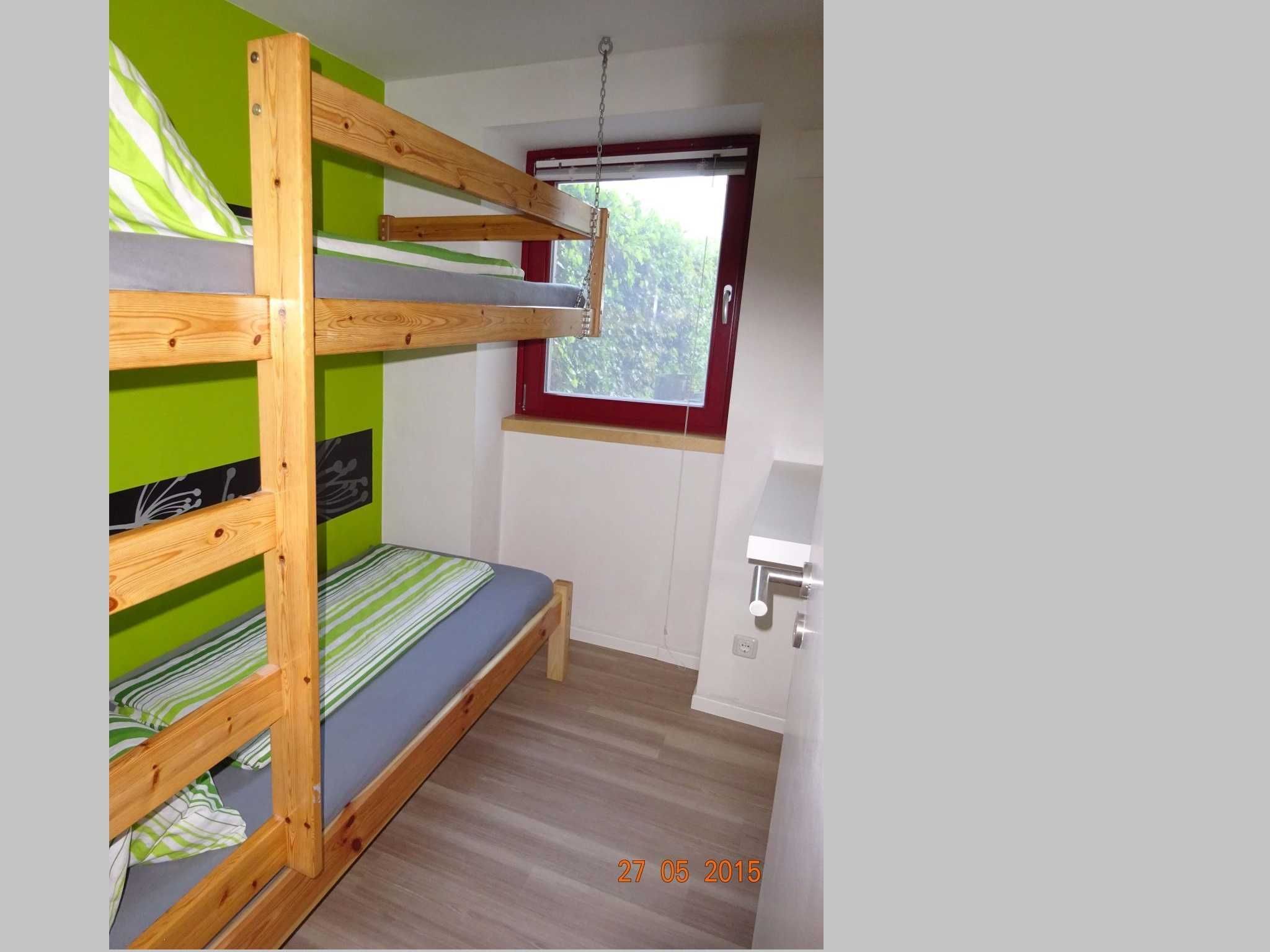 Die Ferienwohnung verfügt über ein Wohnzimmer mit Küchenzeile, Esstisch mit 4 Stühlen (ggfs Kinderhochstuhl) und Schlafcouch, ein kleines Schlafzimmer mit Doppelbett (1,60 x 2,00 m, getrennte Matratzen), Gitterbett und TV, ein kleines Kinderzimmer mit einem Etagenbett (0,80 x 2,00 m), dabei ist das obere Bett nur für ein Kind bis 50 kg geeignet, ein großes Bad mit Sauna (mit Münzautomat), Dusche, großem Waschtisch, Fußbodenheizung, Waschmaschine und WC.