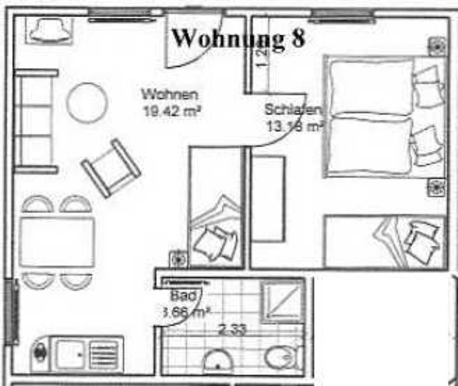 Die Ferienwohnung liegt im Erdgeschoß, hat eine Größe von 37 m² und verfügt über einen Wohnraum mit Pantry, ein Schlafzimmer mit einem Doppel- und einem Etagenbett, ein Badezimmer und eine Terrasse. Im Wohnzimmer befindet sich ein weiteres Einzelbett, zudem ist eine Aufbettung möglich (Schlafsofa). In der Miniküche befinden sich zwei Kochplatten, eine Kaffemaschine, ein Wasserkocher, ein Toaster, ein Kühlschrank mit Gefrierfach sowie eine Mikrowelle. Wäsche kann zugebucht werden (Handtuch- Bettwäschepaket 25,00 pro Person). Im Ferienpark kann ein Grill gemietet werden, ebenso ist die Nutzung einer gemeinschaftlichen Waschmaschine möglich (gegen Gebühr).