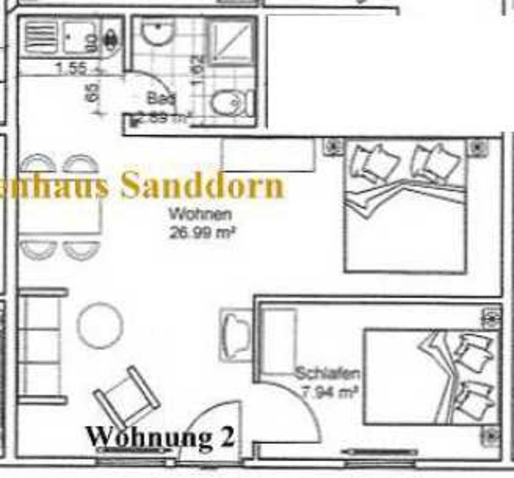 Die Ferienwohnung liegt im Erdgeschoß, hat eine Größe von 38 m² und verfügt über einen Wohnraum mit Pantry, ein Schlafzimmer mit einem Doppelbett, ein Badezimmer und eine Terrasse. In einer Nische im Wohnbereich befinden sich ein weiteres Doppel- und ein Einzelbett, zudem ist eine Aufbettung möglich (Schlafsofa). Die Miniküche ist ausgestattet mit zwei Kochplatten, einer Kaffemaschine, einem Wasserkocher, einem Toaster, einem Kühlschrank mit Gefrierfach sowie einer Mikrowelle. Wäsche kann zugebucht werden ((Handtuch- Bettwäschepaket 25,00 pro Person). Im Ferienpark kann ein Grill gemietet werden, ebenso ist die Nutzung einer gemeinschaftlichen Waschmaschine möglich (gegen Gebühr).