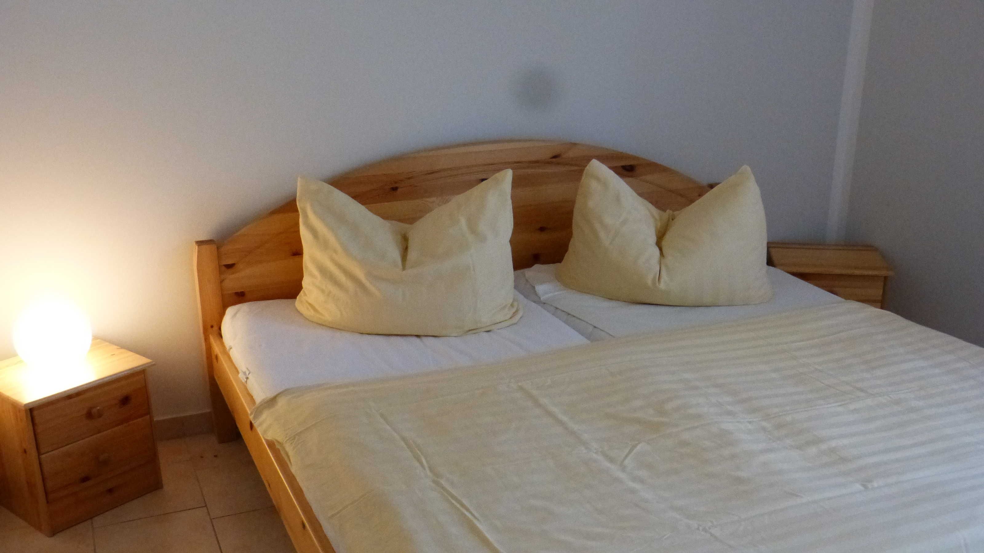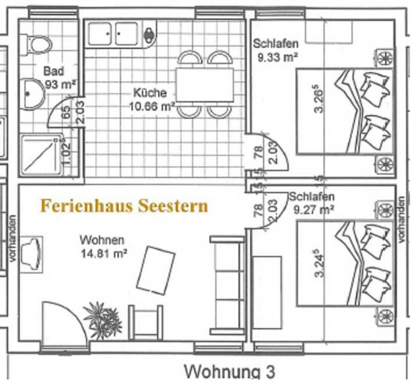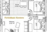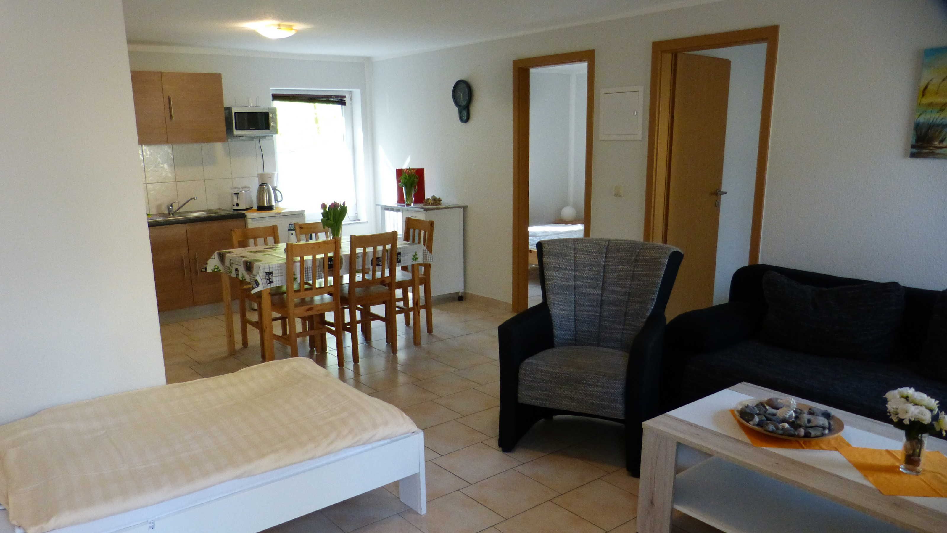 Die Ferienwohnung liegt im Erdgeschoß, hat eine Größe von 45 m² und verfügt über einen Wohnraum mit Pantry, zwei Schlafzimmer (mit je einem Doppelbett, ein Einzelbett zusätzlich im Wohnbereich), ein Badezimmer und eine Terrasse. Im Wohnzimmer ist zudem eine Aufbettung möglich (Schlafsofa). In der Miniküche befinden sich zwei Kochplatten, eine Kaffemaschine, ein Wasserkocher, ein Toaster, ein Kühlschrank mit Gefrierfach sowie eine Mikrowelle. Wäsche kann zugebucht werden ((Handtuch- Bettwäschepaket 25,00 pro Person). Im Ferienpark kann ein Grill gemietet werden, ebenso ist die Nutzung einer gemeinschaftlichen Waschmaschine möglich (gegen Gebühr).