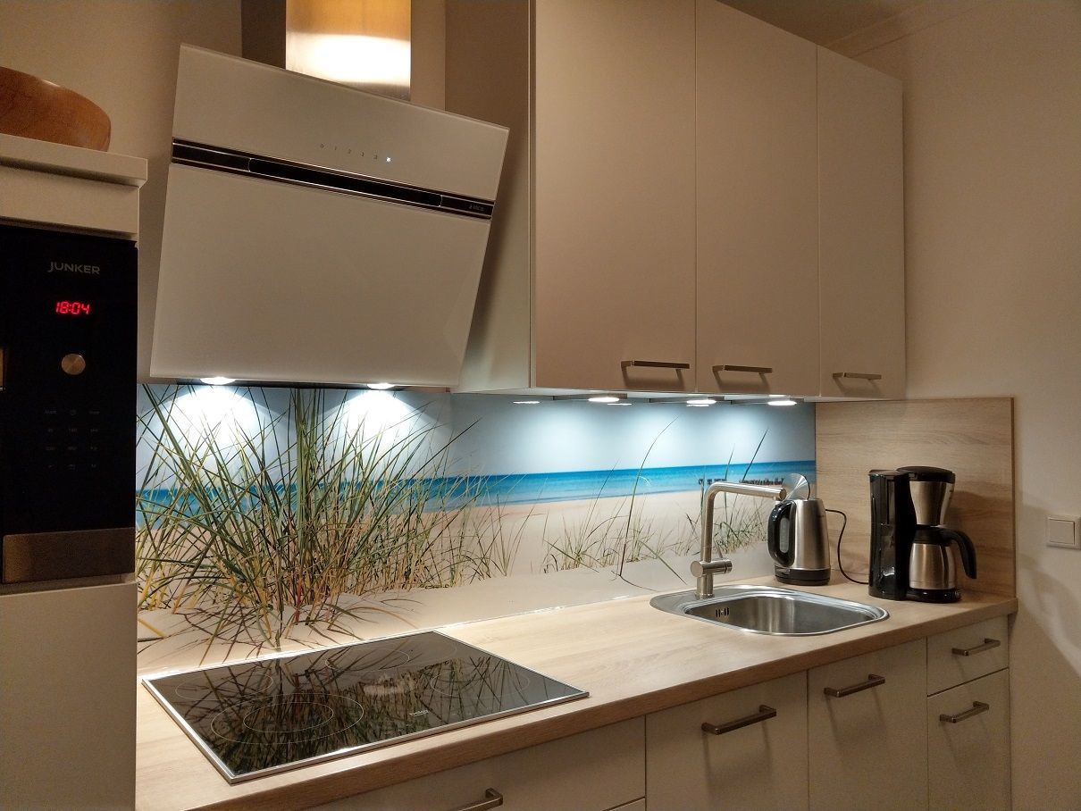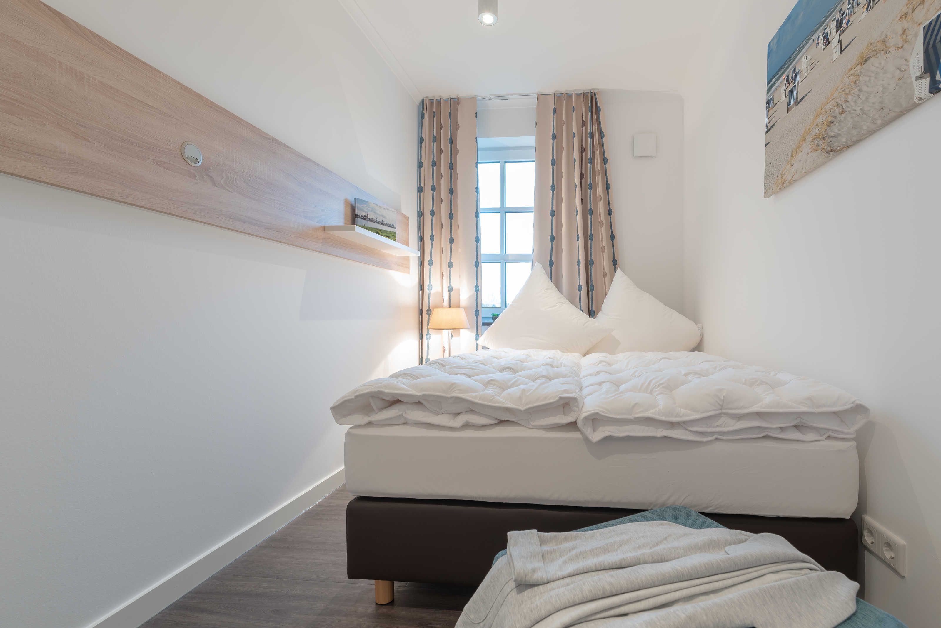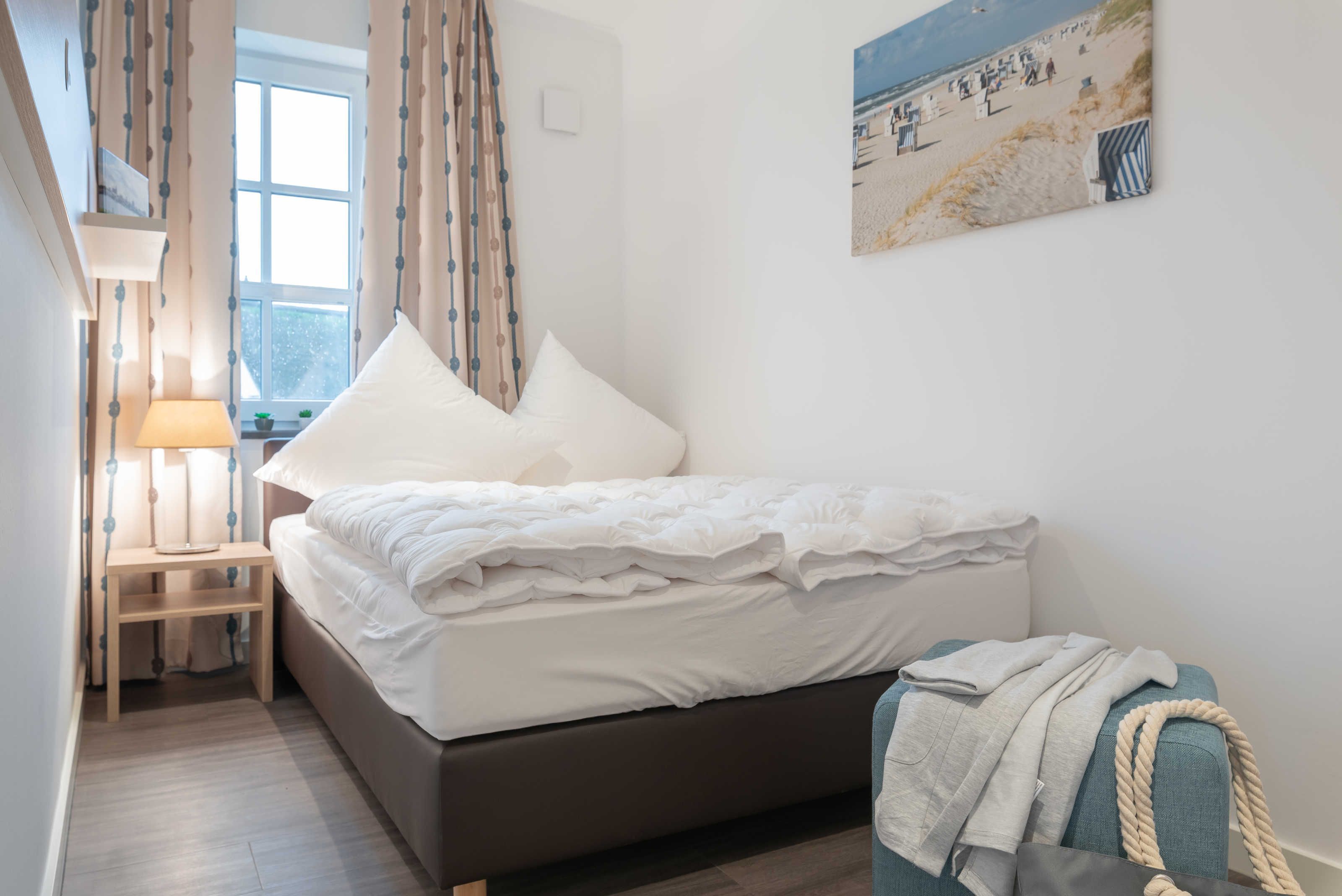 Die liebevoll eingerichtete 3-Zimmer-Ferienwohnung im ersten Obergeschoß bietet genug Platz für bis zu vier Personen. Genießen Sie die Morgensonne auf dem überdachten Balkon mit Ostseeblick. Ein Tisch mit vier Stühlen laden zum Entspannen und Verweilen ein. Der Wohnbereich mit Zugang zum Balkon ist hell und lichtdurchflutet. Das bequeme Sofa mit Schlaffunktion und Federkernmatratze (160 x 195 cm) wird ergänzt durch Sessel, Hocker, Flat-TV und DVD-Player. Die voll eingerichtete Einbauküche verfügt über einen Kühlschrank mit Tiefkühlfach, 4-Platten-glaskeramikkochfeld, Mikrowelle mit Grillfunktion, Geschirrspüler, Kaffeemaschine, Toaster und Wasserkocher. Der hölzerne Esstisch mit vier Stühlen ermöglicht gemütliche gemeinsame Mahlzeiten und ist bestens geeignet für gesellige Spieleabende. Das große Schlafzimmer empfängt Sie mit einem komfortablen Boxspringbett (180 x 200 / getrennten Matratzen), einem geräumigen Kleiderschrank und einem Flat-TV. Im zweiten Schlafzimmer befinden sich ebenfalls ein gemütliches Boxspringbett (140 x 200 cm) sowie ein weiterer Kleiderschrank. Beide Schlafzimmer sind mit Verdunklungsplissees und Verdunklungsgardinen ausgestattet. Die Zimmer bieten genug Platz für ein zugestelltes Kinderreisebett. Das helle Badezimmer mit bodengleicher Dusche verfügt über einen großen Waschtisch, eine Toilette, ein Ablageregal mit Haartrockner, einen Vergrößerungsspiegel, einen Hocker und ein Fenster - für frische Küstenluft. An kühlen Tagen sorgt die Fußbodenheizung für angenehme Wärme in allen Zimmern.