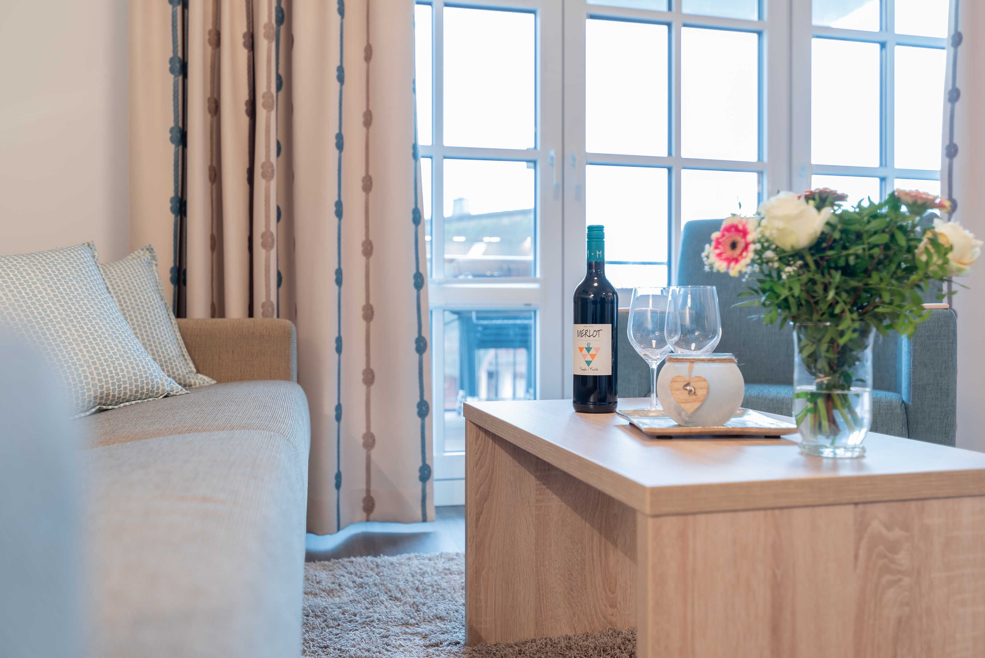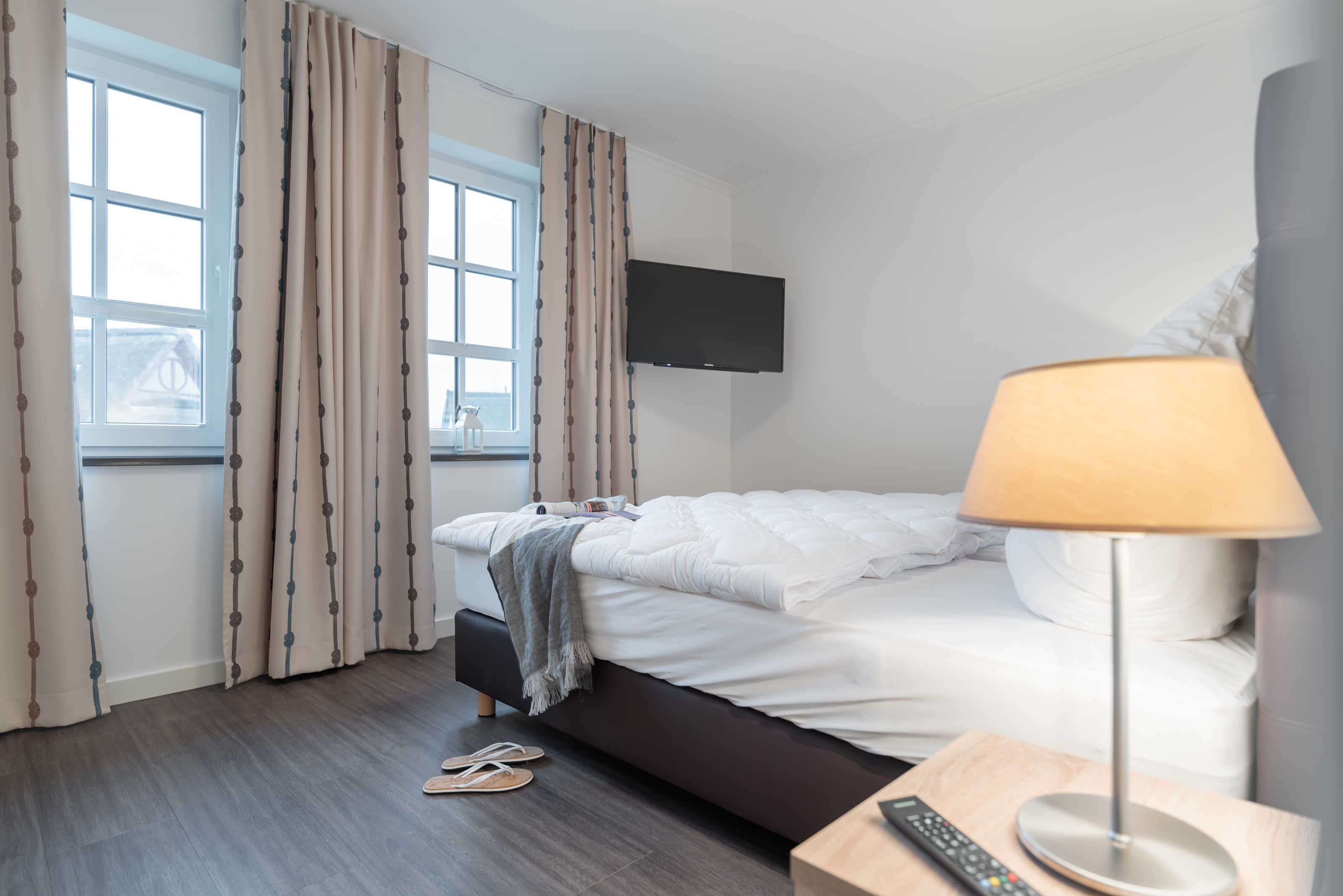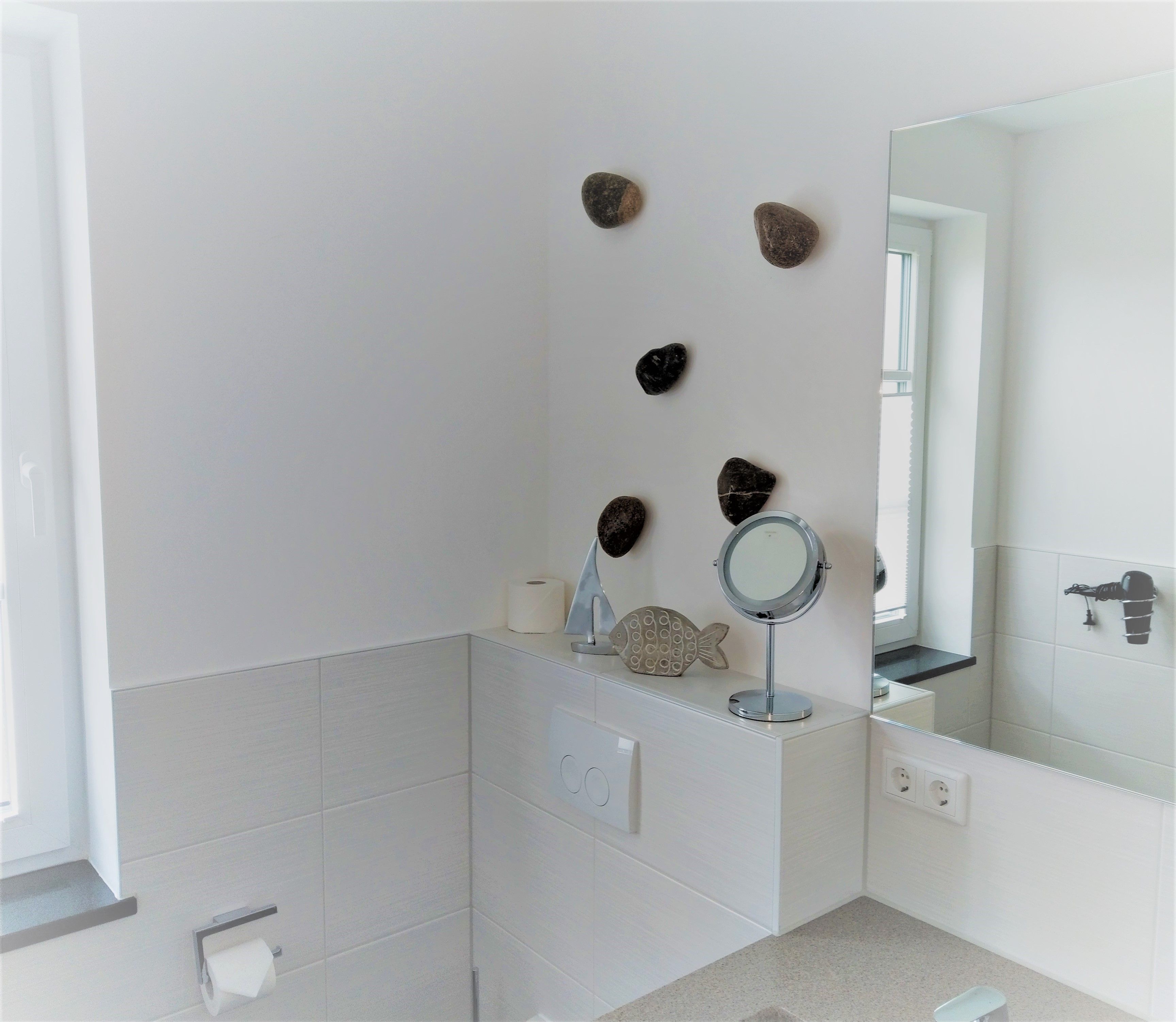 Die liebevoll eingerichtete 3-Zimmer-Ferienwohnung im ersten Obergeschoß bietet genug Platz für bis zu vier Personen. Genießen Sie die Morgensonne auf dem überdachten Balkon mit Ostseeblick. Ein Tisch mit vier Stühlen laden zum Entspannen und Verweilen ein. Der Wohnbereich mit Zugang zum Balkon ist hell und lichtdurchflutet. Das bequeme Sofa mit Schlaffunktion und Federkernmatratze (160 x 195 cm) wird ergänzt durch Sessel, Hocker, Flat-TV und DVD-Player. Die voll eingerichtete Einbauküche verfügt über einen Kühlschrank mit Tiefkühlfach, 4-Platten-glaskeramikkochfeld, Mikrowelle mit Grillfunktion, Geschirrspüler, Kaffeemaschine, Toaster und Wasserkocher. Der hölzerne Esstisch mit vier Stühlen ermöglicht gemütliche gemeinsame Mahlzeiten und ist bestens geeignet für gesellige Spieleabende. Das große Schlafzimmer empfängt Sie mit einem komfortablen Boxspringbett (180 x 200 / getrennten Matratzen), einem geräumigen Kleiderschrank und einem Flat-TV. Im zweiten Schlafzimmer befinden sich ebenfalls ein gemütliches Boxspringbett (140 x 200 cm) sowie ein weiterer Kleiderschrank. Beide Schlafzimmer sind mit Verdunklungsplissees und Verdunklungsgardinen ausgestattet. Die Zimmer bieten genug Platz für ein zugestelltes Kinderreisebett. Das helle Badezimmer mit bodengleicher Dusche verfügt über einen großen Waschtisch, eine Toilette, ein Ablageregal mit Haartrockner, einen Vergrößerungsspiegel, einen Hocker und ein Fenster - für frische Küstenluft. An kühlen Tagen sorgt die Fußbodenheizung für angenehme Wärme in allen Zimmern.