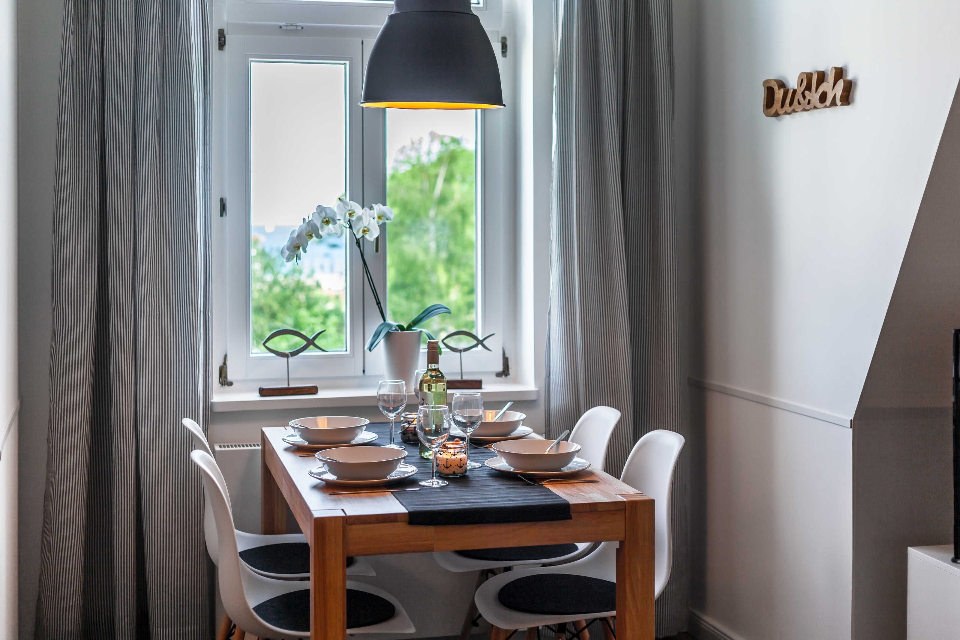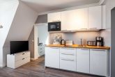 Nur 150 m vom Strand wohnen Sie in einer 2-Raum-Ferienwohnung. Die 38 qm große Wohnung liegt in der 2. Etage. Das Wohnzimmer ist mit einer Couch, Couchtisch, Sessel, Anrichte, mit Kabel-TV, Radio, Essbereich (Tisch und Stühle) und Küchenzeile ausgestattet. Der Balkon mit Tisch und Stühle geht zur Nordseite. Im Schlafzimmer stehen ein Doppelbett und ein Kleiderschrank. Die Küchenzeile wurde ausgestattet mit Mikrowelle, Kühlschrank, Kaffeemaschine, Ceran-Kochfeld, Geschirrspüler, Toaster und Wasserkocher. Das Bad mit ebenerdiger Dusche und WC komplettiert die Wohnung.