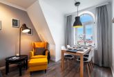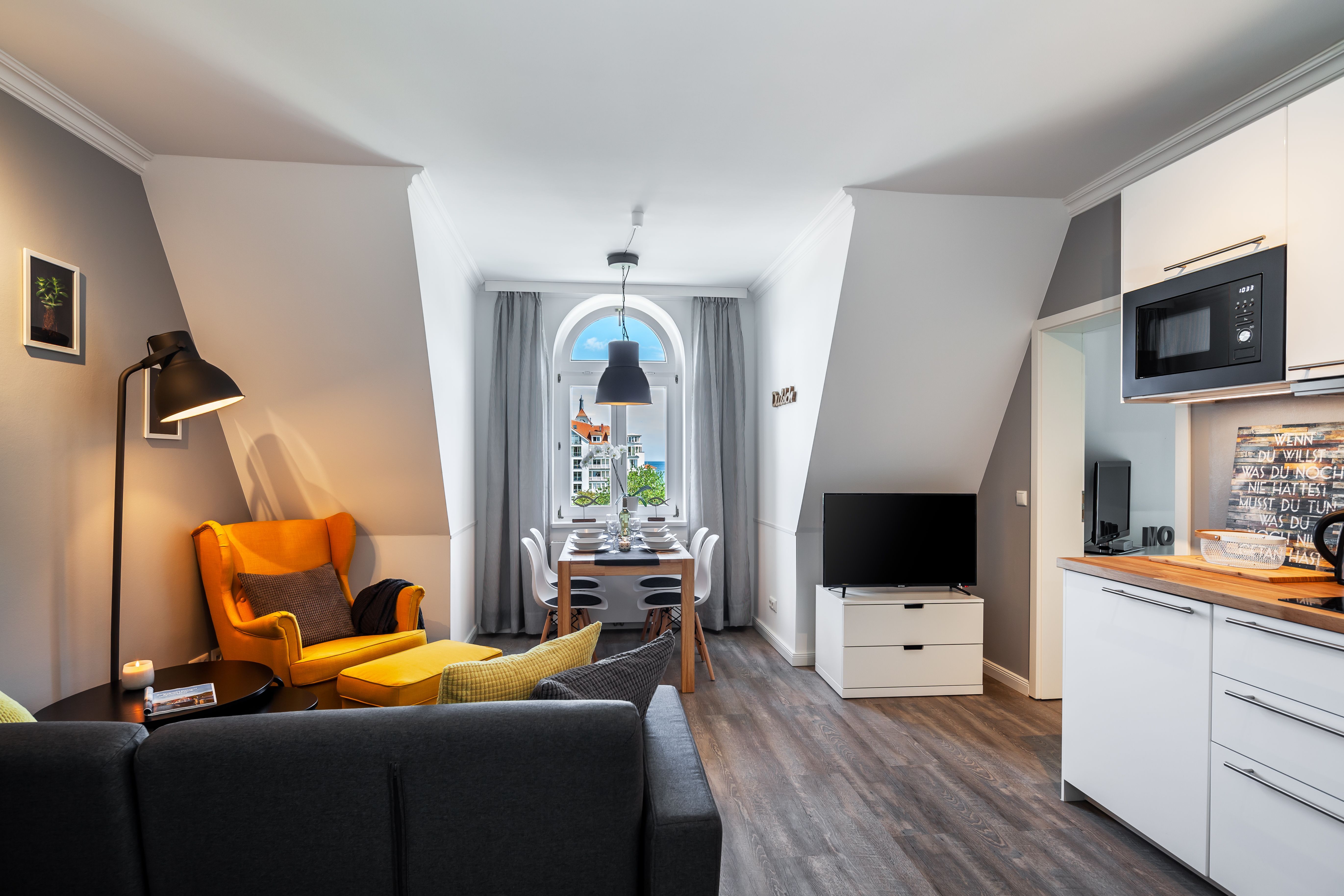 Dieses 2-Raum-Appartement strahlt einen ganz besonderen Charme aus. Die Küchenzeile ist mit hochwertigen Geräten wie, Geschirrspüler, E-Herd, Kühlschrank, Mikrowelle, Kaffeemaschine