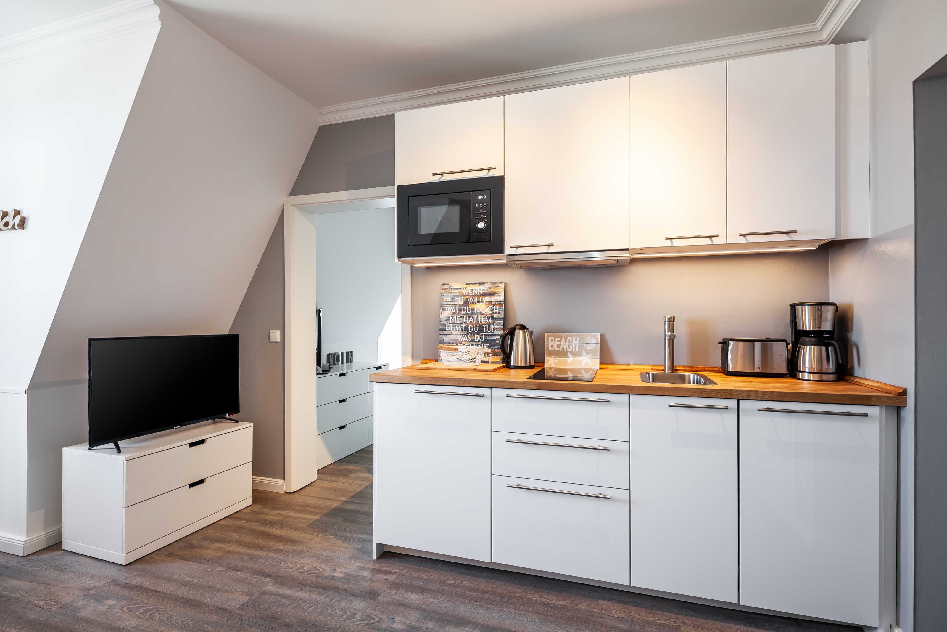 Küchenzeile mit Mikrowelle, Zweiplattenceranfeld, Kühlschrank mit Gefrierfach, Kaffeemaschine, Geschirrspüler