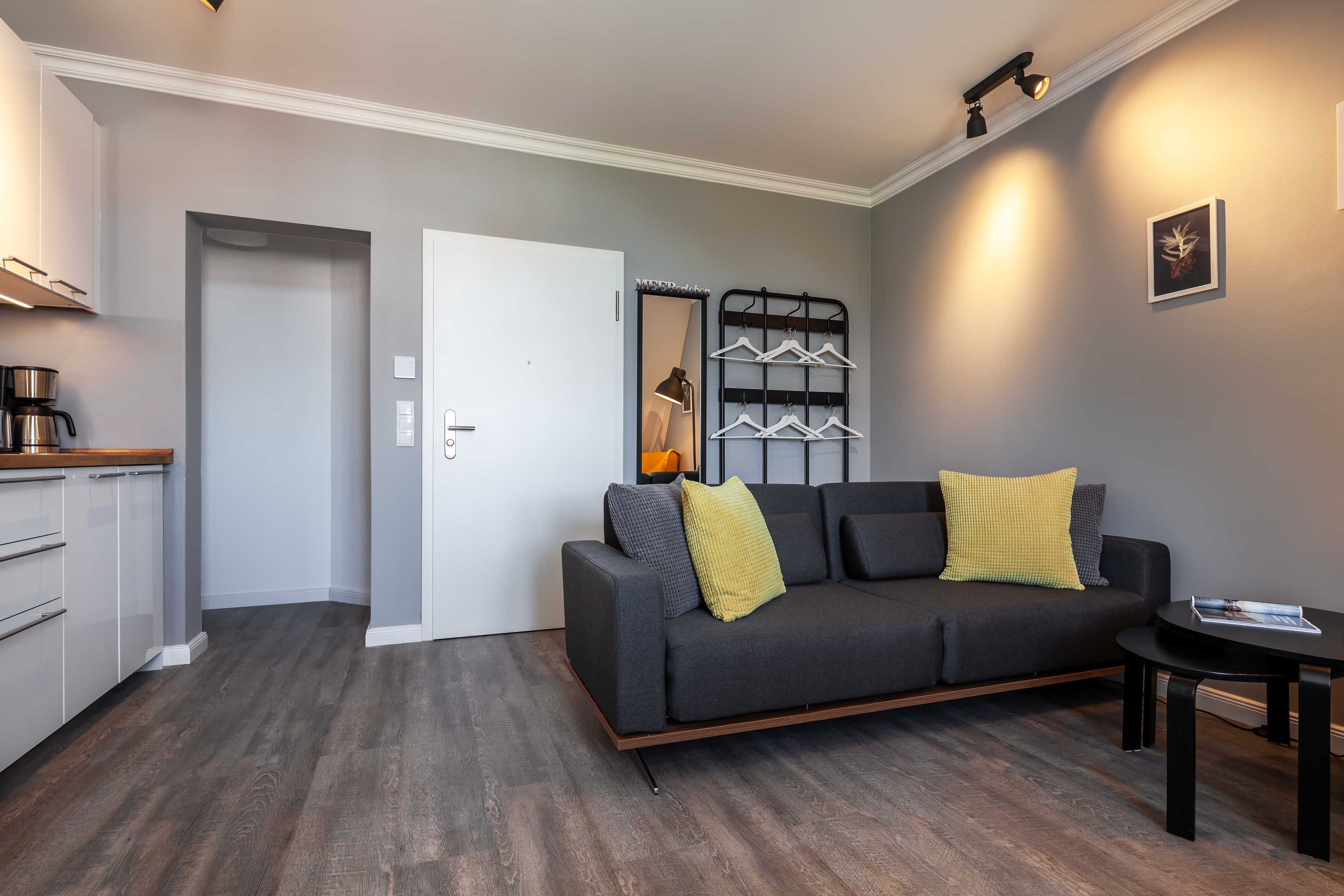Wohnzimmer mit Schlafcouch, Esstisch, Küchenzeile, Kabel-TV, Radio und passwortgeschütztem WLan