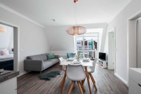 Dieses 3 Raum-Appartement strahlt einen ganz besonderen Charme aus. Die Küchenzeile ist mit hochwertigen Geräten wie, Geschirrspüler, E-Herd, Kühlschrank, Mikrowelle, Kaffeemaschine, Wasserkocher, Toaster und div. Geschirr ausgestattet. Ein luxeriöses Bad mit ebenerdiger Dusche und ein 2.Bad mit WC und Waschbecken, der Balkon zur Südseite komplettieren den hervorragenden Gesamteindruck der Wohnung.