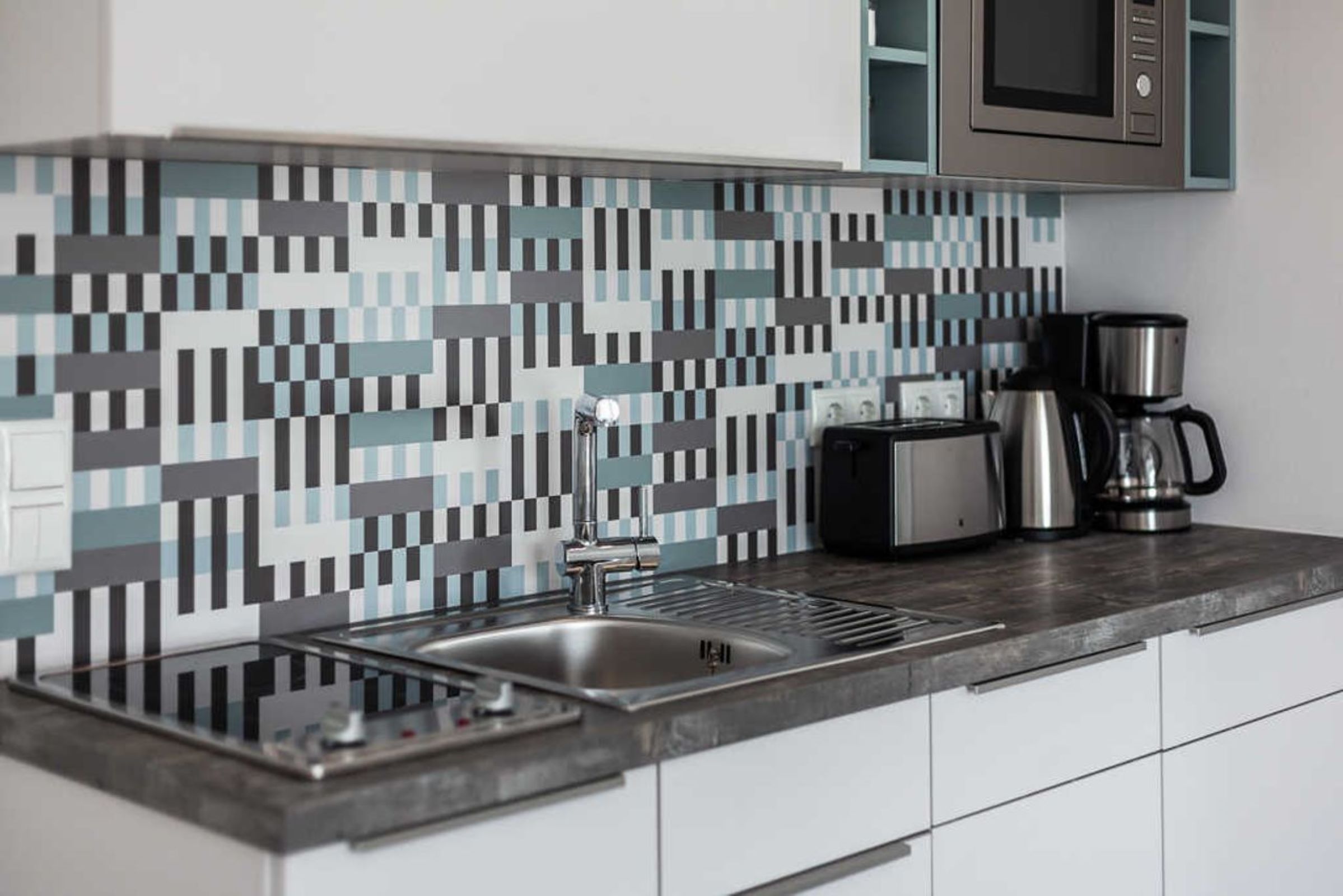 Küchenzeile mit Mikrowelle, Zweiplattenceranfeld, Kühlschrank mit Gefrierfach, Kaffeemaschine, Wasserkocher, Toaster, Geschirrspüler