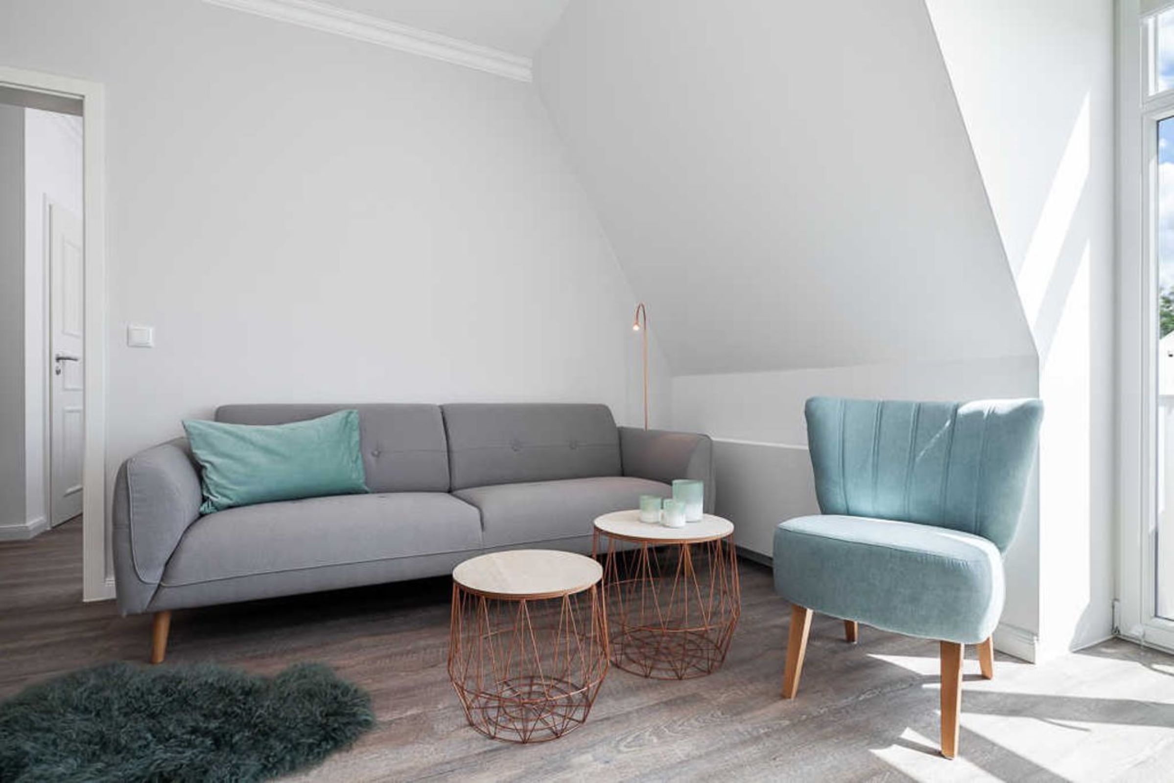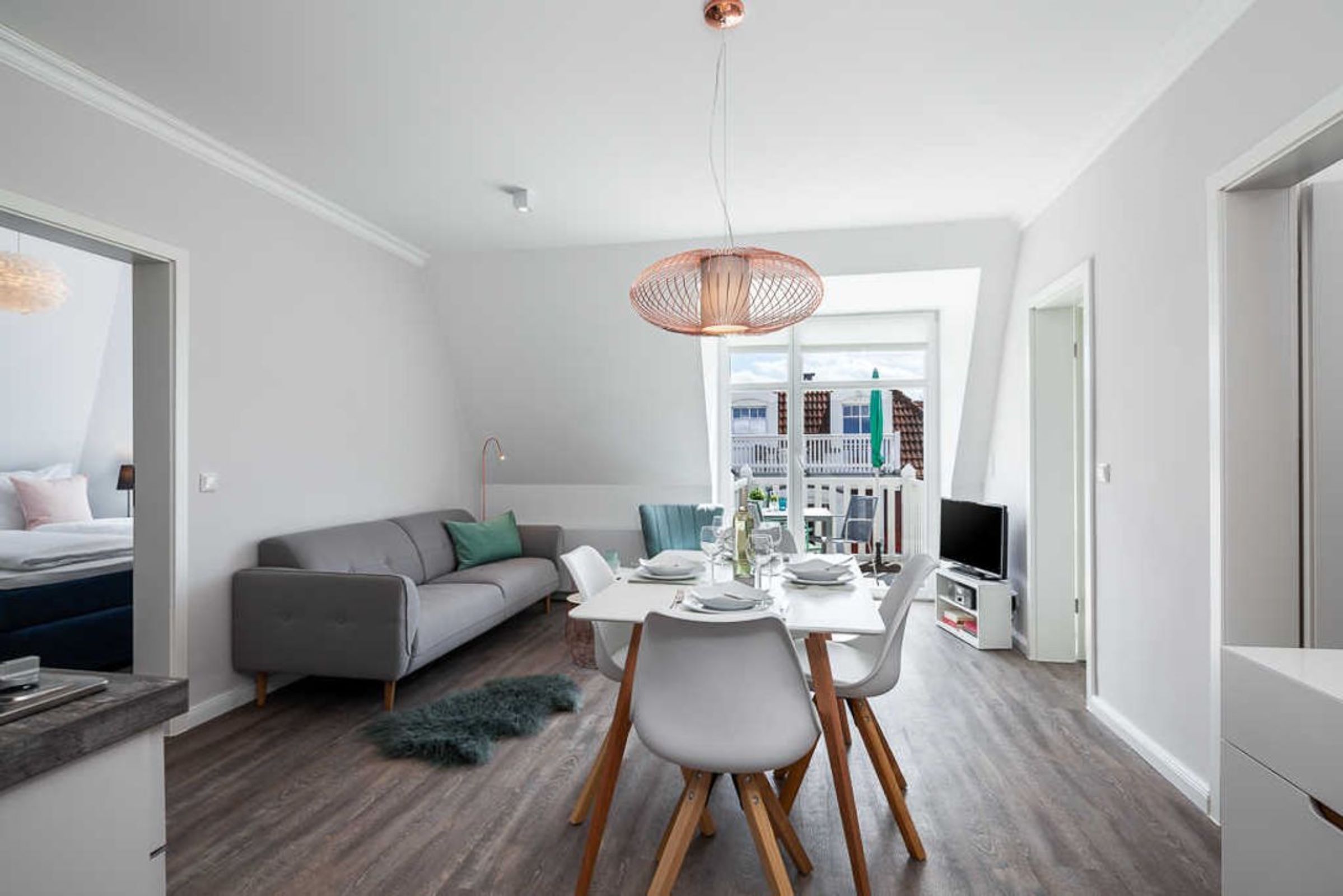 Nur 150 m vom Strand wohnen Sie in einer 3-Raum-Ferienwohnung. Die 42 qm große Wohnung liegt in der 2. Etage. Das Wohnzimmer ist mit einer Couch, Couchtisch, Sessel, Anrichte, mit Kabel-TV, Radio, Essbereich (Tisch und Stühle) und Küchenzeile ausgestattet. Der Balkon mit Tisch und Stühle geht zur Südseite. Im Schlafzimmer stehen ein Doppelbett und ein Kleiderschrank. Die Küchenzeile wurde ausgestattet mit Mikrowelle, Kühlschrank, Kaffeemaschine, Ceran-Kochfeld, Geschirrspüler, Toaster und Wasserkocher. Das Bad mit Dusche und WC komplettiert die Wohnung.