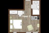 Die 17 qm große Ferienwohnung 2 für maximal 2 Personen befindet sich im Dachgeschoss auf der Südwestseite. Das kombinierte Wohn-, Schlaf- und Esszimmer mit Kochnische verfügt über ein 180 cm breites Doppelbett; durch das großzügige Dachfenster fällt tagsüber viel Licht herein. Die Pantryküche ist funktional ausgestattet. Das kuschelige Apartment bietet sich an als praktischer Ausgangspunkt für lange Strandtage, Ausflüge oder Aktivitäten auf der Insel. Ideal ist die Ferienwohnung für zwei Personen, Alleinreisende oder Alleinerziehende mit Kind.