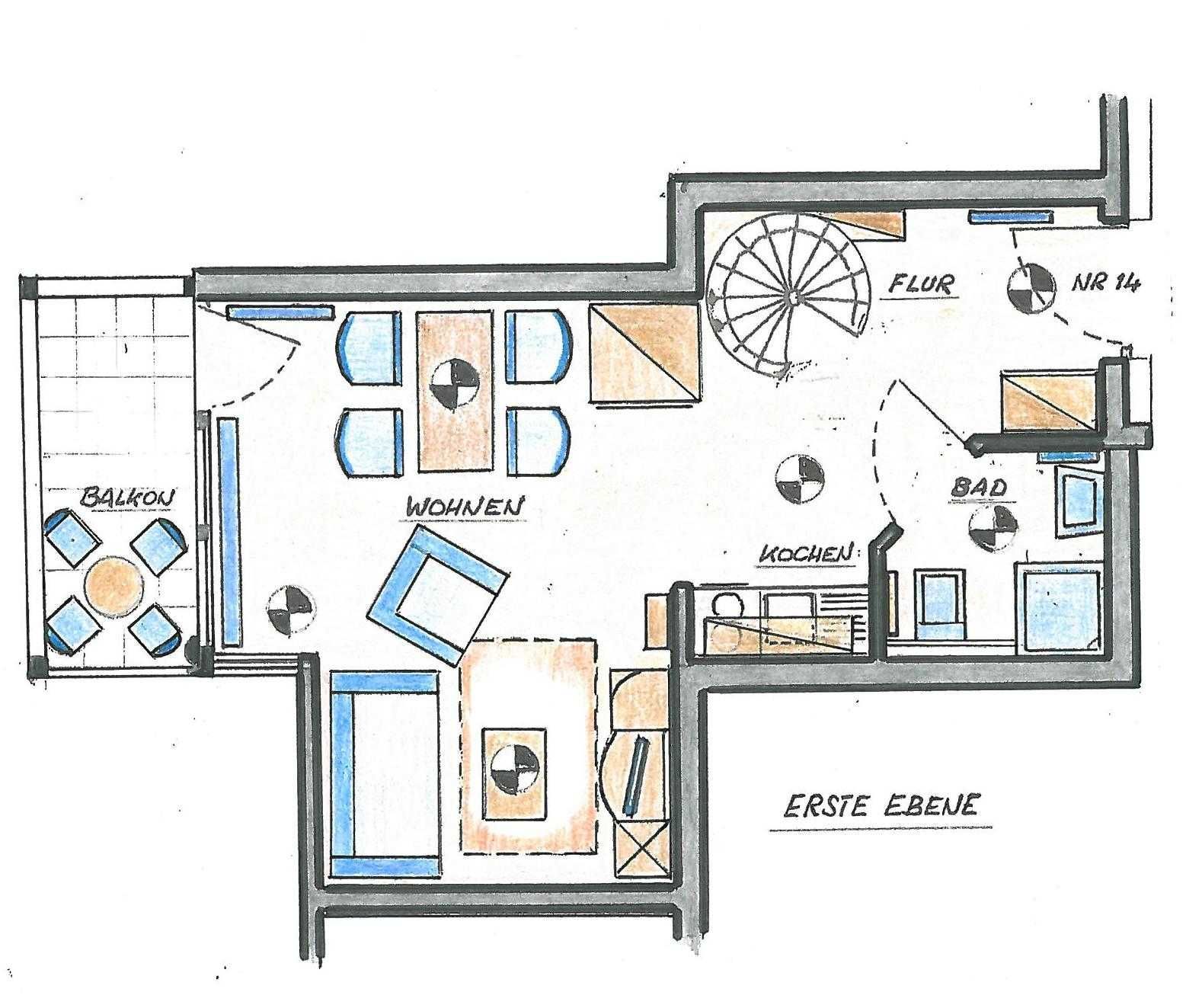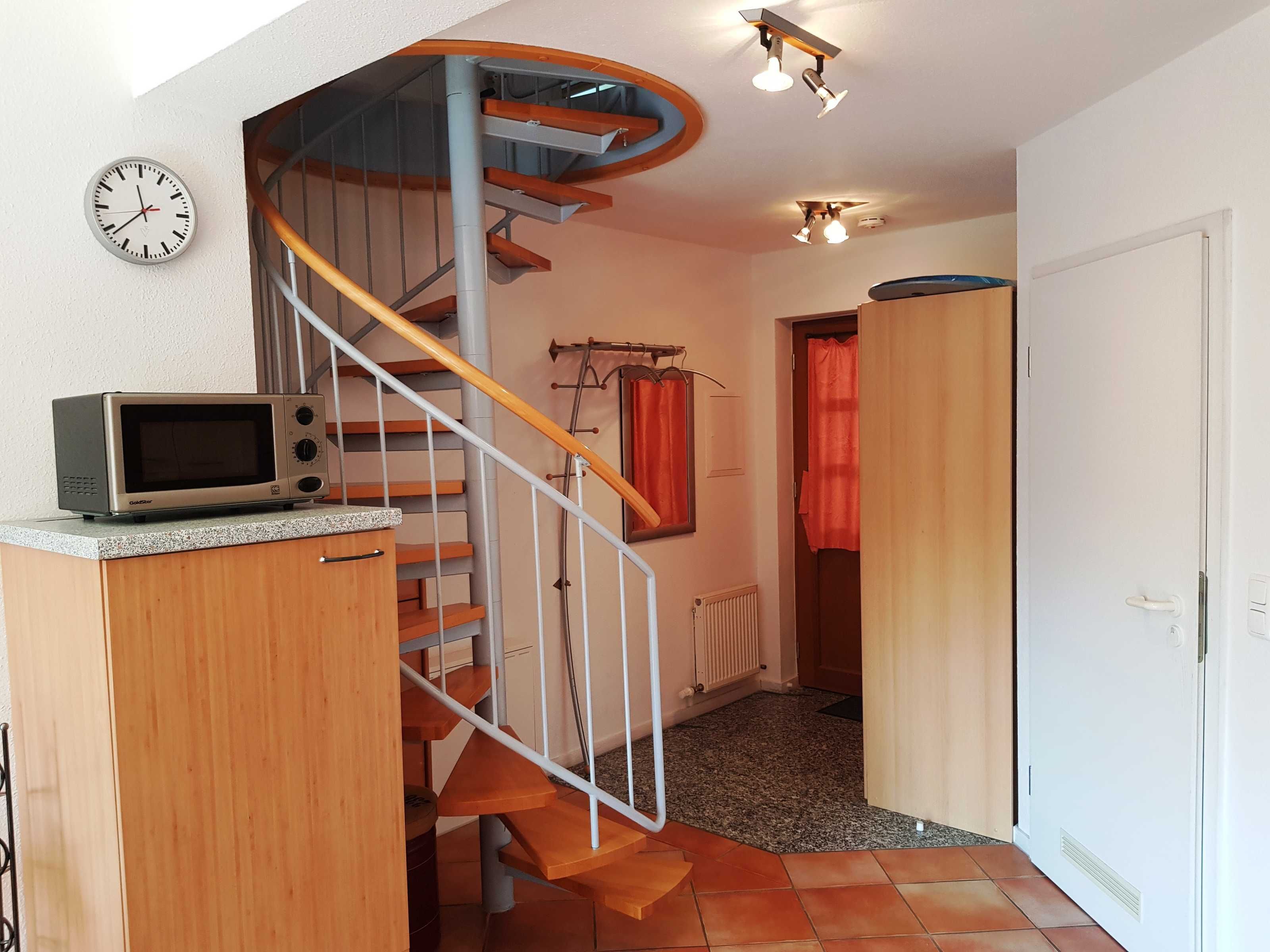 In der Maisonettenwohnug erreichen sie das Schlafzimmer und das Kinderzimmer über eine Wendeltreppe.