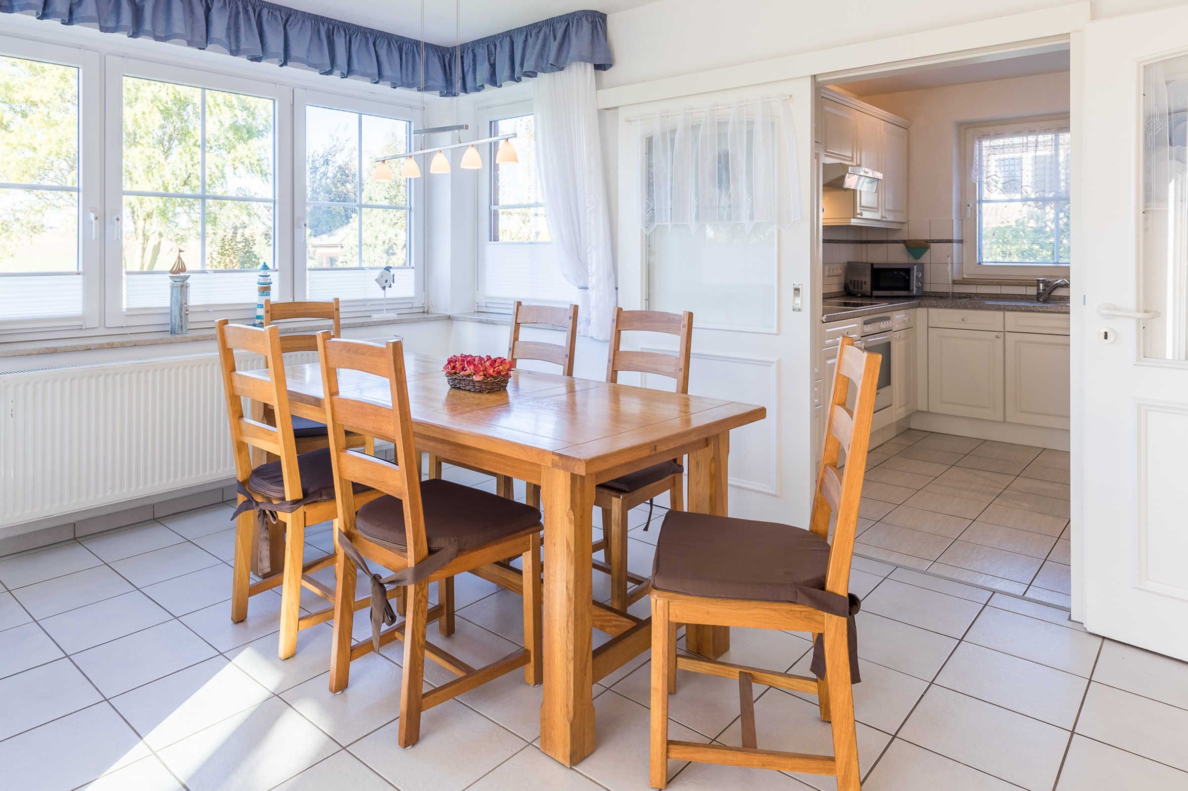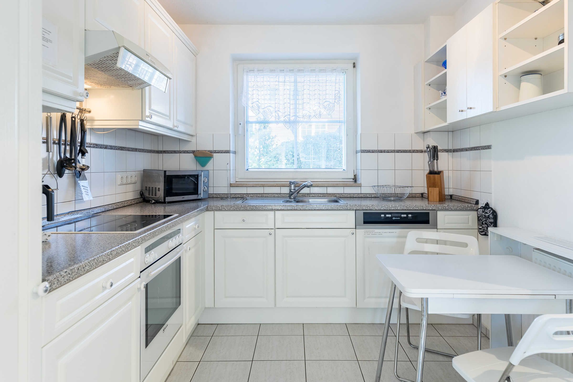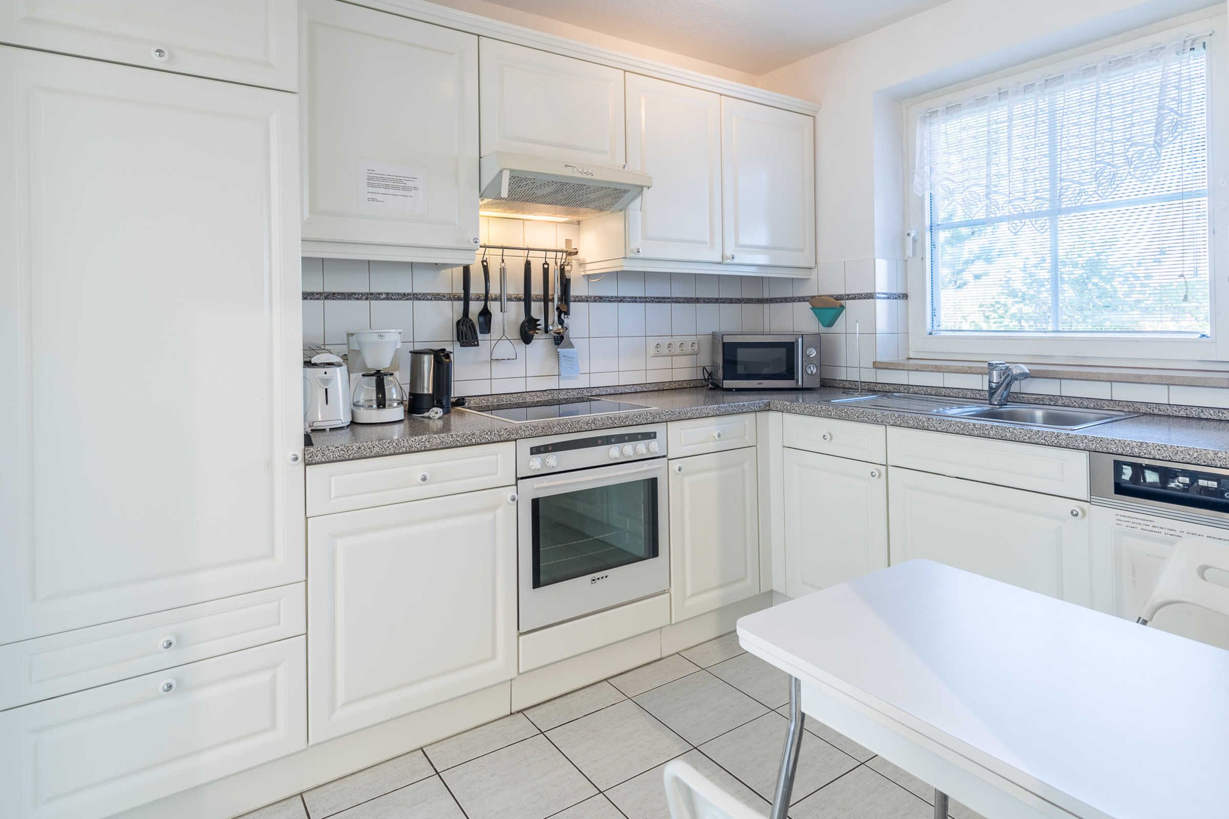 Die weiße Küche im Landhausstil ist mit allen Annehmlichkeiten und nützlichen Gerätschaften komplett ausgestattet. Am großen Esstisch finden 6 Personen Platz, bei Bedarf kann der Tisch noch vergrößert werden.