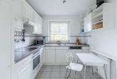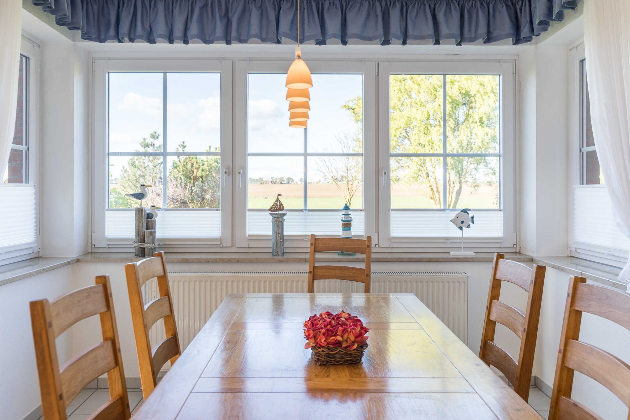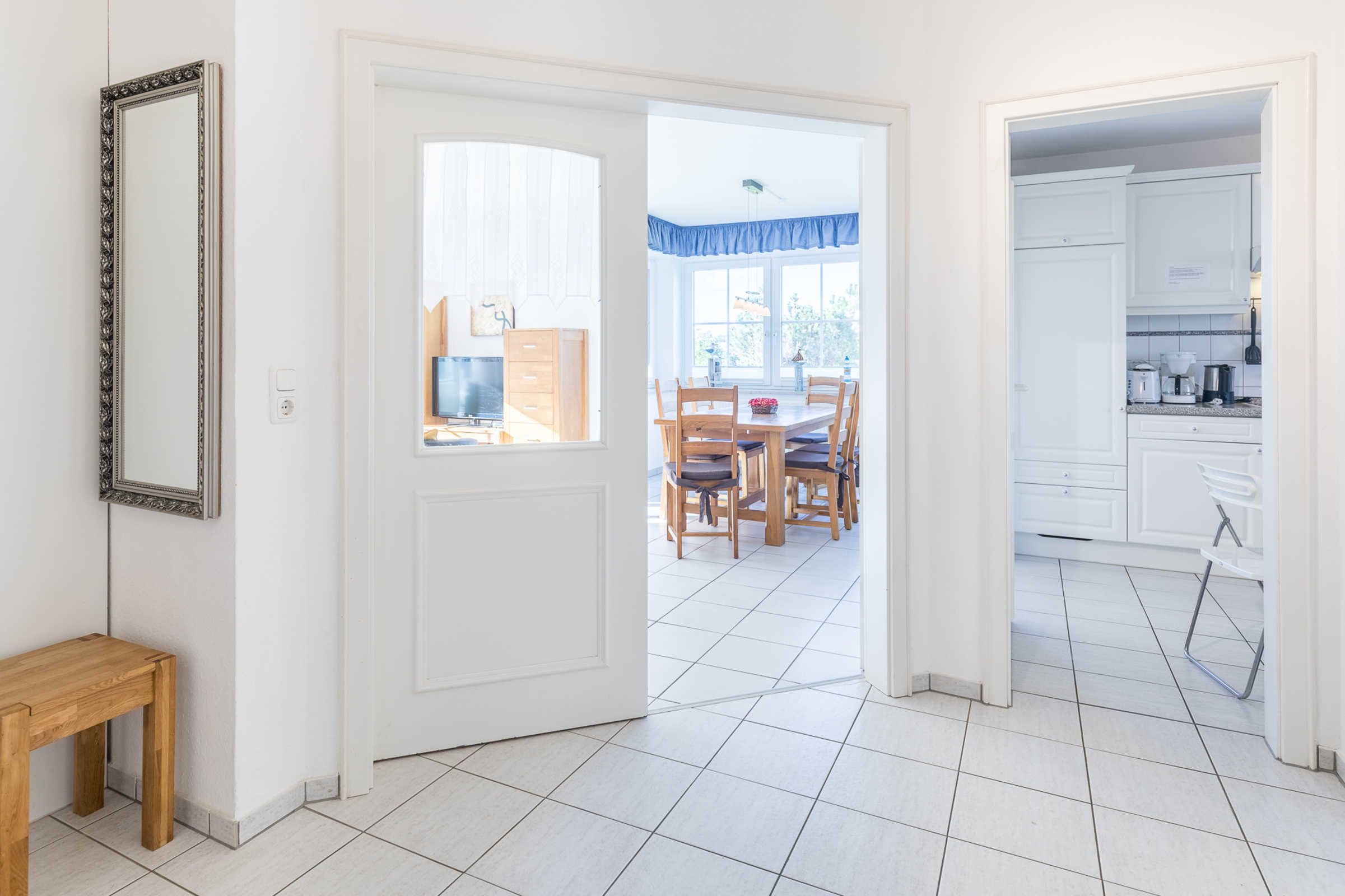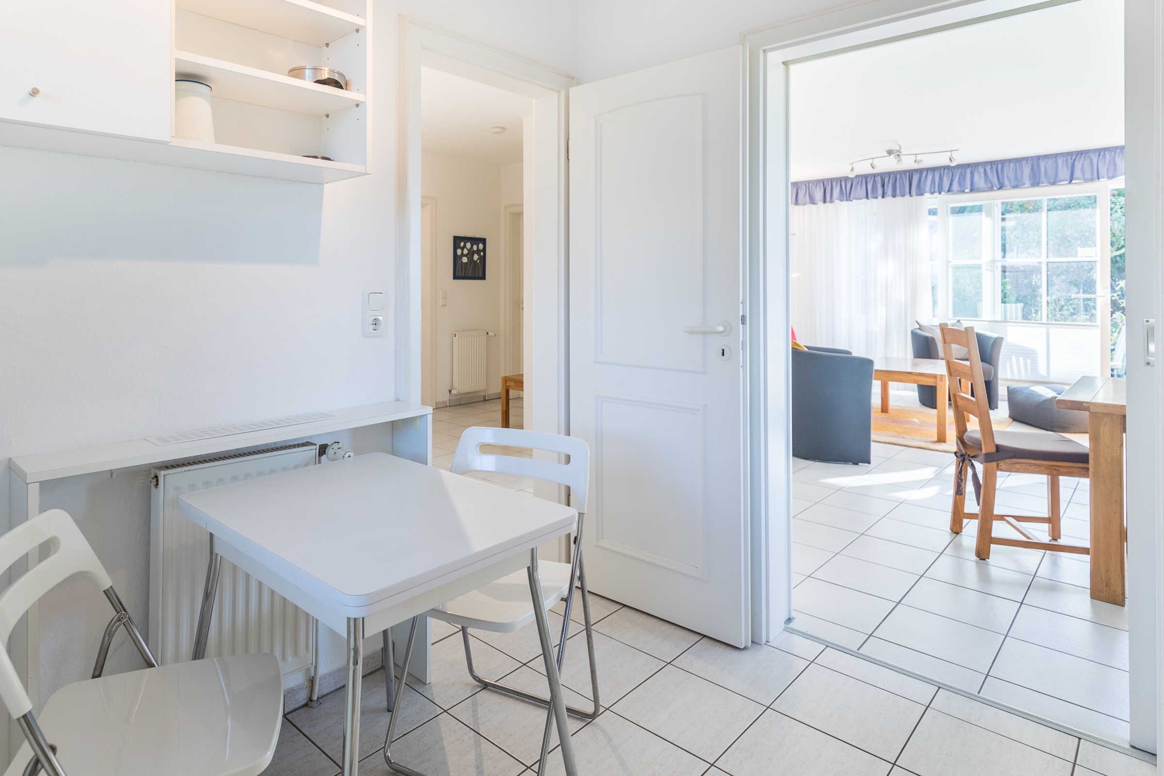 Die weiße Küche im Landhausstil ist mit allen Annehmlichkeiten und nützlichen Gerätschaften komplett ausgestattet. Am großen Esstisch finden 6 Personen Platz, bei Bedarf kann der Tisch noch vergrößert werden.