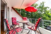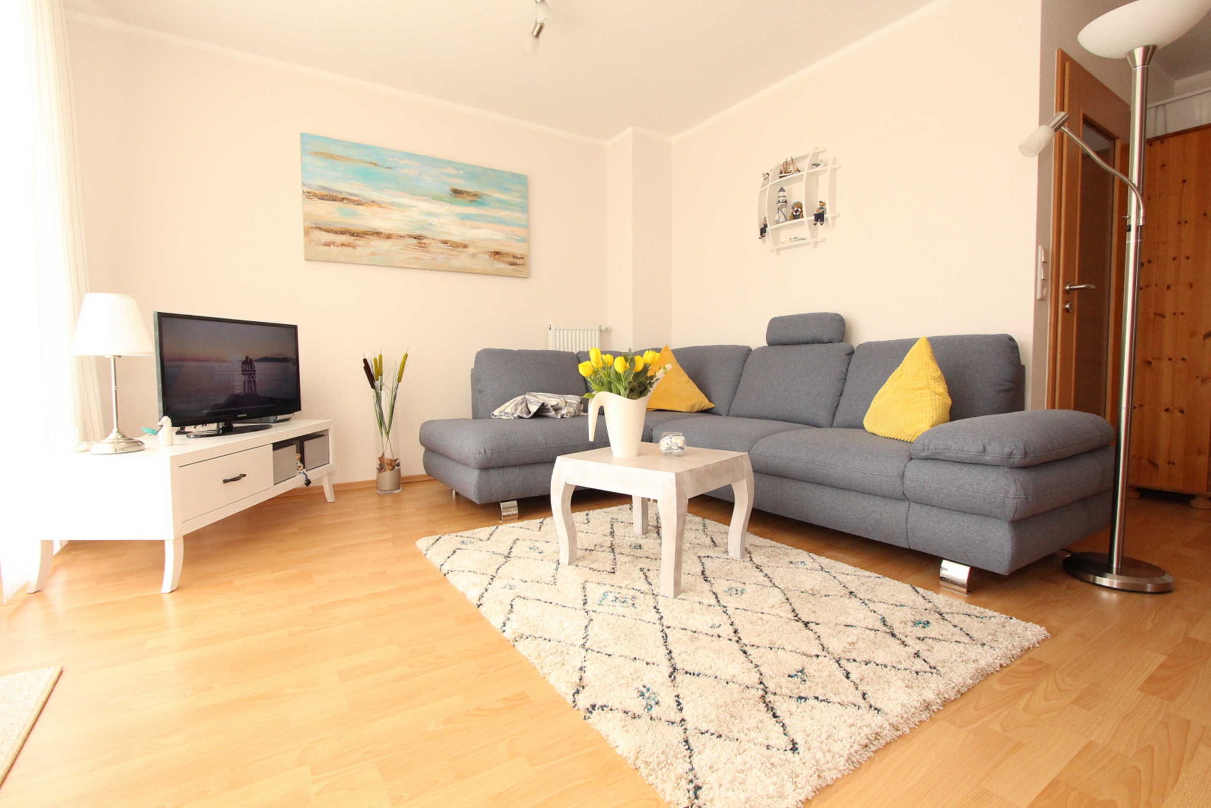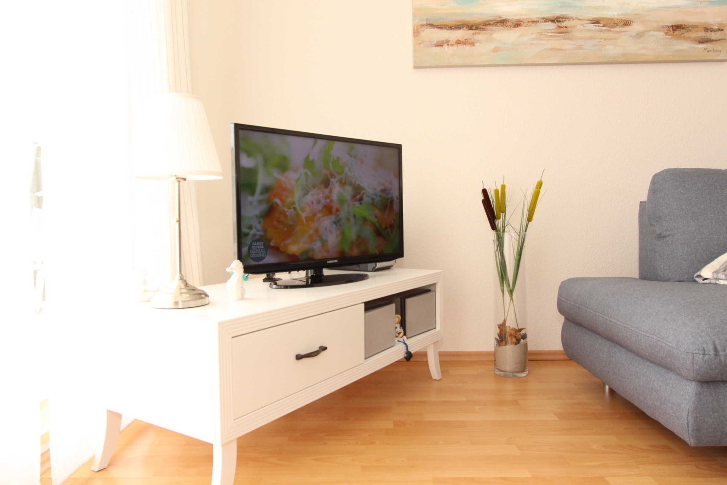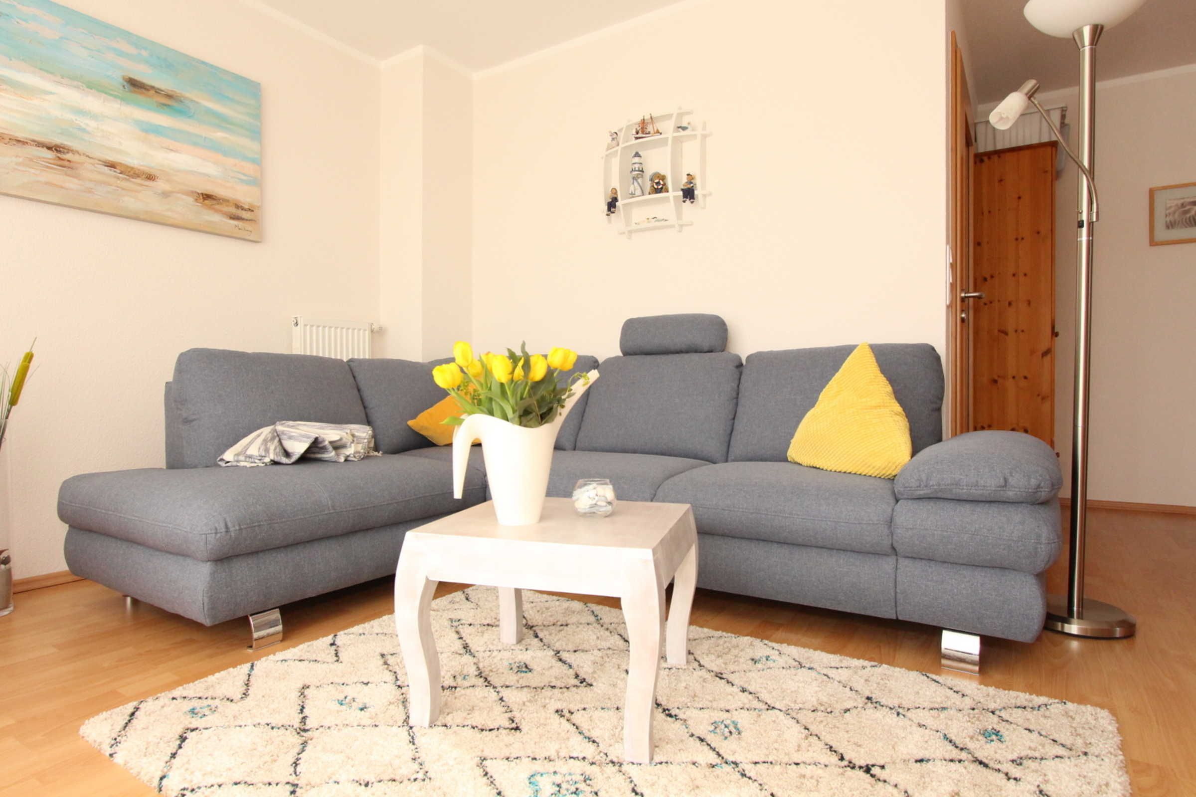In der 1. Wohnebene (2.OG) finden sich ein behagliches Wohnzimmer mit direktem Zugang zum möblierten Südbalkon. Machen Sie es sich auf der großen Couch bequem und nutzen Sie gern den Flatscreen-TV (Sat), DVD-Player, kleine Musikanlage sowie diverse Gesellschaftsspiele und Bücher zur Unterhaltung.