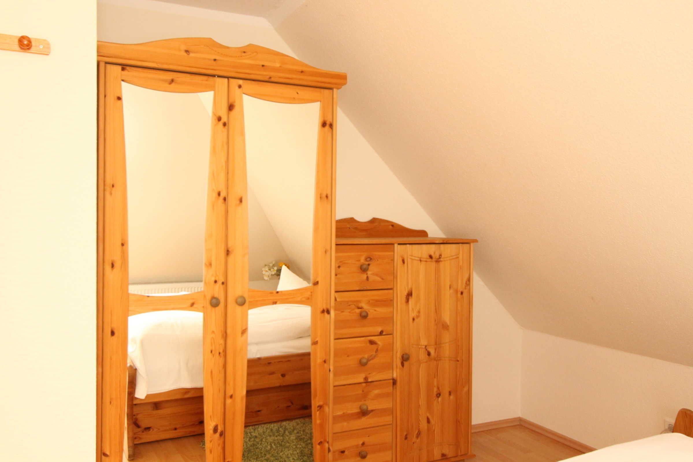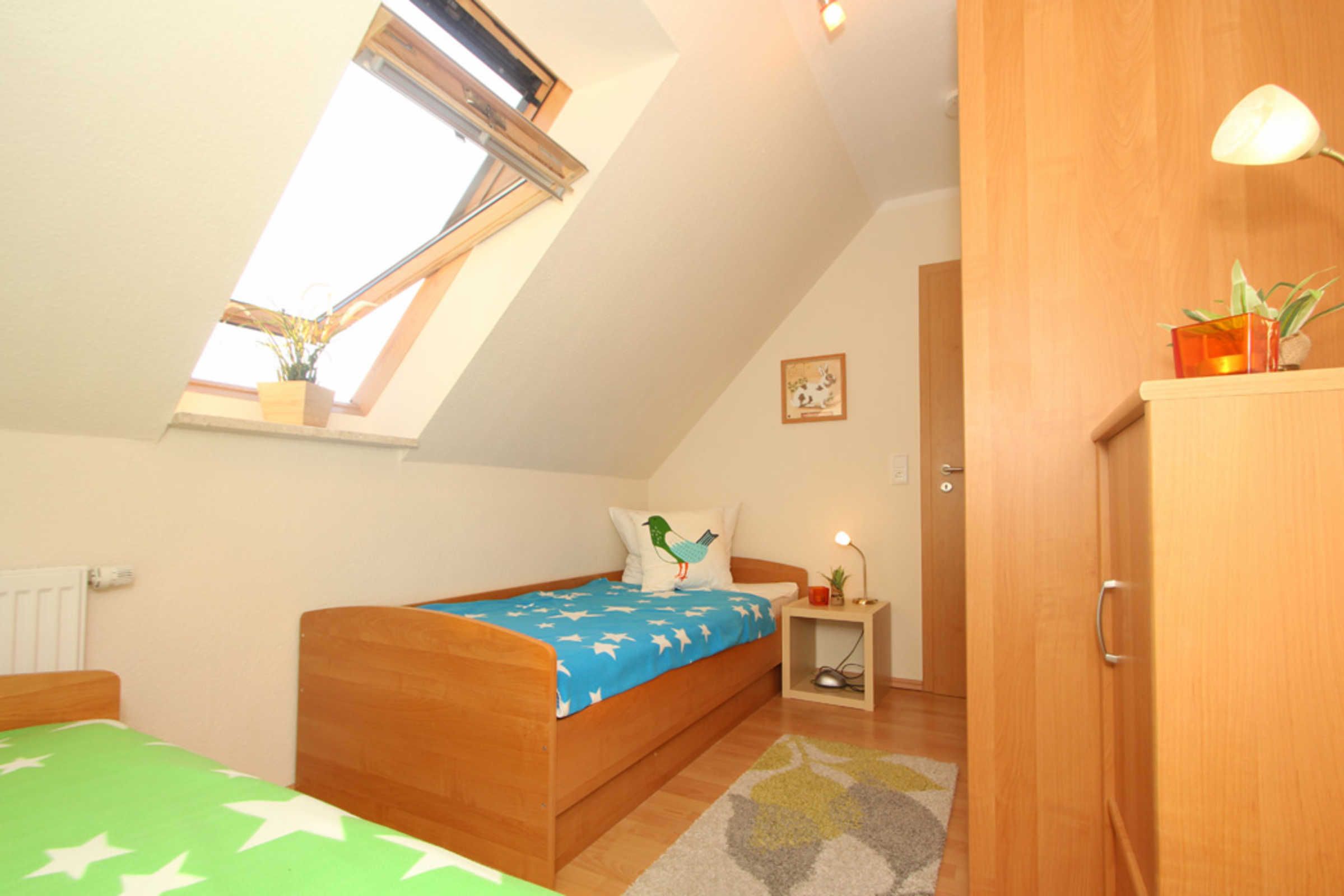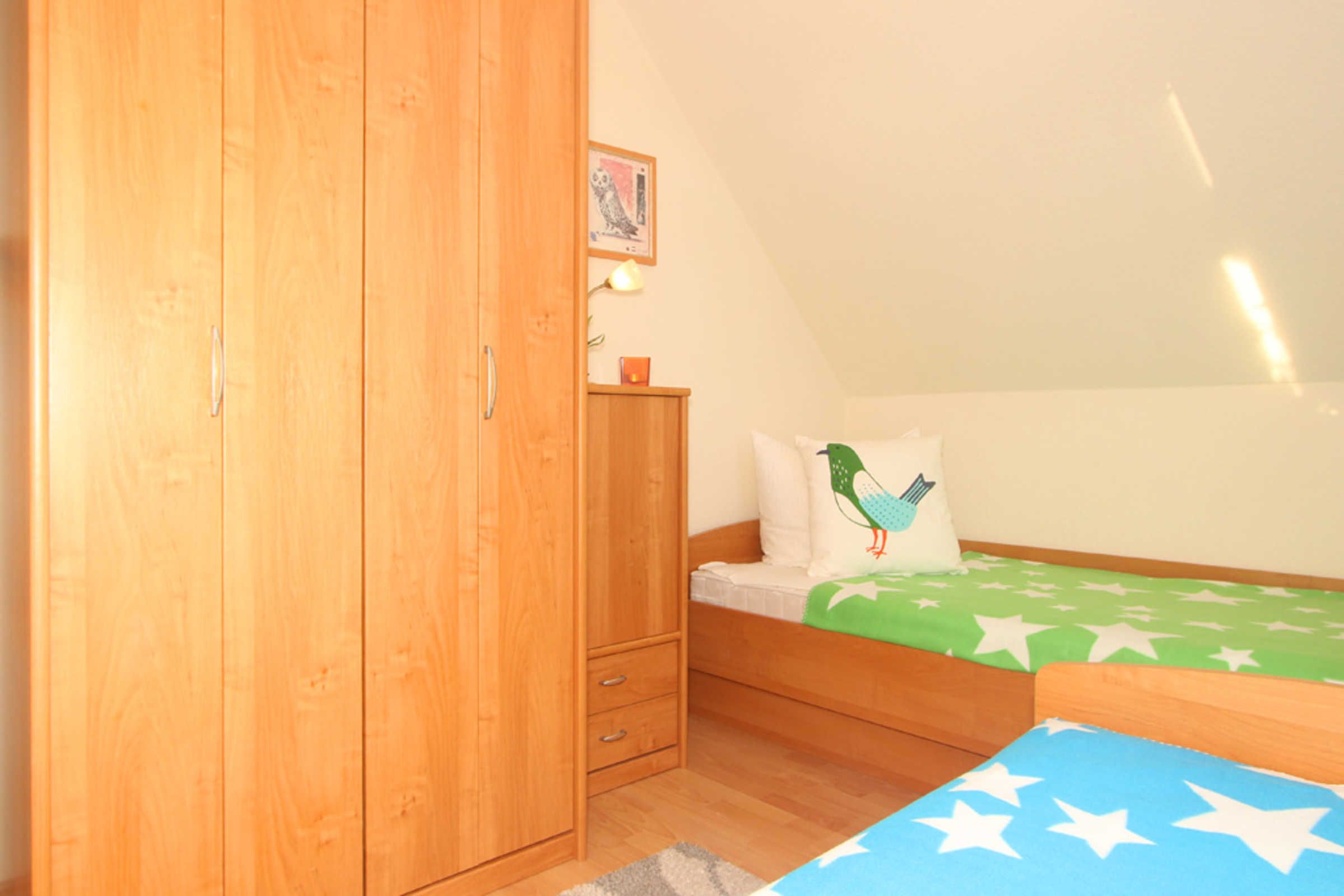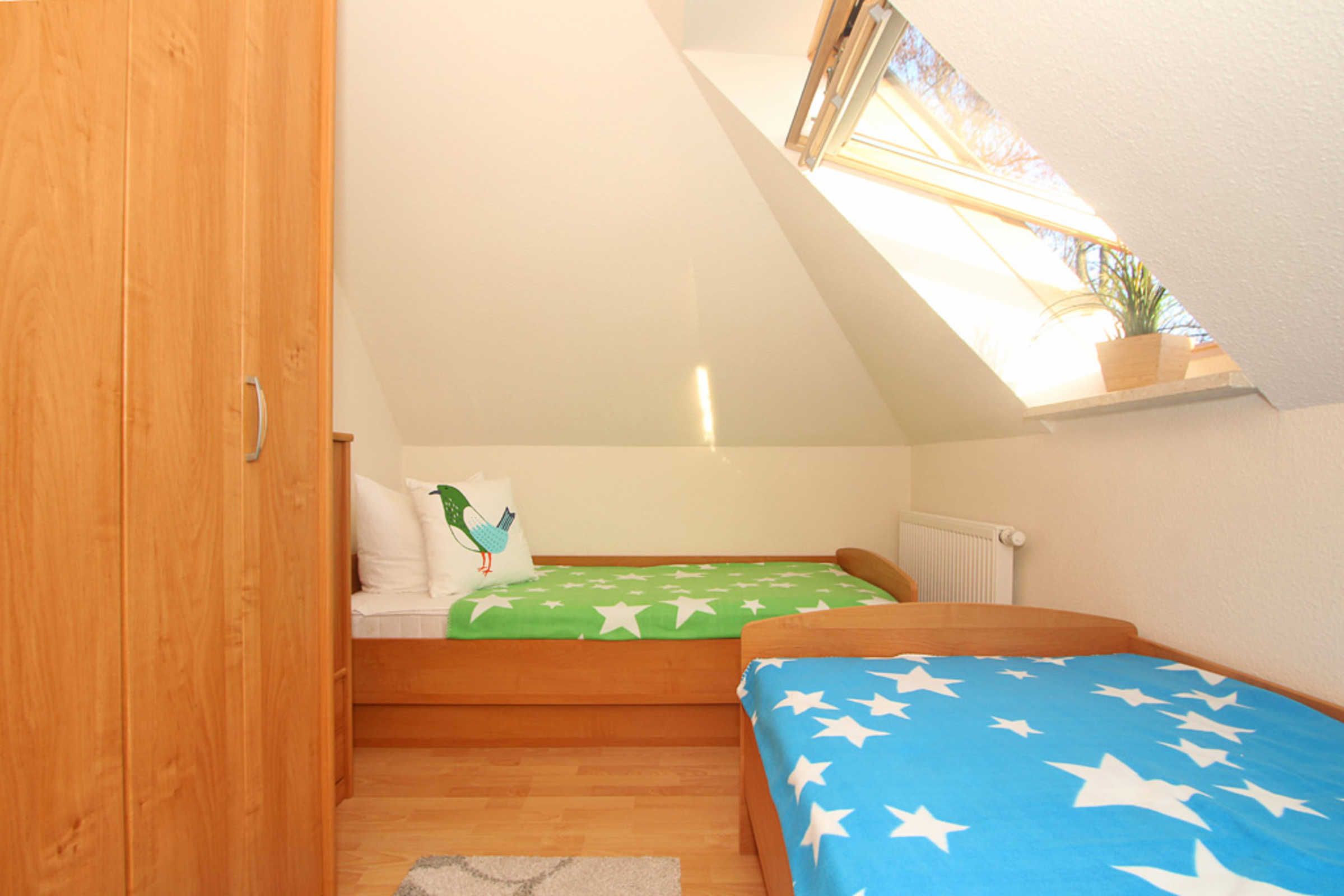 Das Gäste-/ Kinderzimmer auf dieser Etage ist mit zwei bequemen Einzelbetten (je 90x200cm/ Höhe 56cm) eingerichtet, auch Ablagemöglichkeiten für Ihre Kleidung sind hier vorhanden.