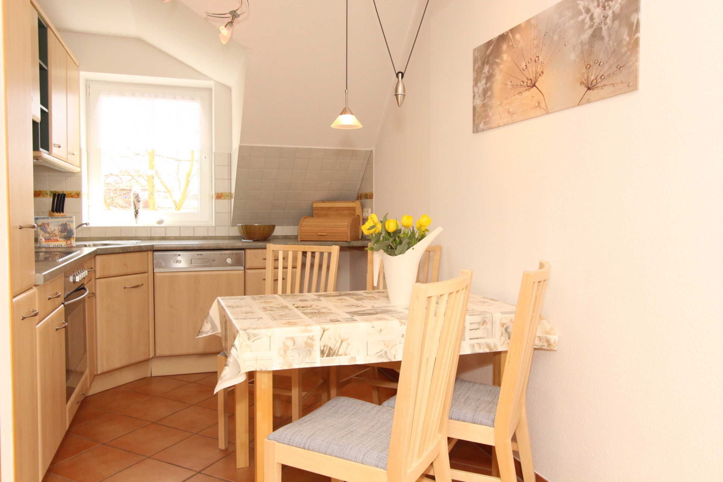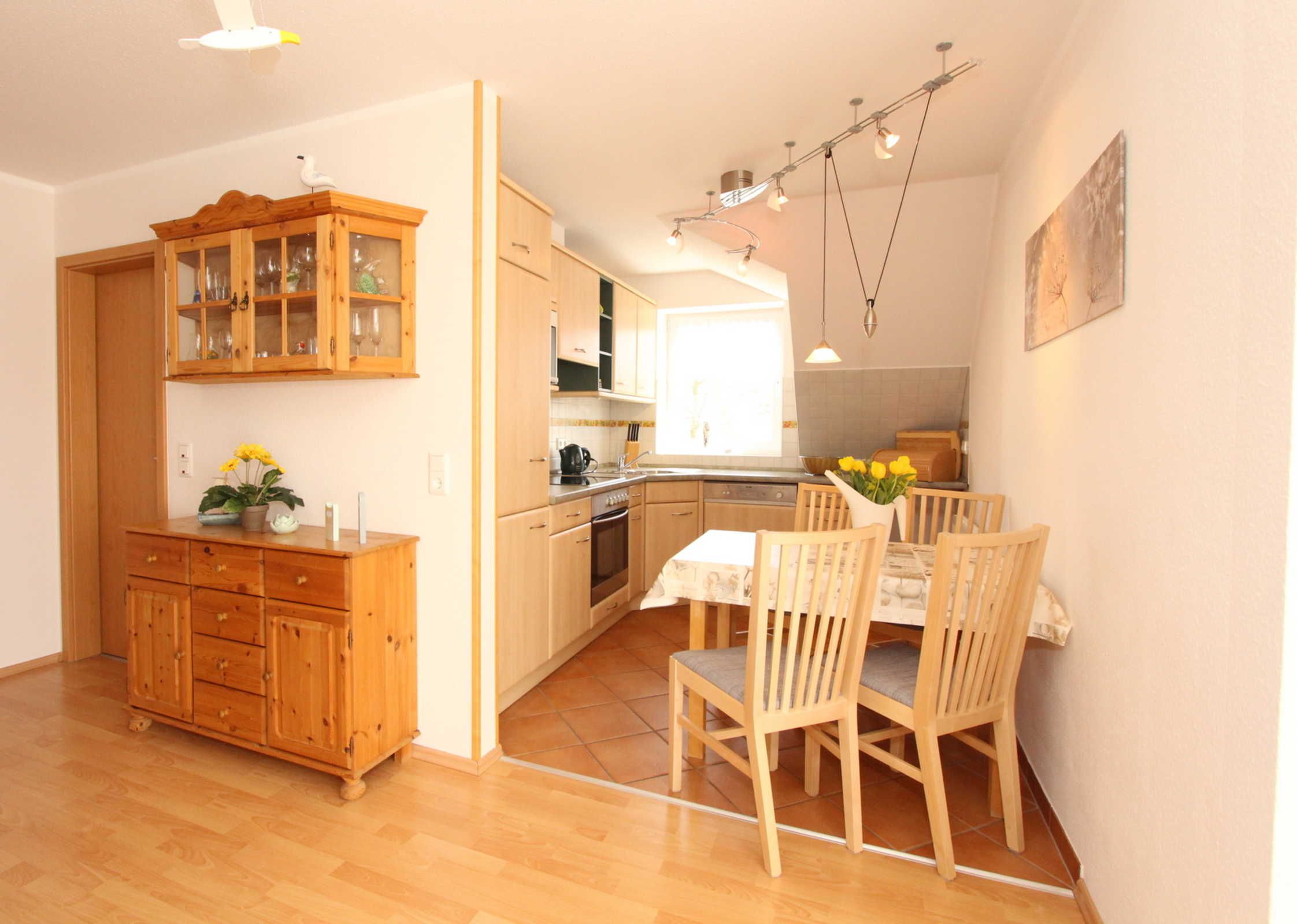 Die komfortabel ausgestattete, offene Wohnküche bietet eine sehr gute Ausstattung für Ihre Selbstverpflegung. Die Mahlzeiten können Sie gern gemeinsam an der separaten Essecke einnehmen.