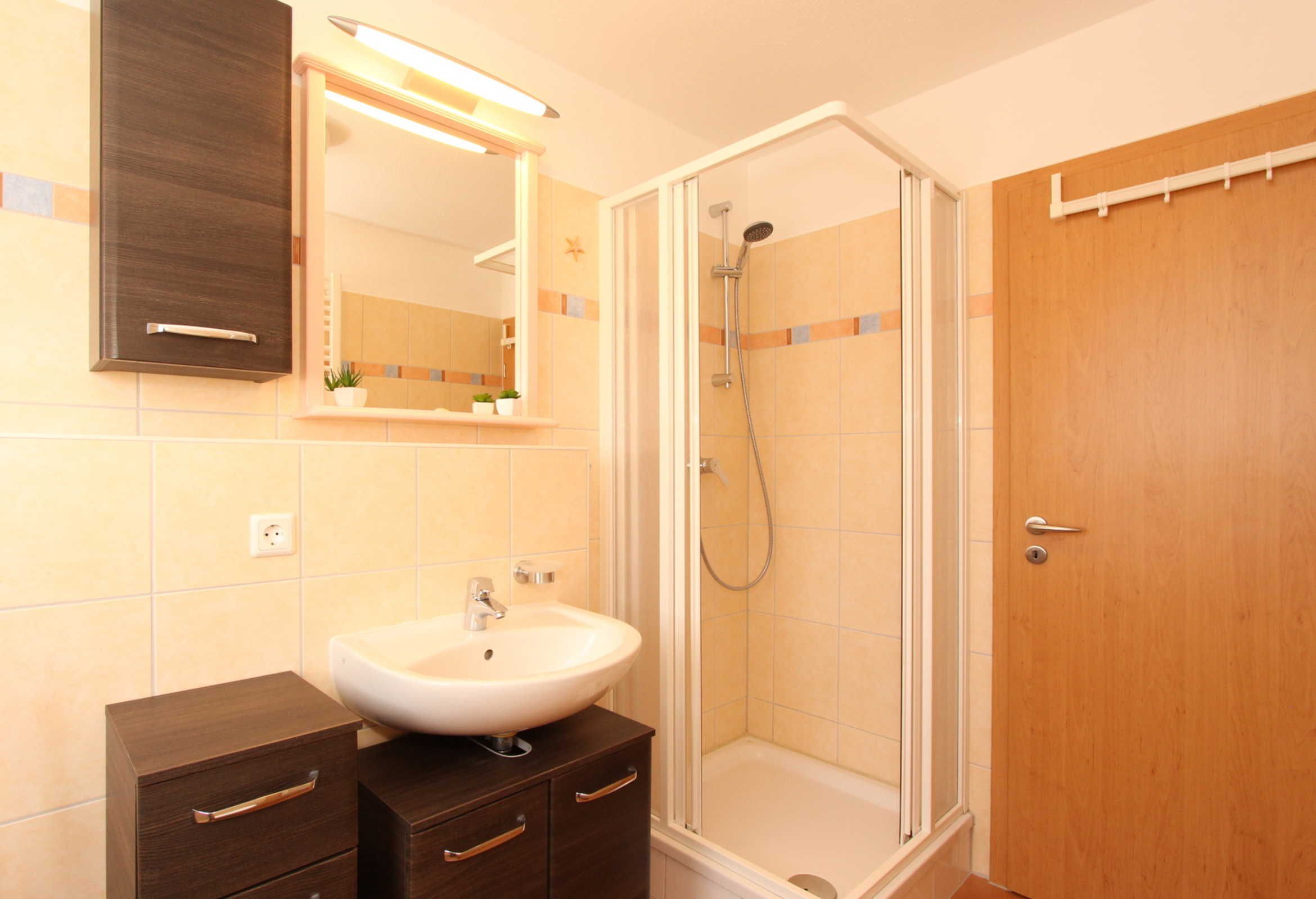 Weiterhin finden Sie im unteren Bereich dieser Nichtraucherwohnung ein modernes Badezimmer mit Dusche und WC. Das Fenster sorgt für schönes Tageslicht und hilft beim Lüften nach dem Duschen. Eine Handtuchheizung sorgt hier auf Wunsch für mollig warme Frotteewäsche.