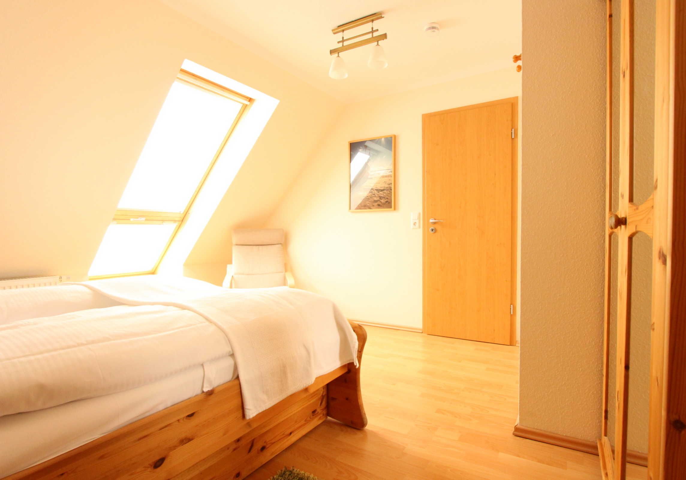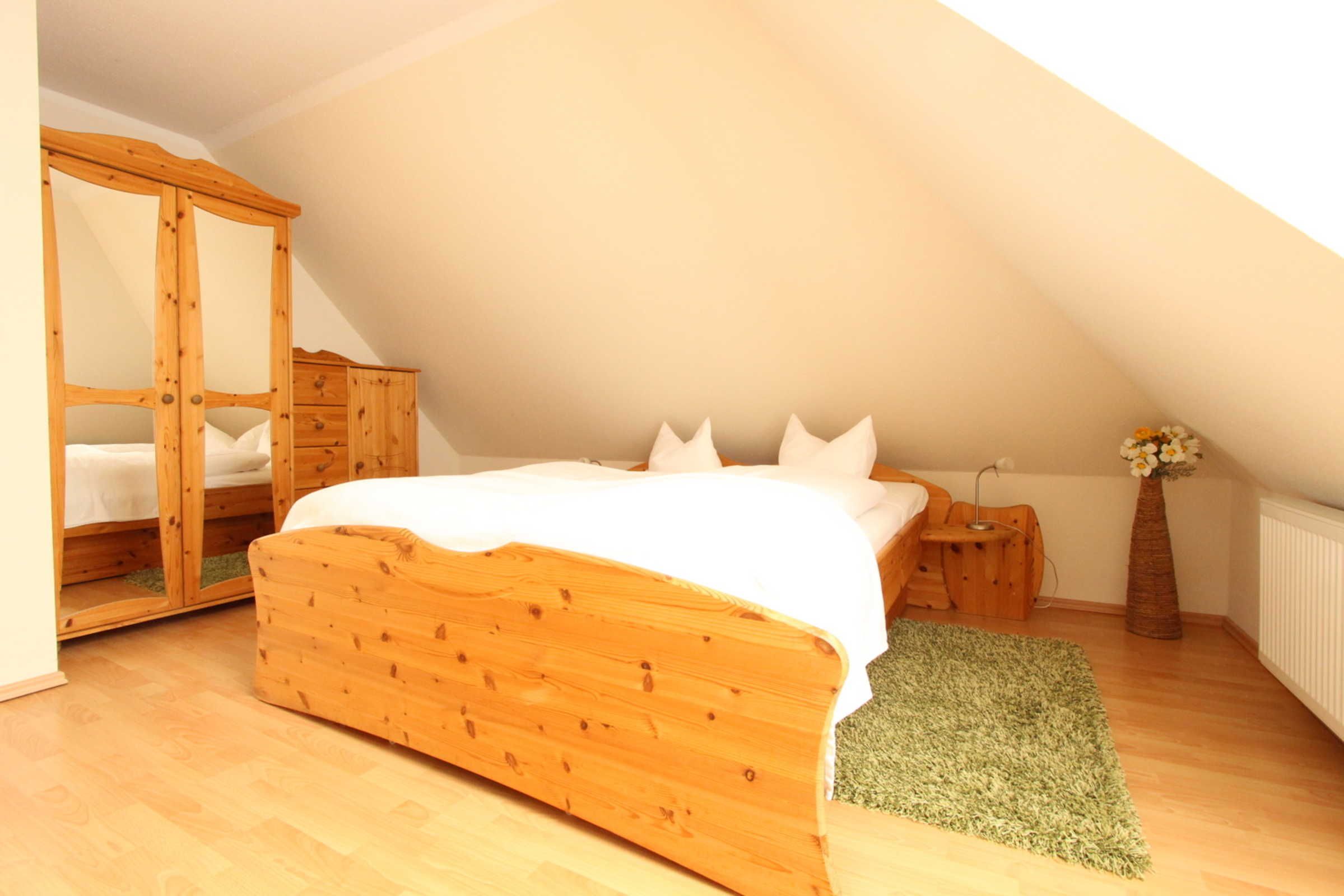 Hier erwartet Sie das Schlafzimmer mit Doppelbett (160x200cm/ Höhe 52cm), Kleiderschrank und Kommode.