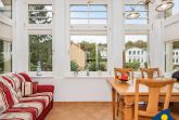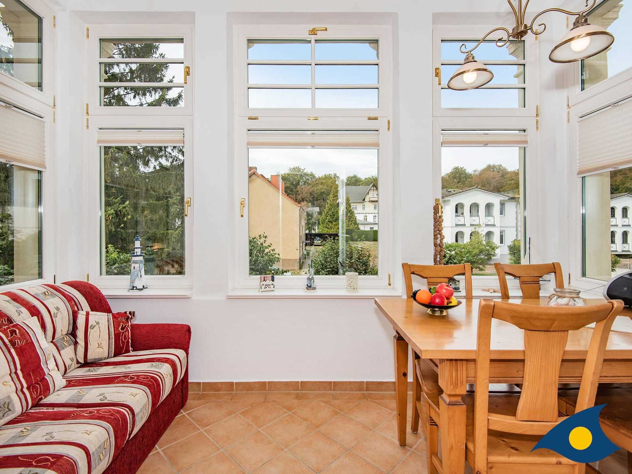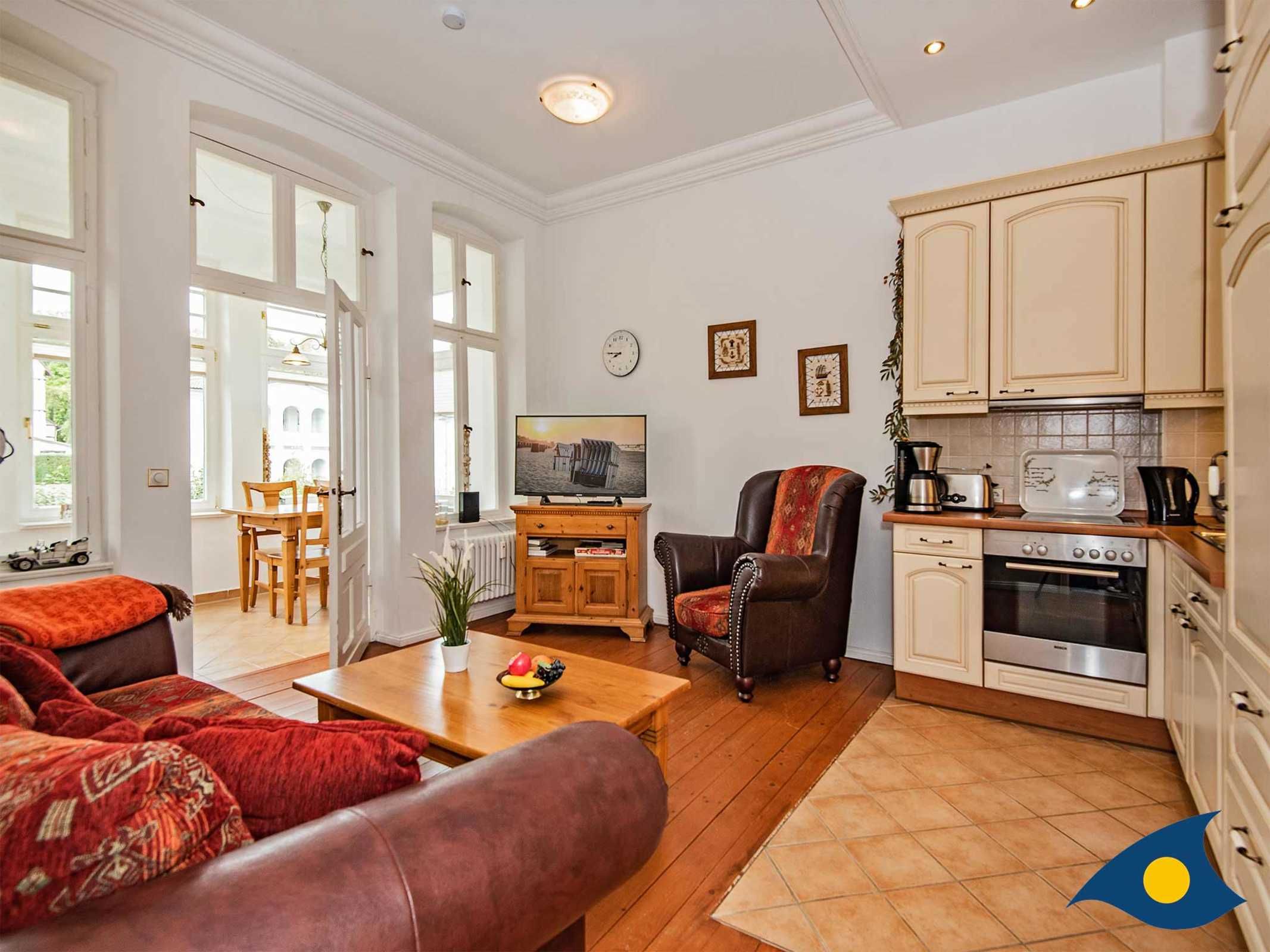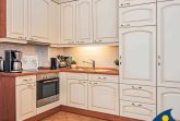 Die Küchenzeile ist im Wohnzimmer integriert und beherbergt viele nützliche Dinge für die tägliche Selbstverpflegung. Der Essplatz in der Loggia bietet Ihnen einen herrlichen Ausblick auf die angrenzenden Villen und den Buchenpark.