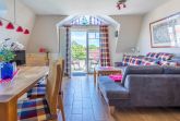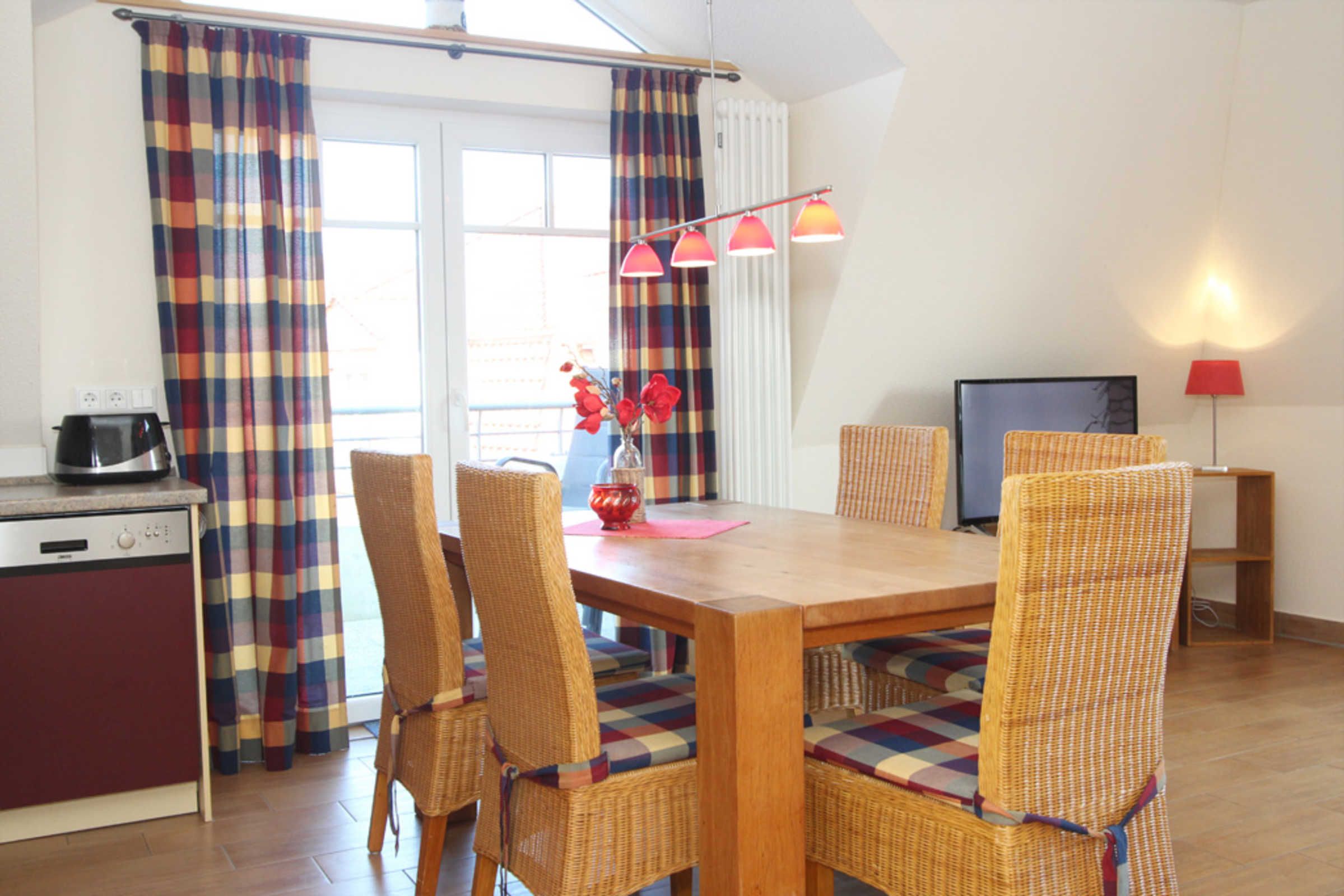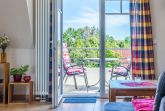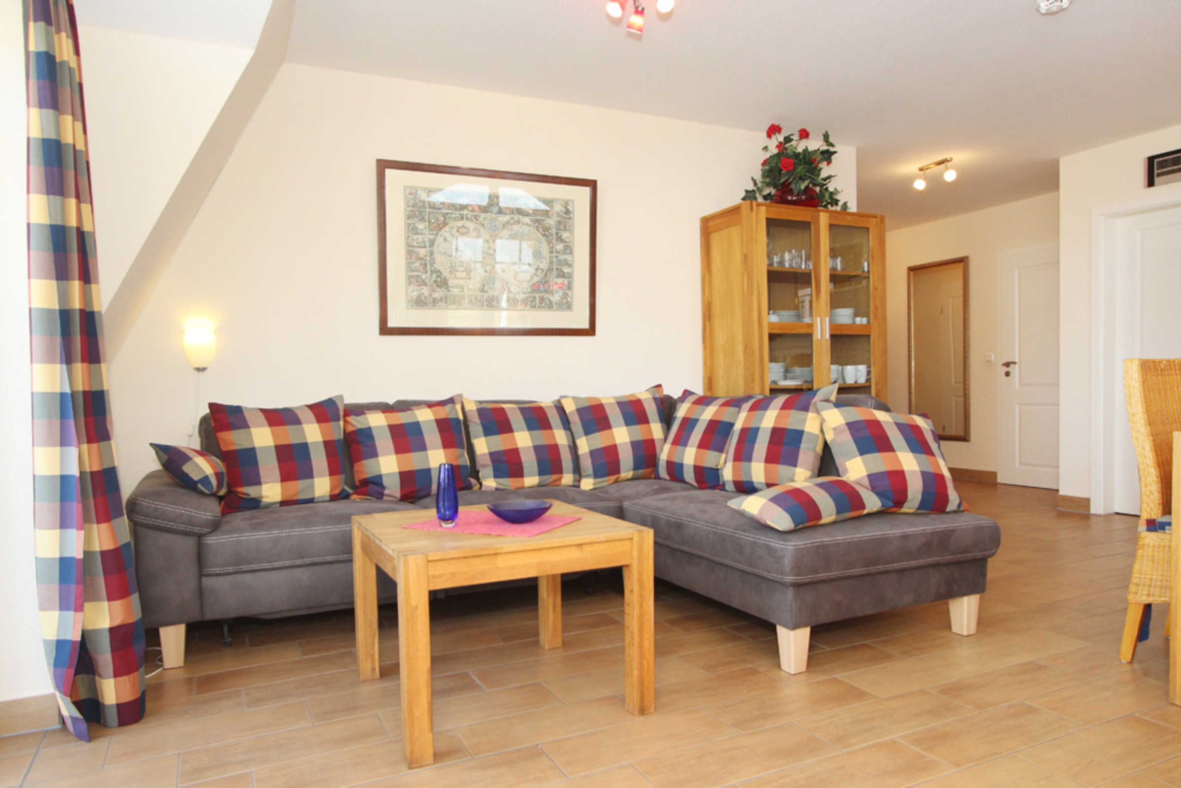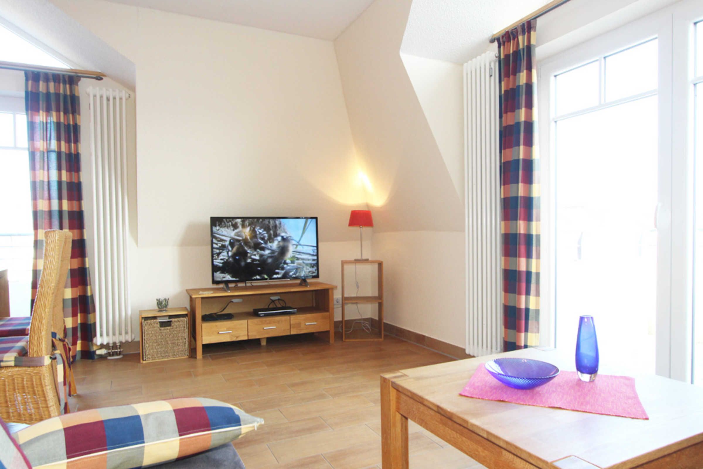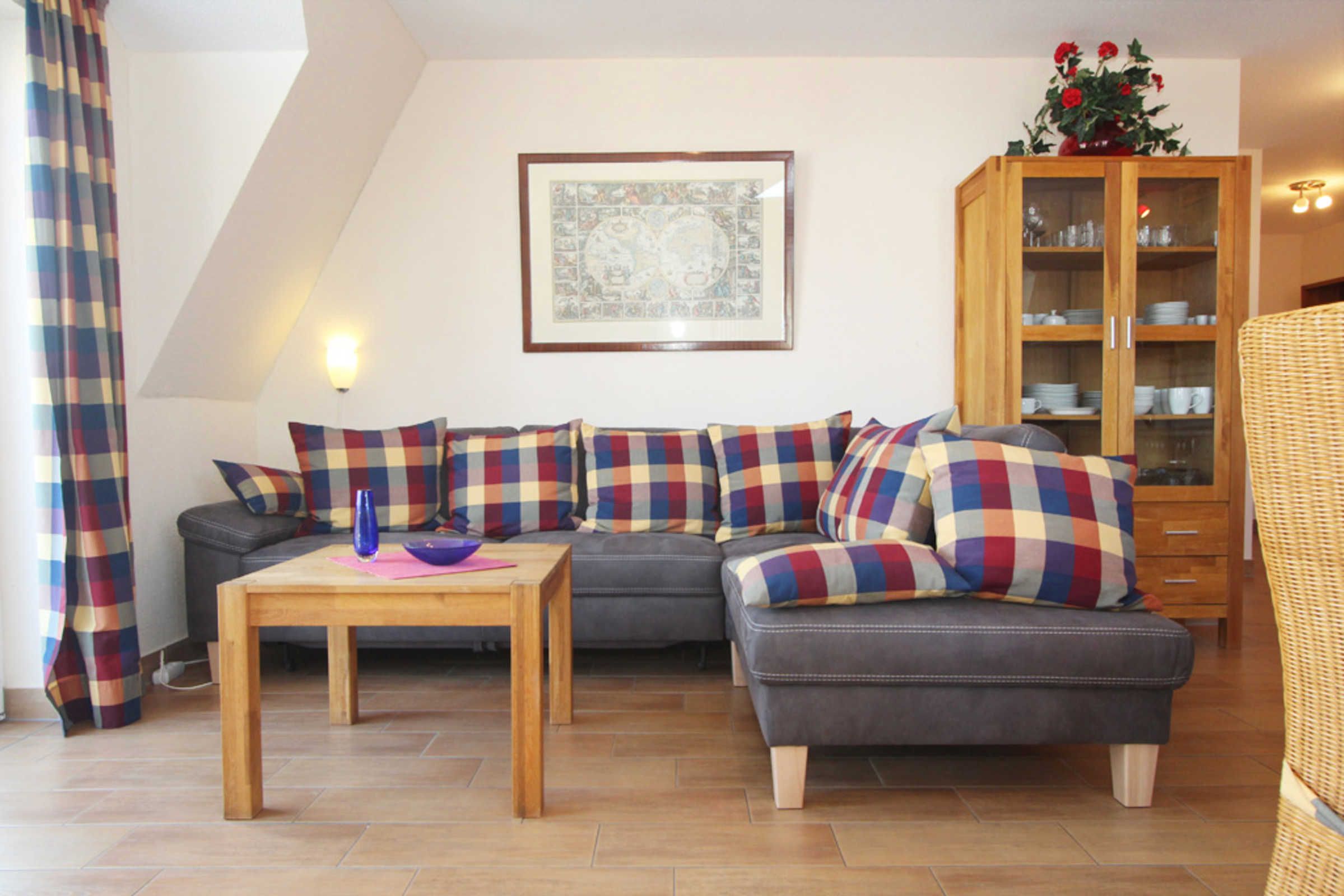 Der Wohnbereich mit SAT-TV und DVD-Player gibt die Möglichkeit her, auf beide möblierten Balkone (Nordost + Nordwest) zu gelangen. Die bequeme Sofaecke sorgt für die nötige Entspannung im Urlaub.