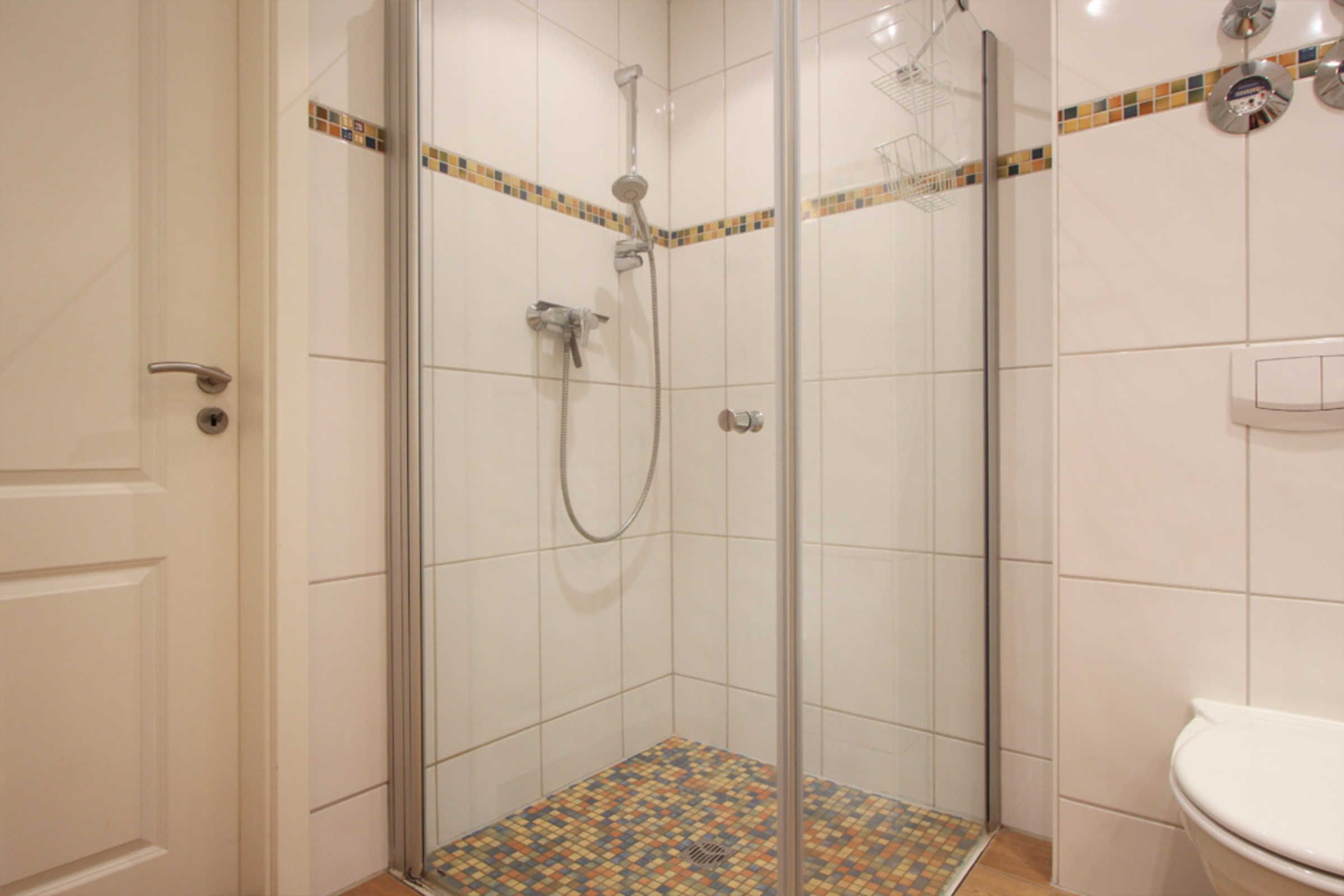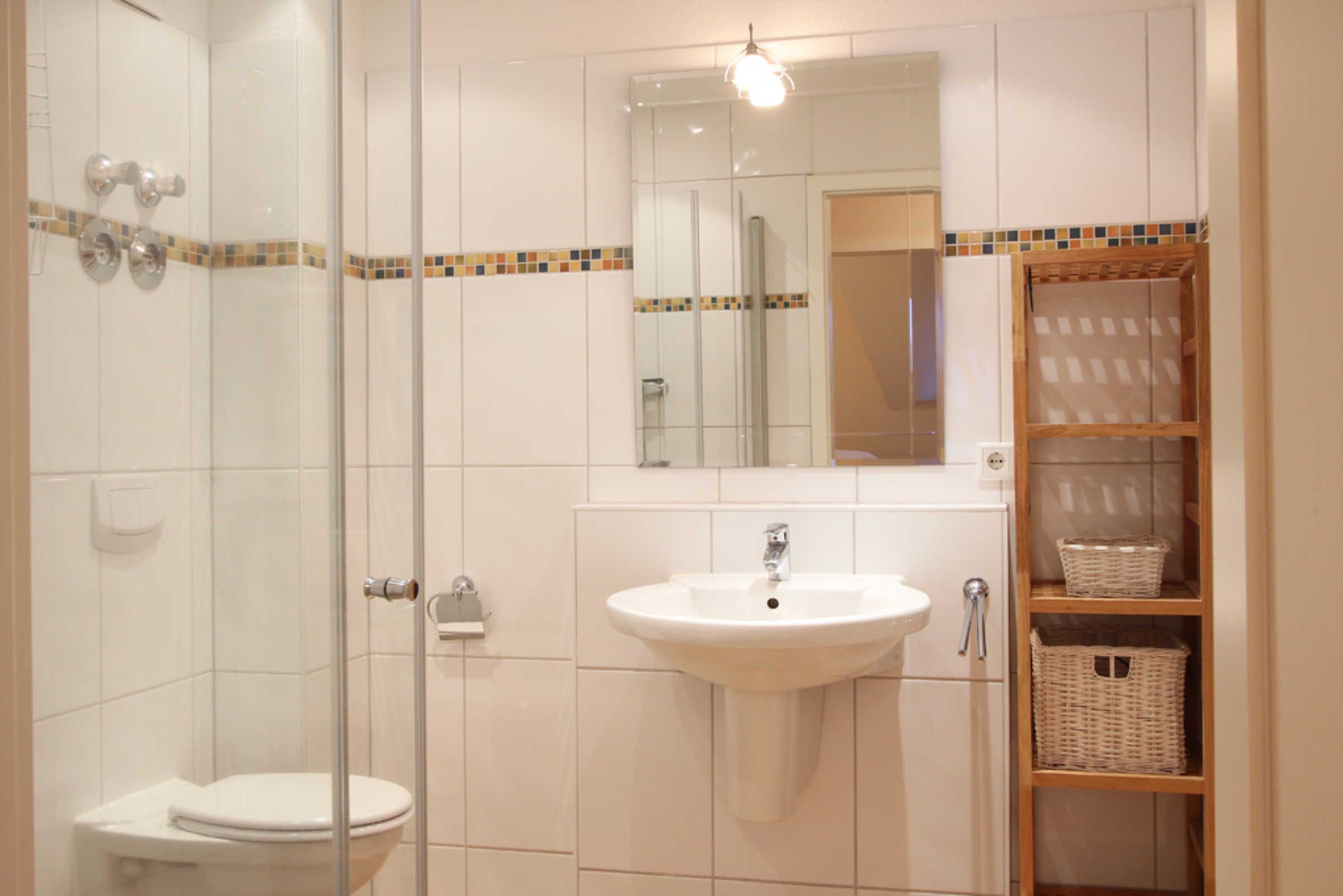 Selbstverständlich gehört zur Ferienwohnung auch ein Badezimmer mit ebenerdiger Dusche und WC.