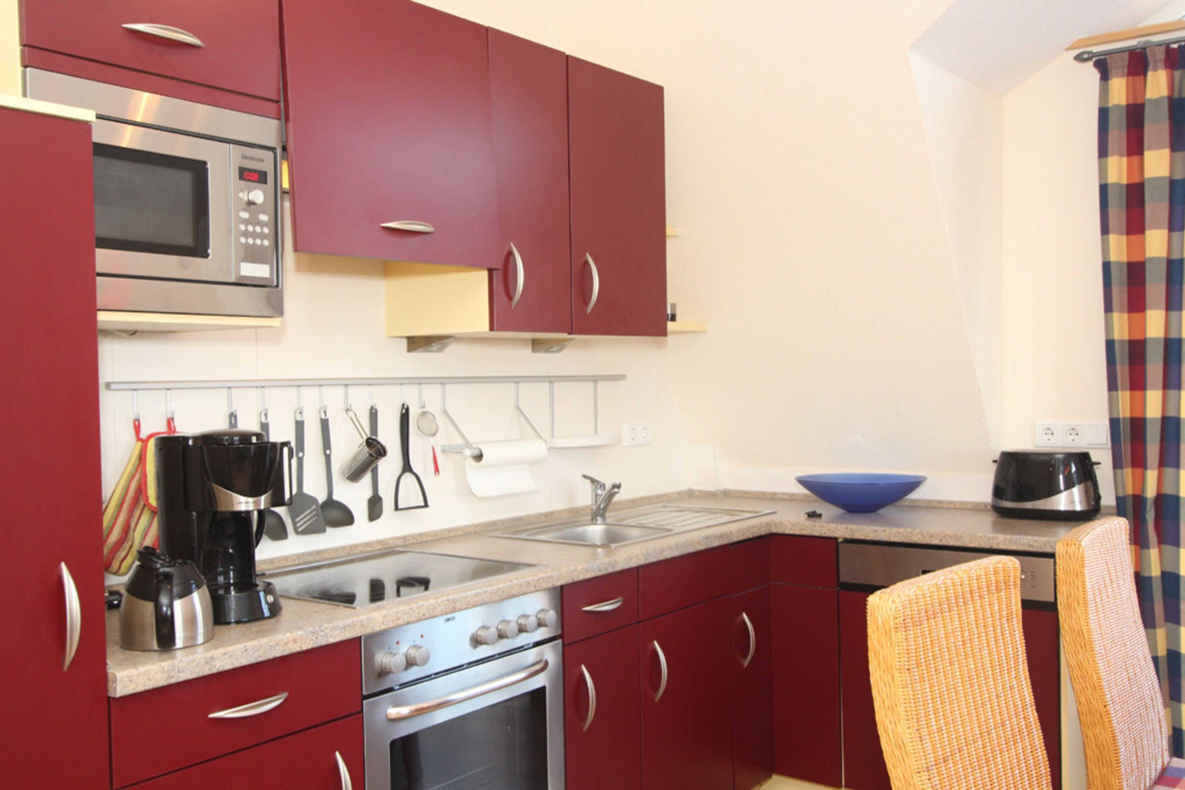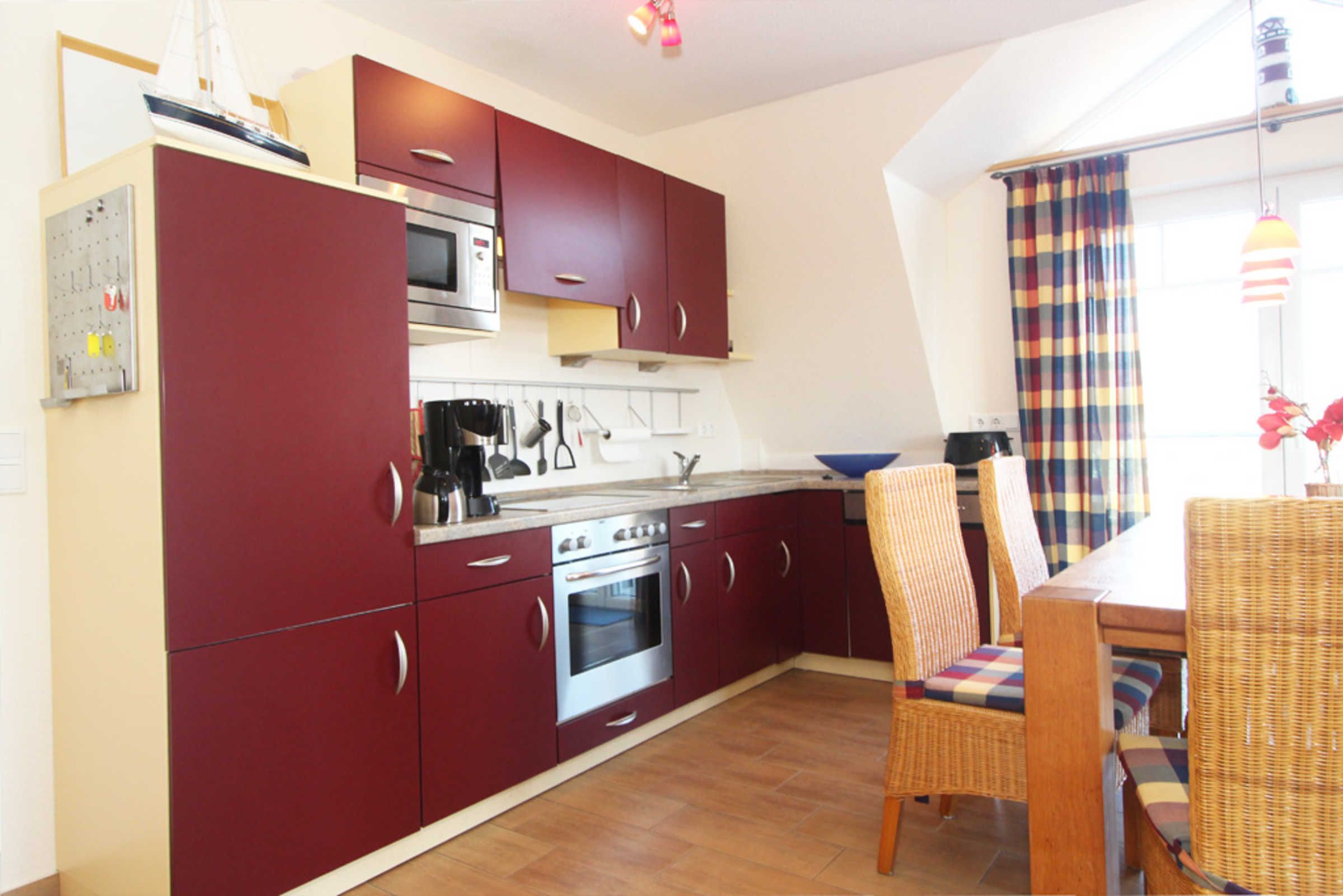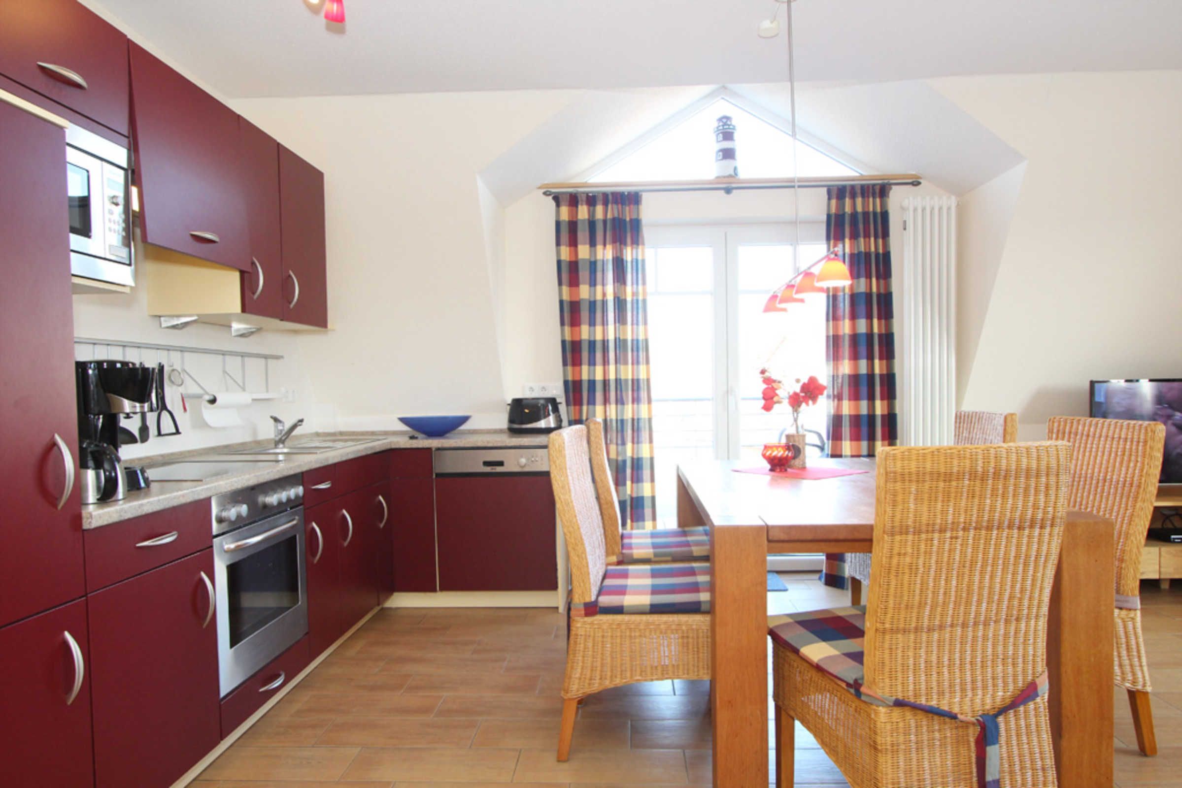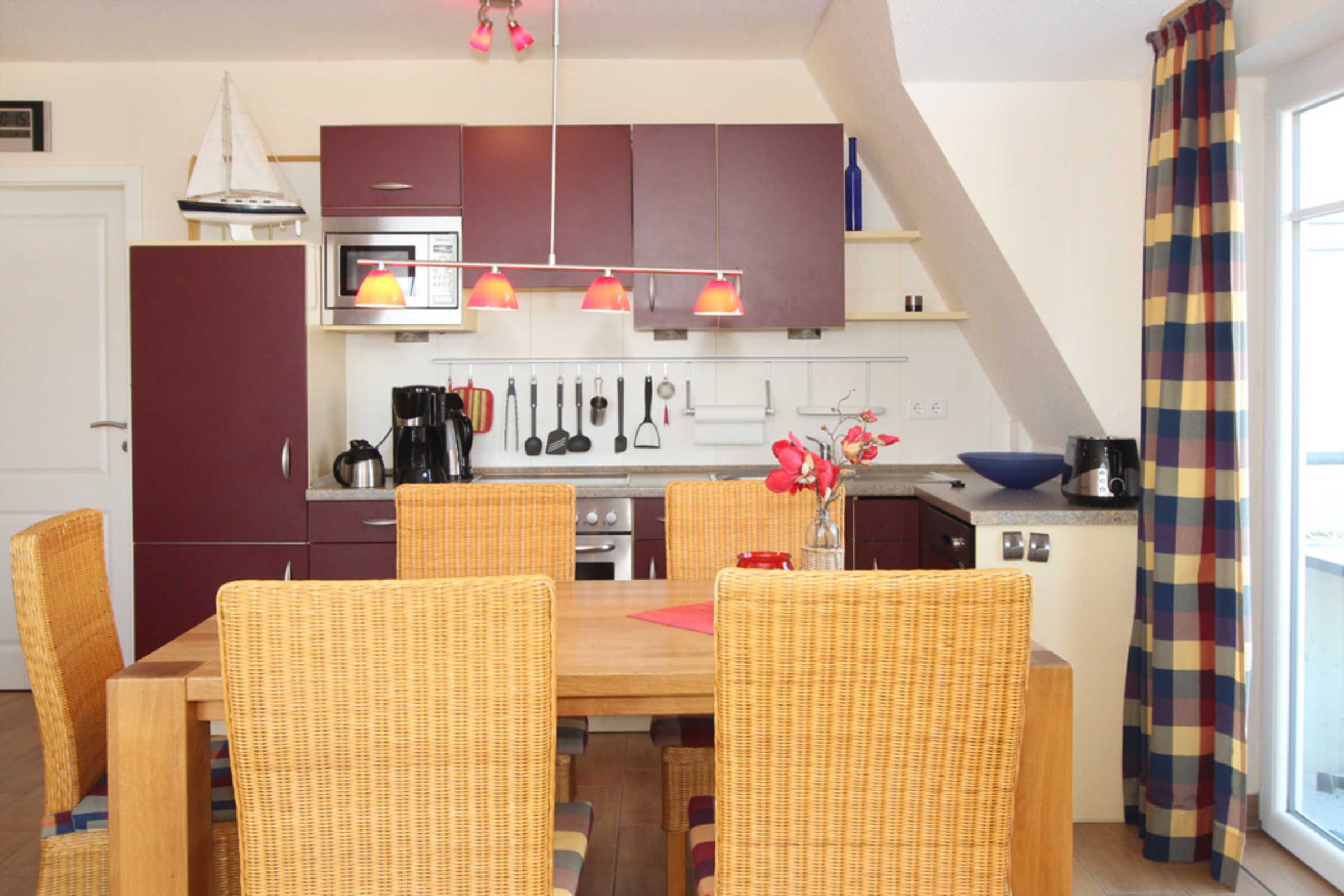 Mit der offenen Wohnküche können Sie sich rundum selbst versorgen und das zubereitete Essen gemeinsamen an der gemütlichen Essecke einnehmen. Zur Küchenausstattung zählen unter anderem ein Herd mit Backofen, eine Spülmaschine sowie ein Kühlschrank mit Gefrierfach.