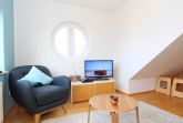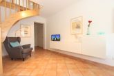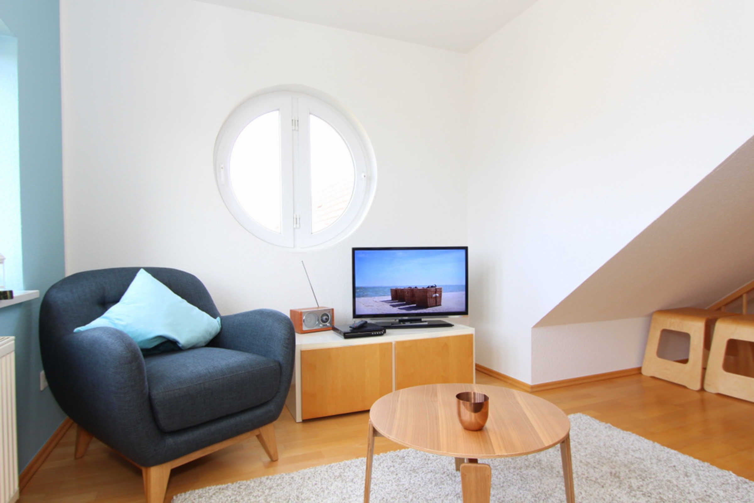 Unter der Holztreppe zum DG steht noch ein gemütlicher Sessel und ein kleiner Fernseher.