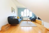 Über eine offene Holztreppe gelangen Sie in die 2. Ebene (DG). Diese empfängt Sie mit einem gemütlichen Wohnbereich. Bequeme Polstermöbel und Flatscreen-TV sowie ein DVD-Player laden hier zum Relaxen ein.