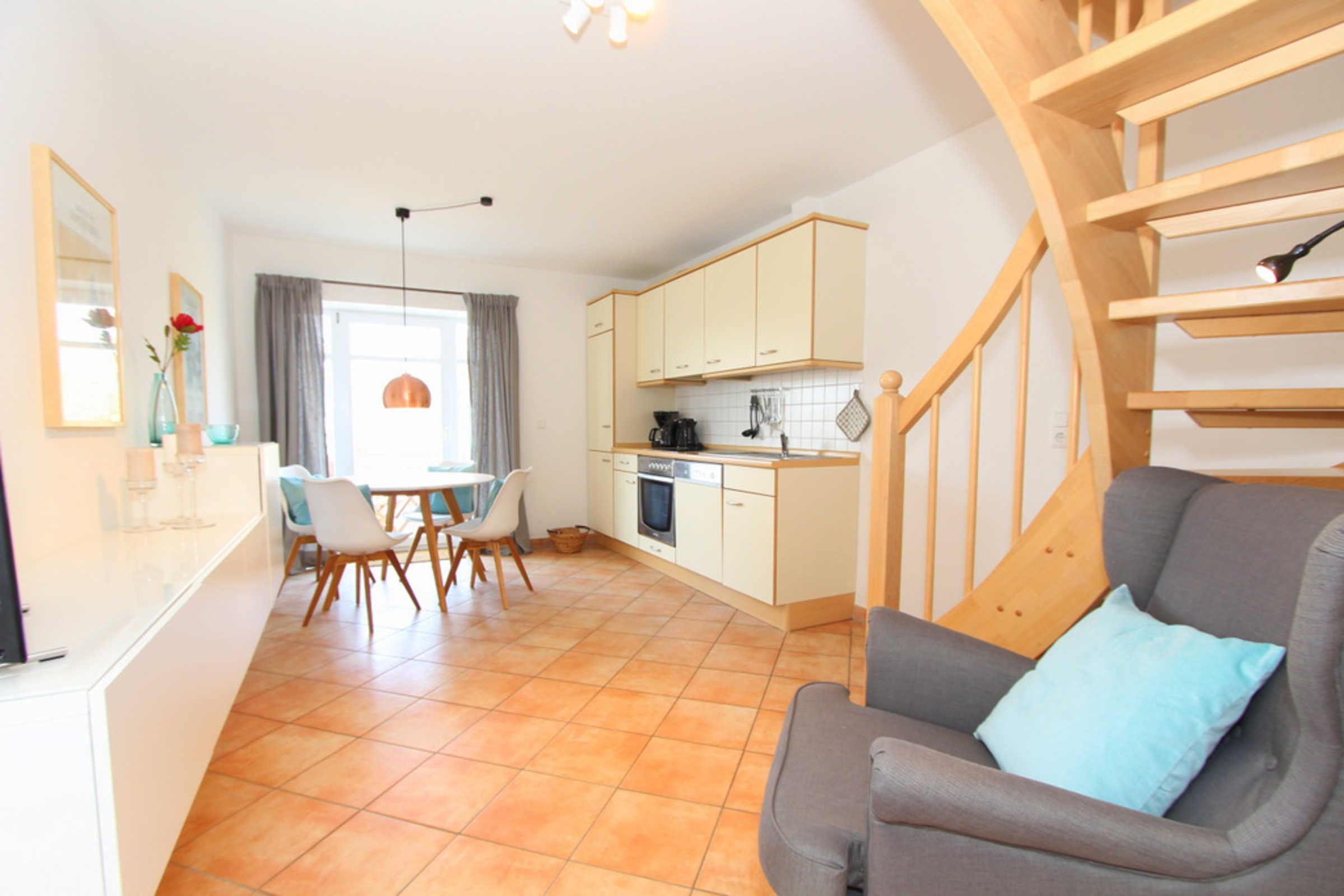 Auf der 1. Ebene (2.OG) befindet sich eine moderne Küchenzeile. Diese bietet eine sehr gute Ausstattung für eine Rund-Um-Selbstverpflegung. An der separaten Essecke lässt es sich gemütlich gemeinsam speisen.