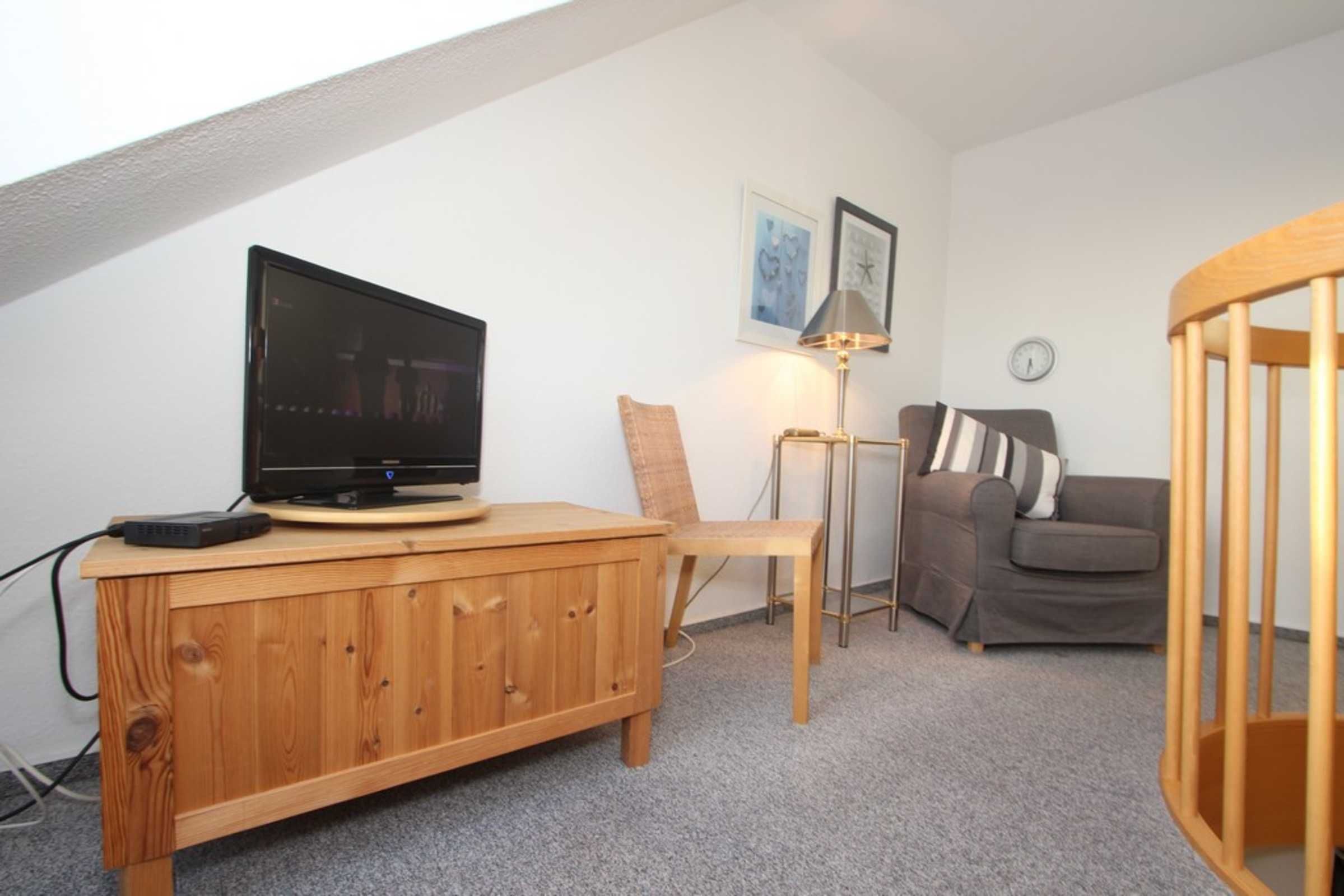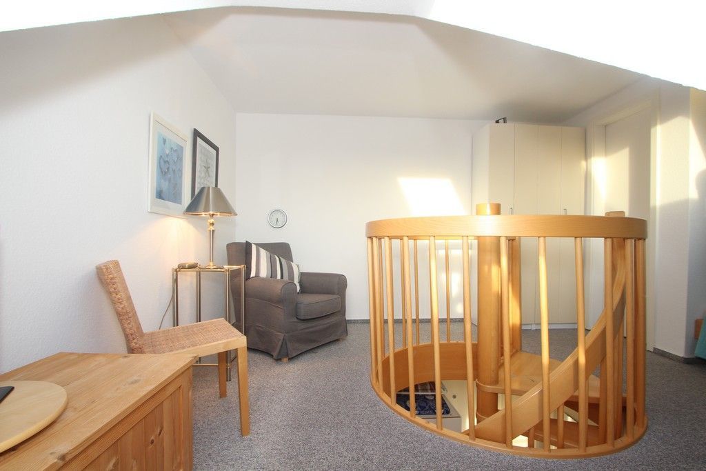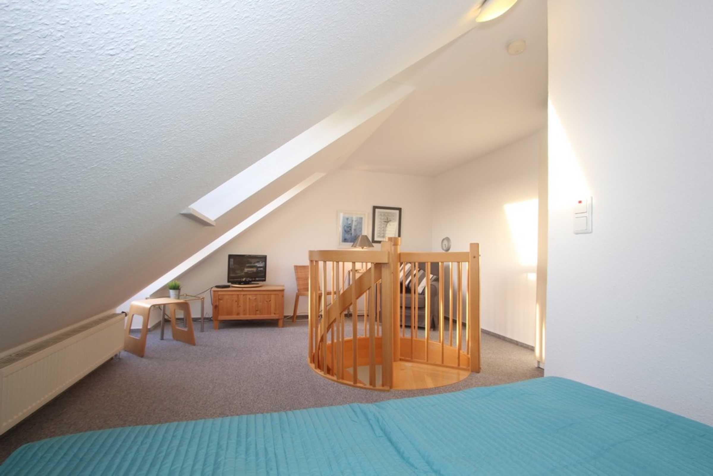 Im Dachgeschoss, der zweiten Ebene, die Sie durch eine Wendeltreppe vom Wohnbereich aus erreichen, ist der offene Schlafbereich mit einem Doppelbett und zweitem SAT-TV (Flatscreen) eingerichtet.