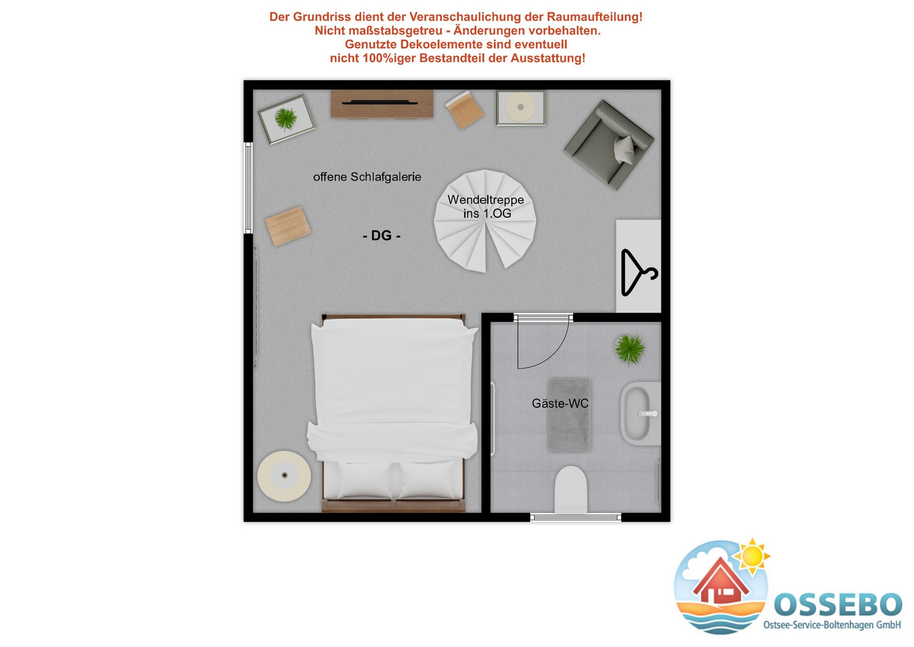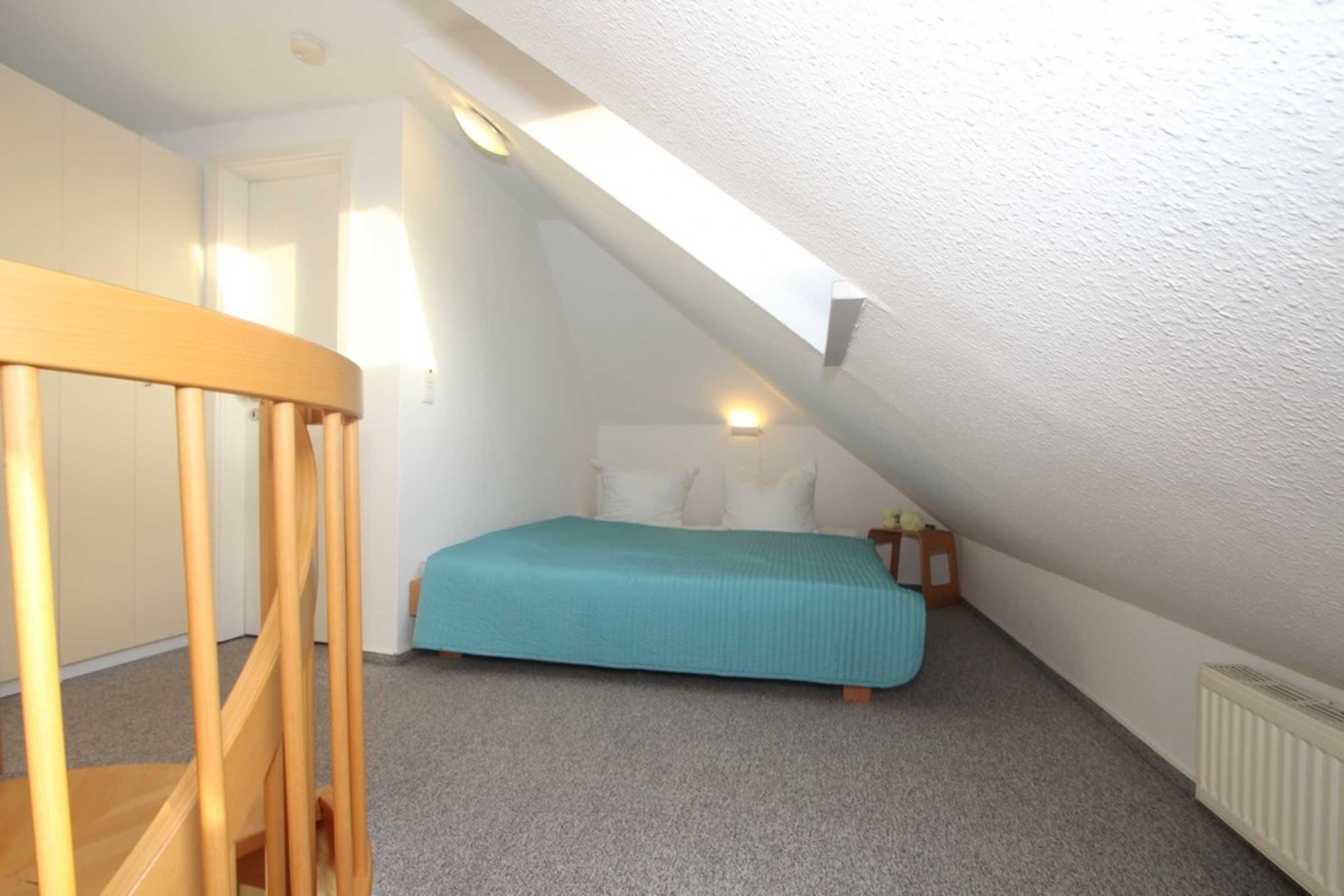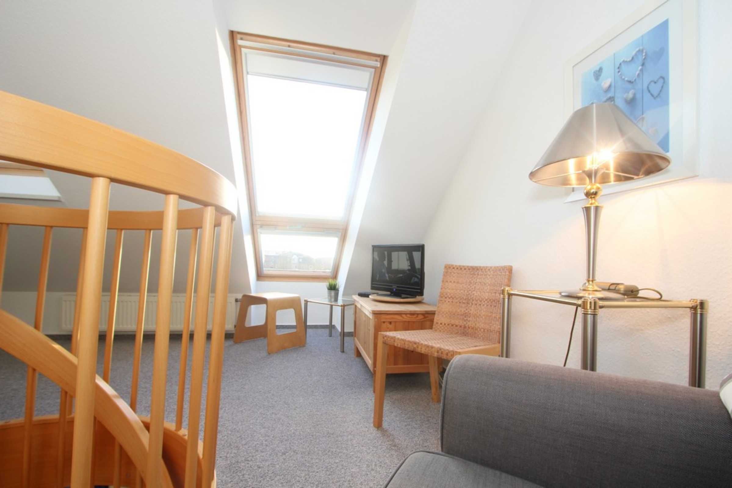 Im Dachgeschoss, der zweiten Ebene, die Sie durch eine Wendeltreppe vom Wohnbereich aus erreichen, ist der offene Schlafbereich mit einem Doppelbett und zweitem SAT-TV (Flatscreen) eingerichtet.