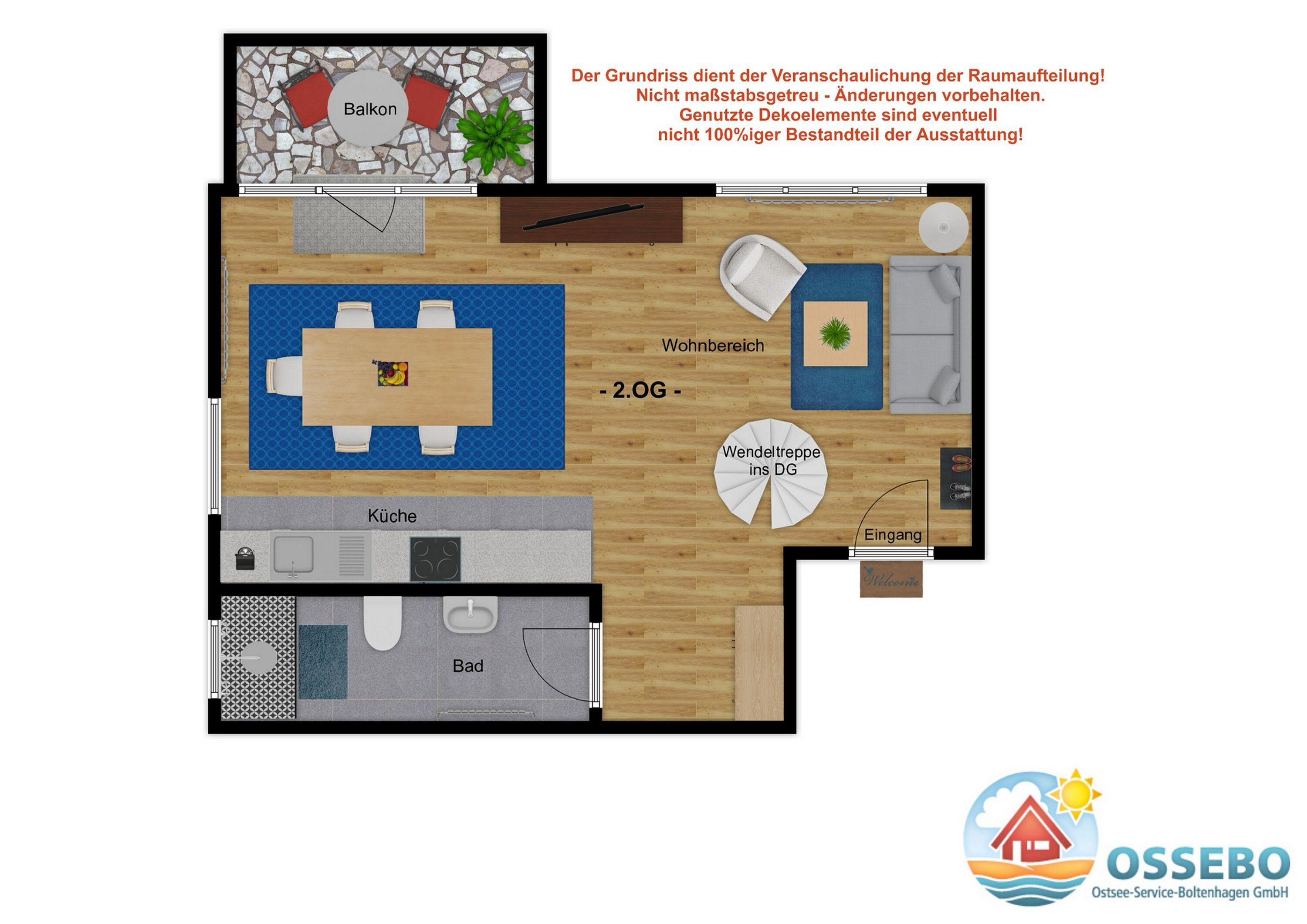 Das rund 45qm große 2-Zimmer-Ferienappartement für 2 Gäste befindet sich im 2. OG und erstreckt sich über 2 Ebenen.