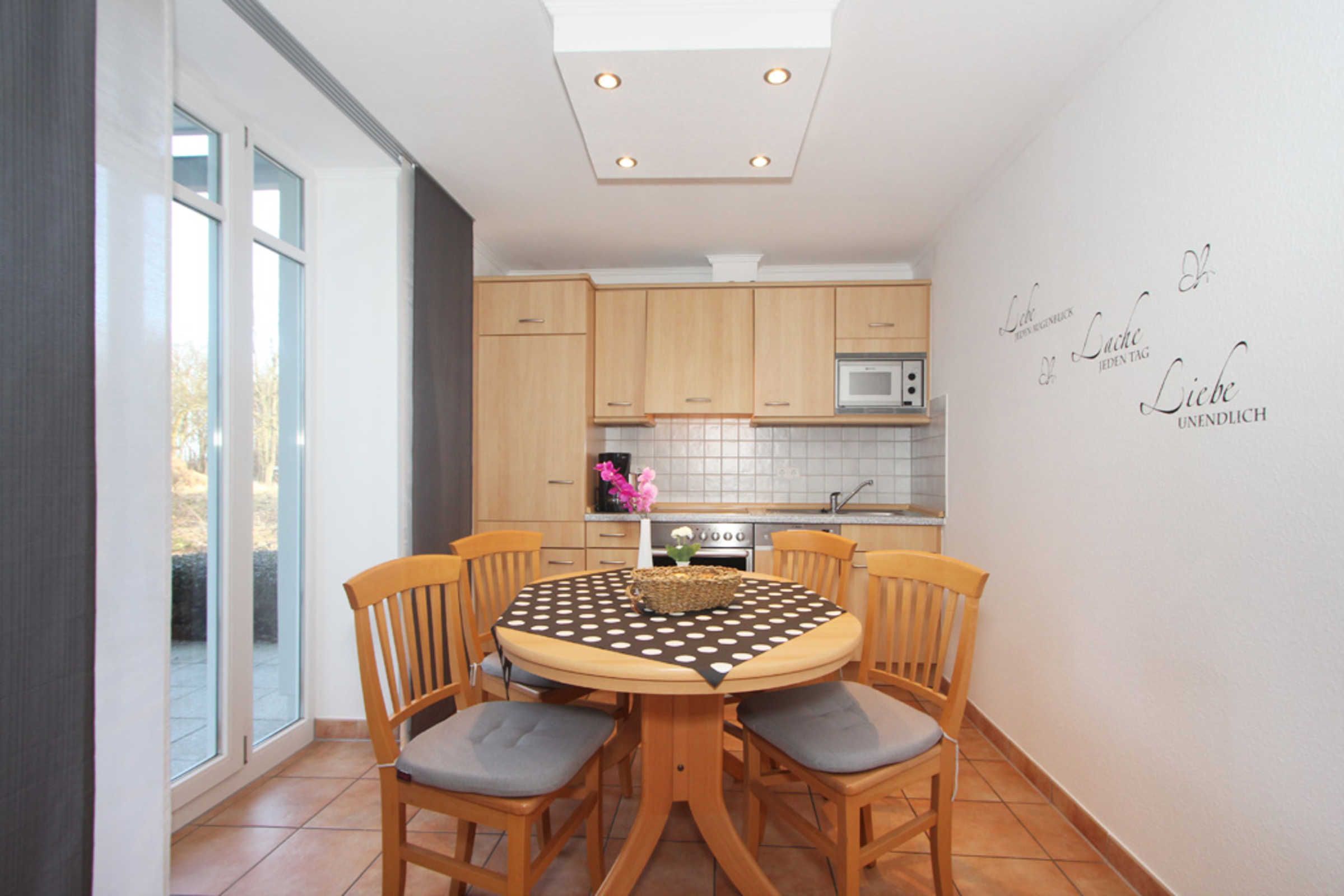 Die perfekt ausgestattete offene Küche eignet sich hervorragend für eine sorglose Selbstversorgung und bietet Ihnen eine gemütliche Essecke.