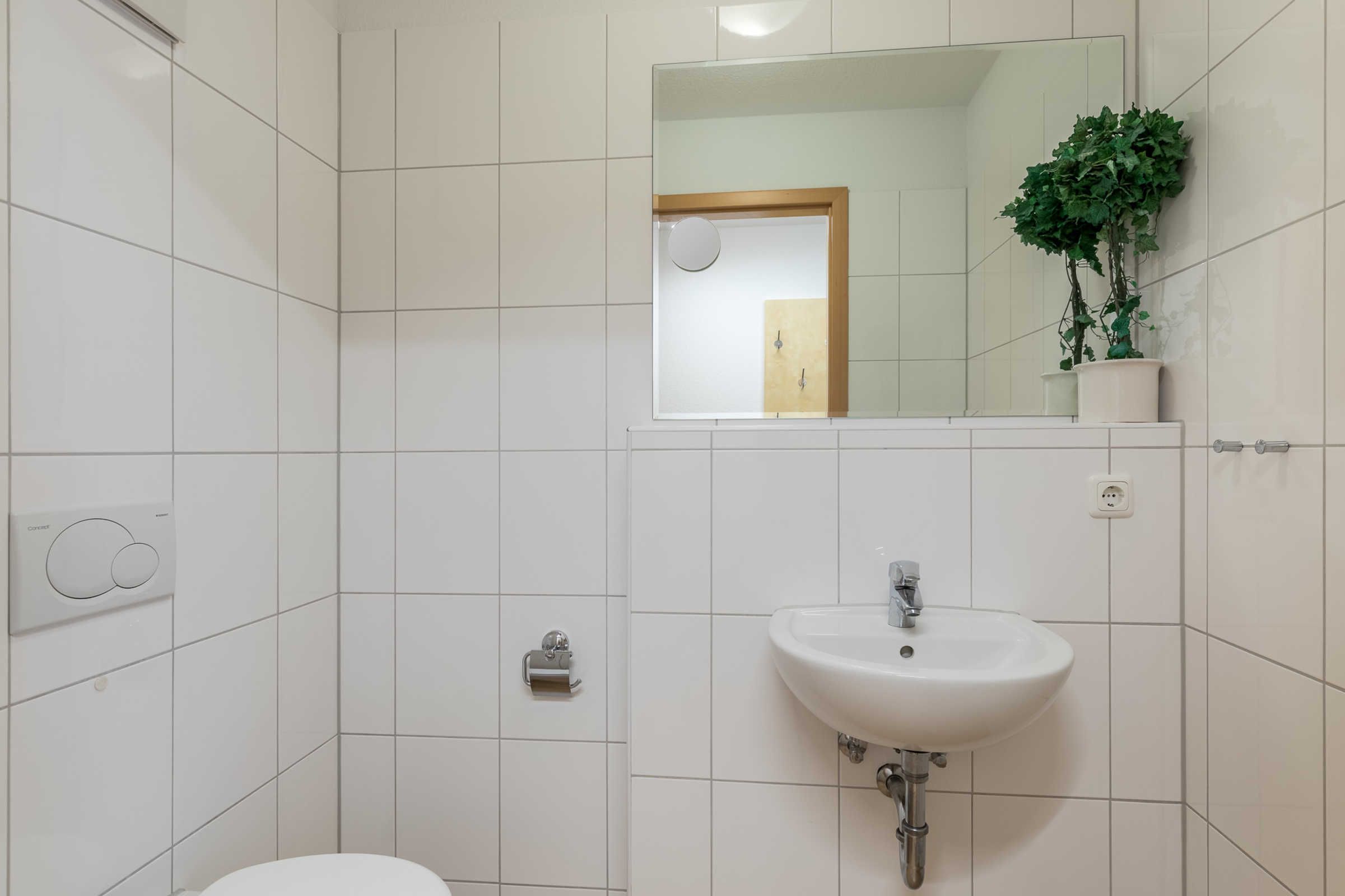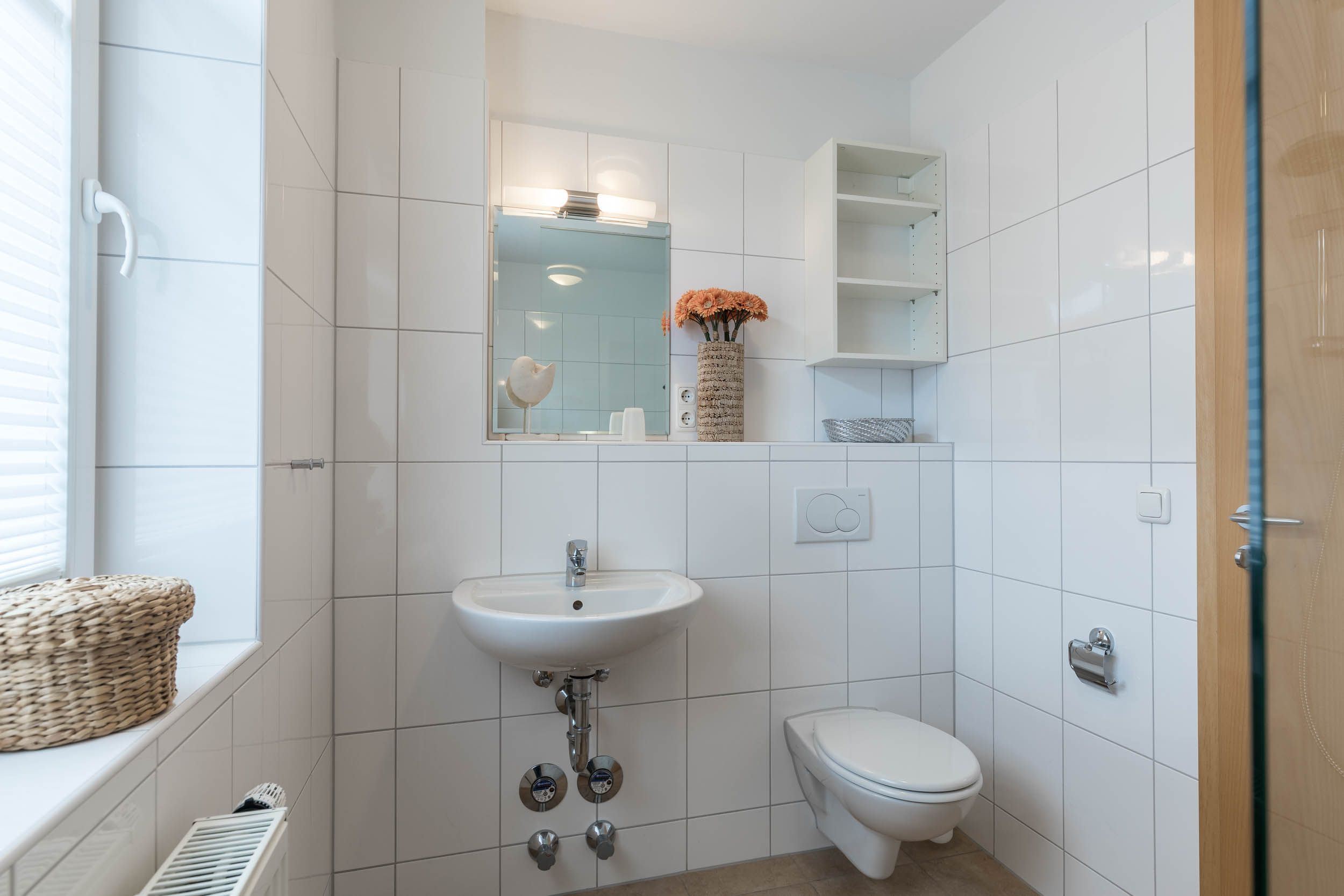 Das Badezimmer mit WC und einer bodengleichen Dusche sorgt für entspanntes Duschen. Ein zusätzliches Gäste-WC erleichtert den Aufenthalt bei mehreren Personen.
