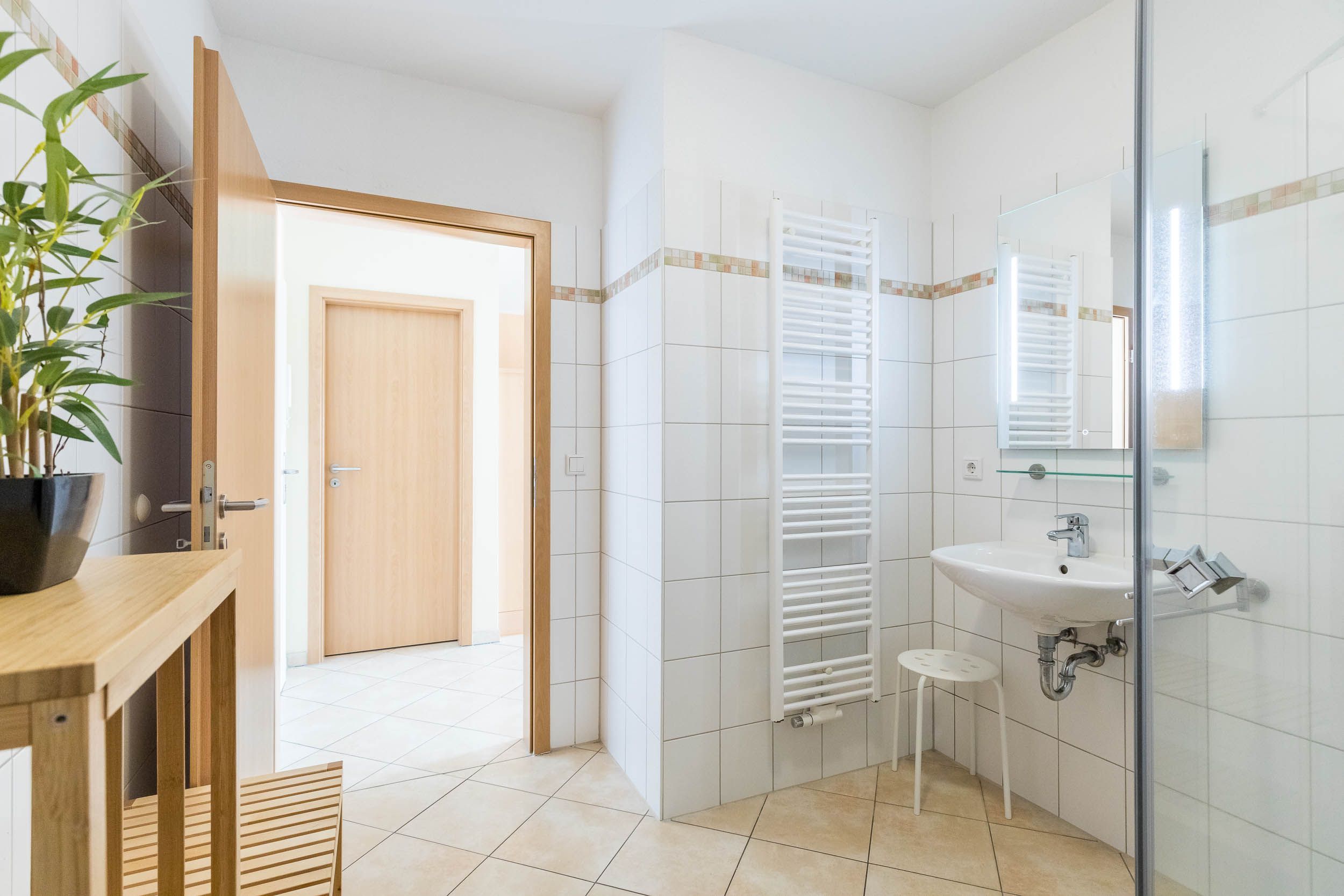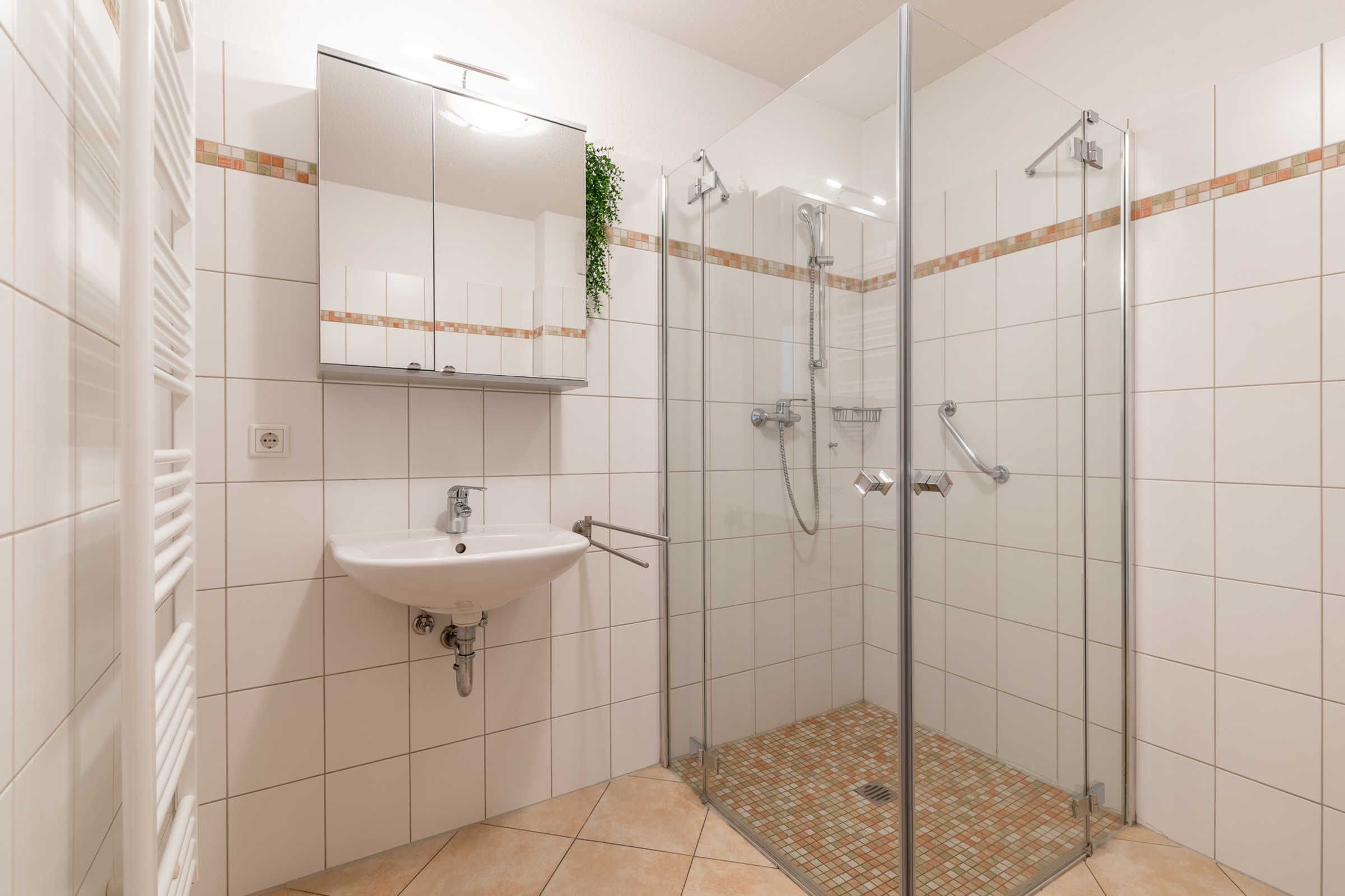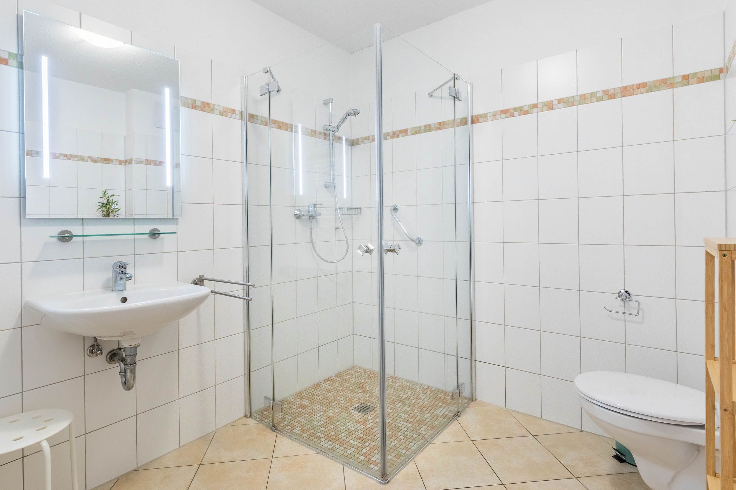 Im Badezimmer stehen Ihnen eine ebenerdige Dusche (mit Haltegriff) mit WC zur Verfügung. Ein Duschhocker steht hier ebenfalls bereit. Die Handtuchheizung sorgt zusätzlich für wohlige Wärme.