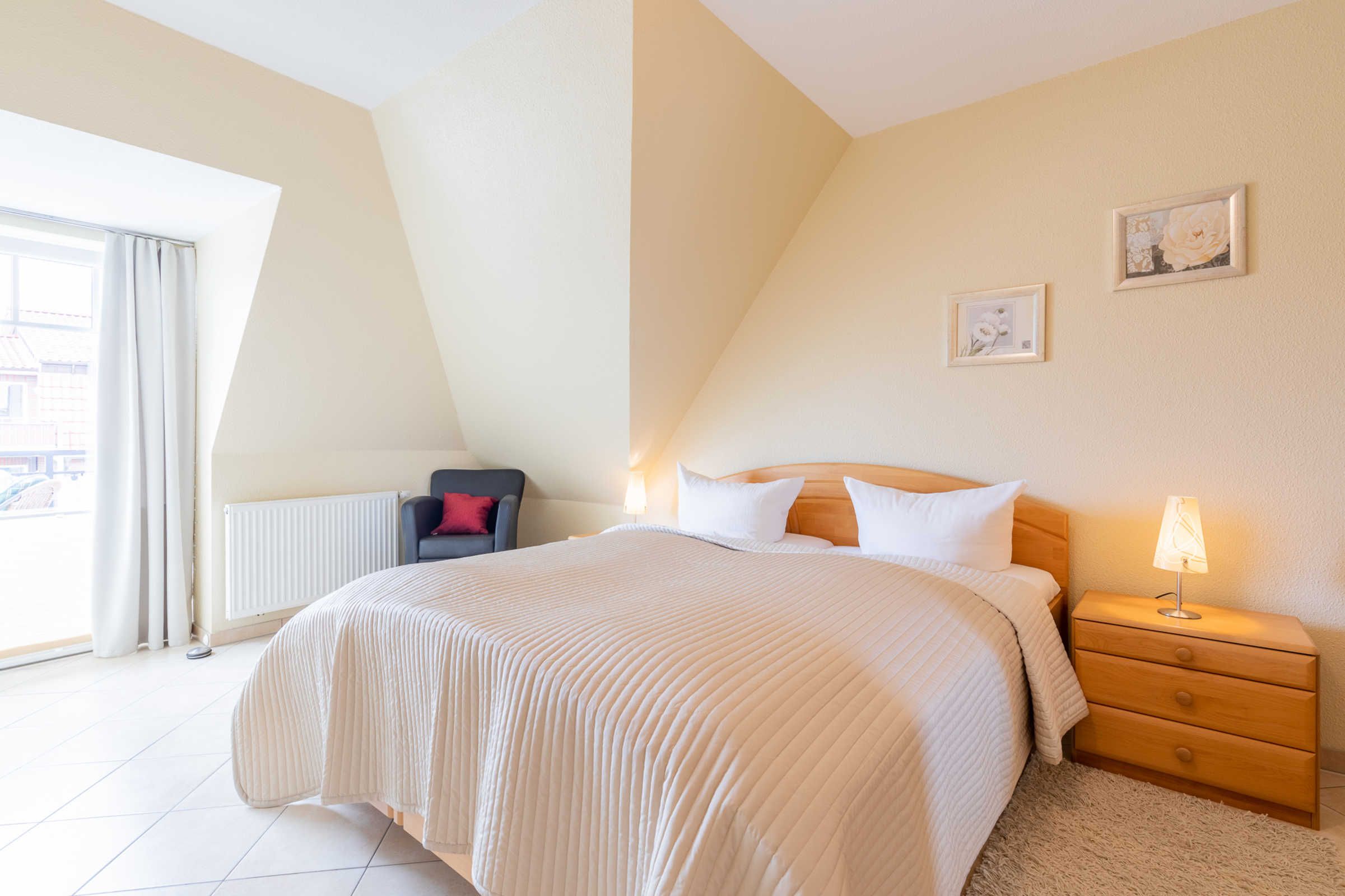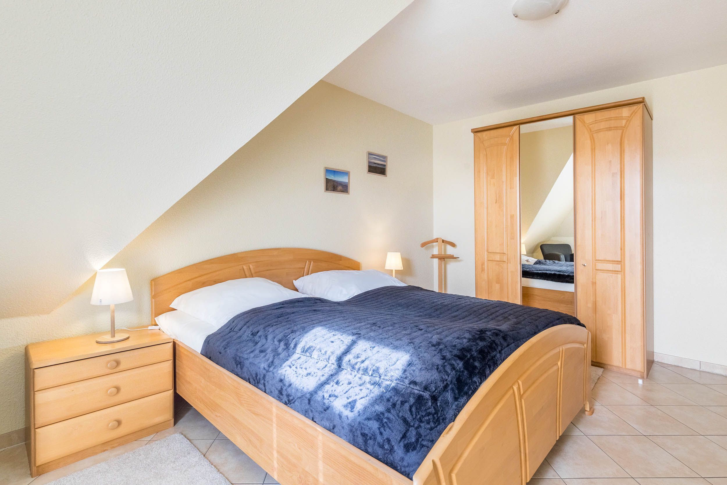 Das Schlafzimmer bietet ein bequemes Doppelbett (180x200cm/ Höhe 57cm) und einen großen Kleiderschrank mit viel Platz für die Urlaubsgarderobe. Ein Reisebettchen könnte hier bei Bedarf auch aufgestellt werden. Das Zimmer lässt sich hervorragend abdunkeln.