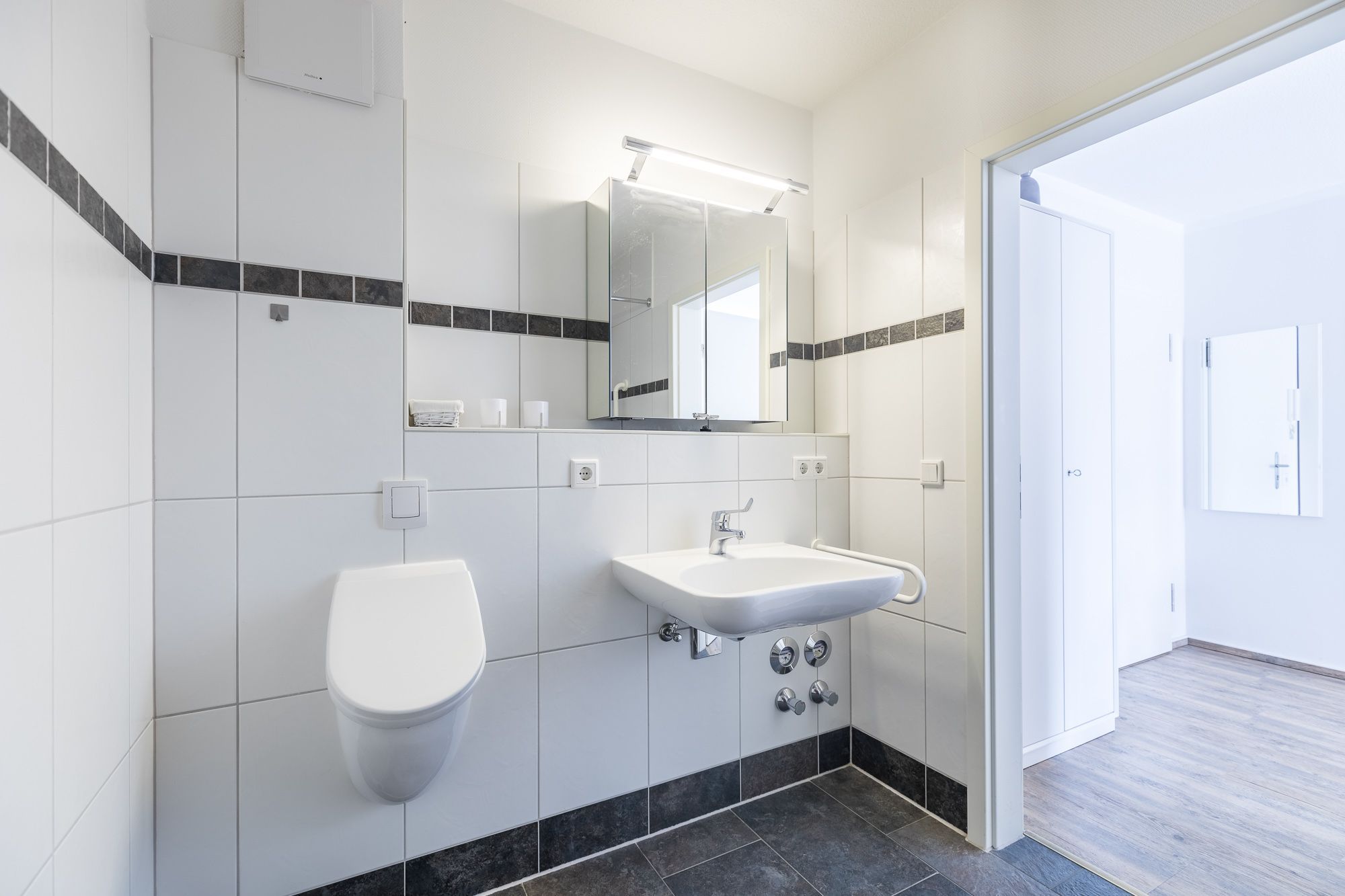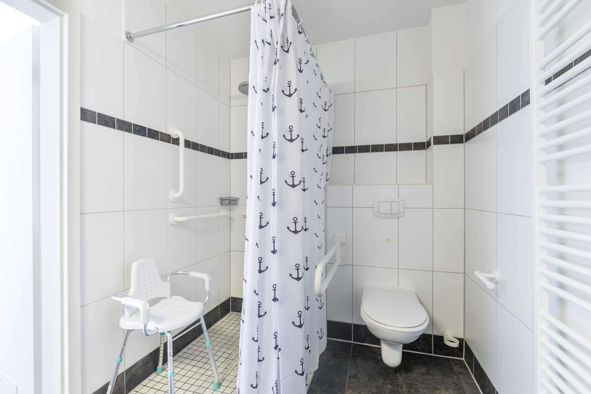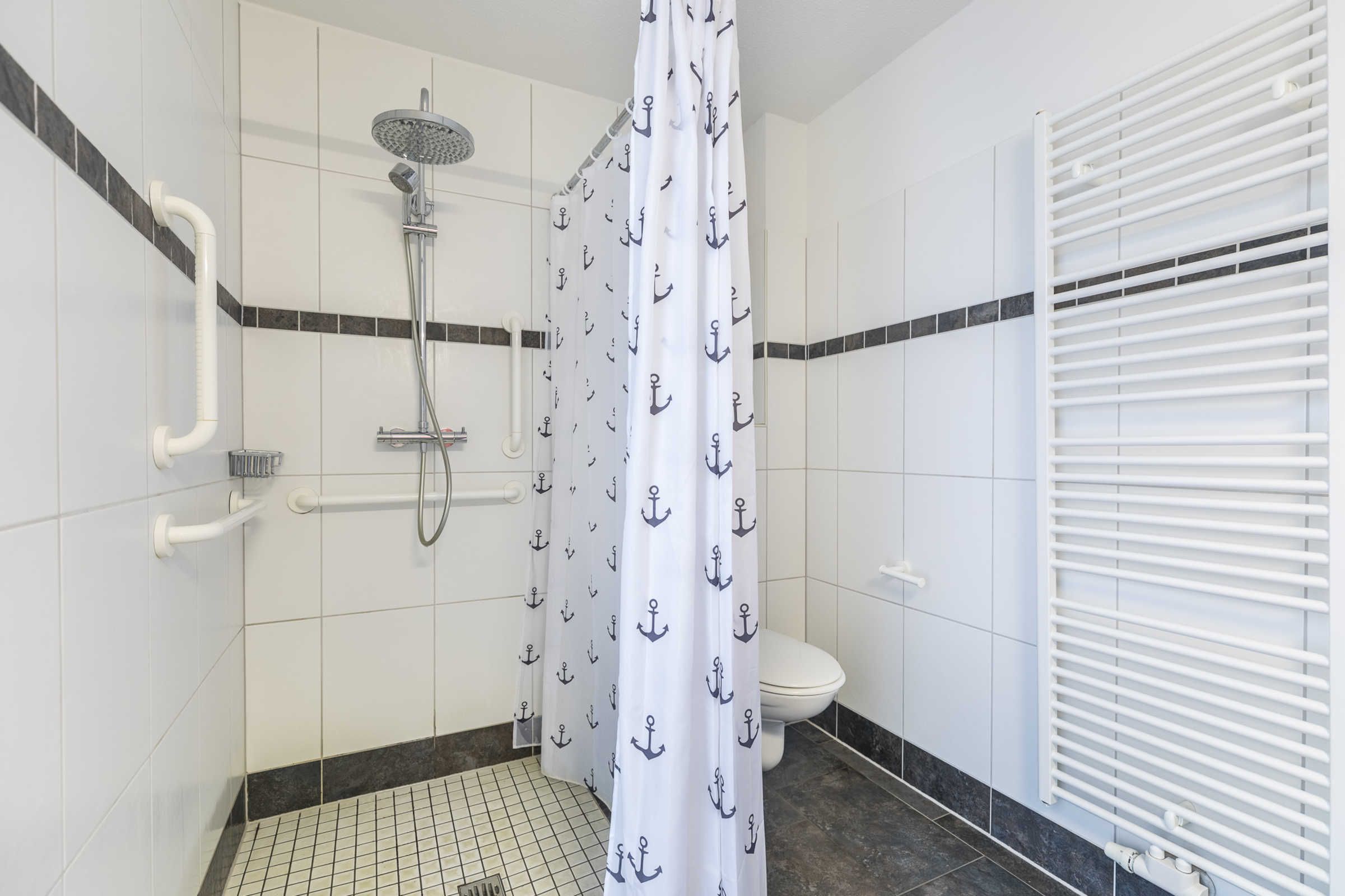 Auch das große Bad mit bodengleicher Dusche und Duschvorhang und WC bietet mitunter eine tolle Ausstattung für Urlaubsgäste mit Gehbehinderung, wie z.B. ein Duschhocker oder diverse Haltegriffe in der Dusche und am WC. Durch den Duschvorhang ist der Zugang auch mit dem Rollstuhl kein Problem. Weiterhin bietet das Bad ein Bidet. Eine Handtuchheizung sorgt hier auf Wunsch für mollig warme Frotteewäsche.