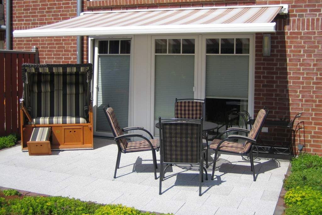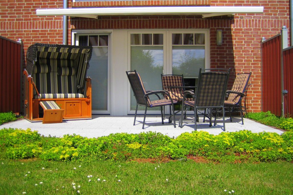 Die Südwest-Terrasse zum Grünen mit ihrem urigen Strandkorb und weiteren Gartenmöbeln lädt zum Entspannen ein. Sie erreichen die Terrasse sowohl vom Wohnzimmer als auch vom Schlafzimmer.