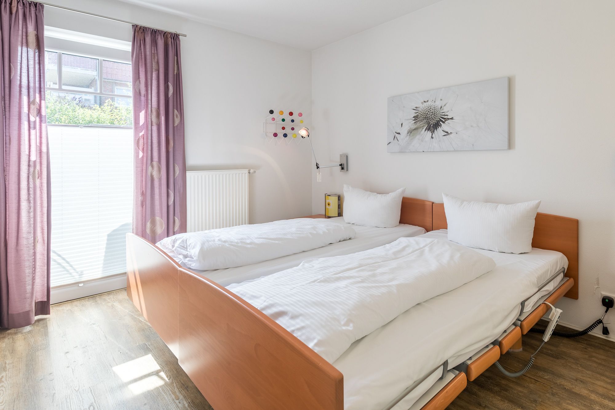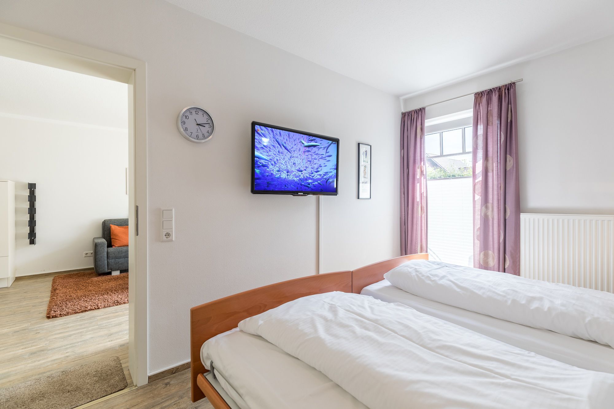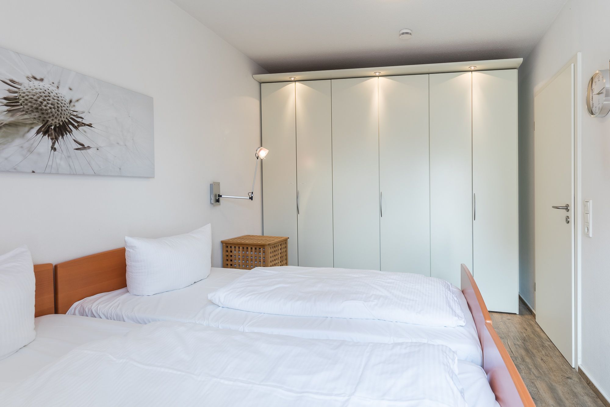 Das behagliche Urlaubsdomizil wird durch das Schlafzimmer mit eigenem Flatscreen-TV und 2 zusammenstehende Einzelbetten (je 97x200cm) komplettiert. Beide Betten können getrennt voneinander in der Höhe individuell verstellt werden (Höhe 55-92cm stufenlos einstellbar). In dem geräumigen Kleiderschrank bringen Sie Ihre Garderobe mühelos unter.