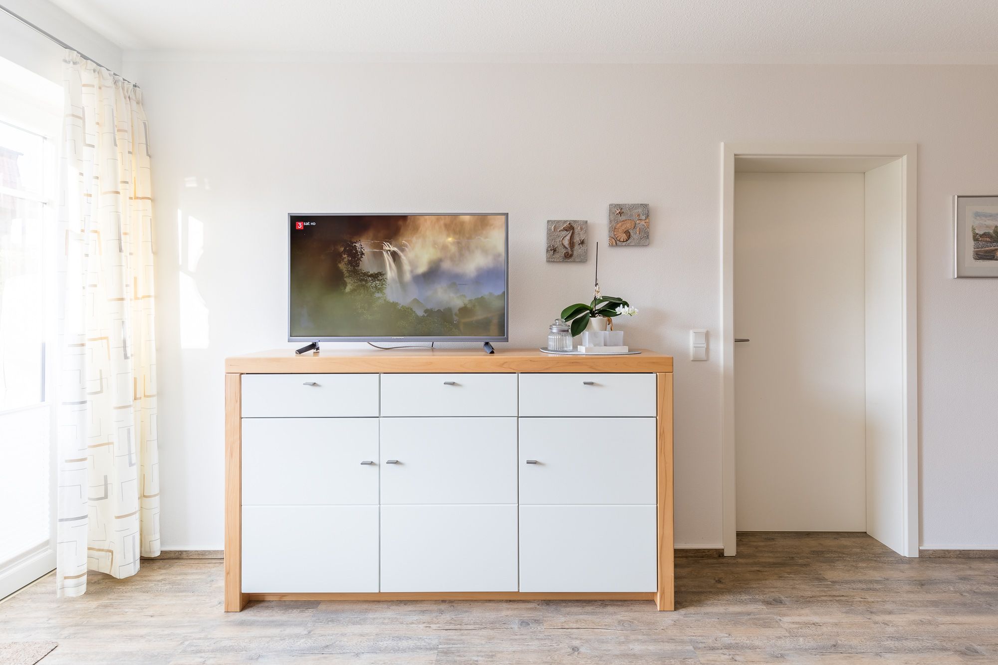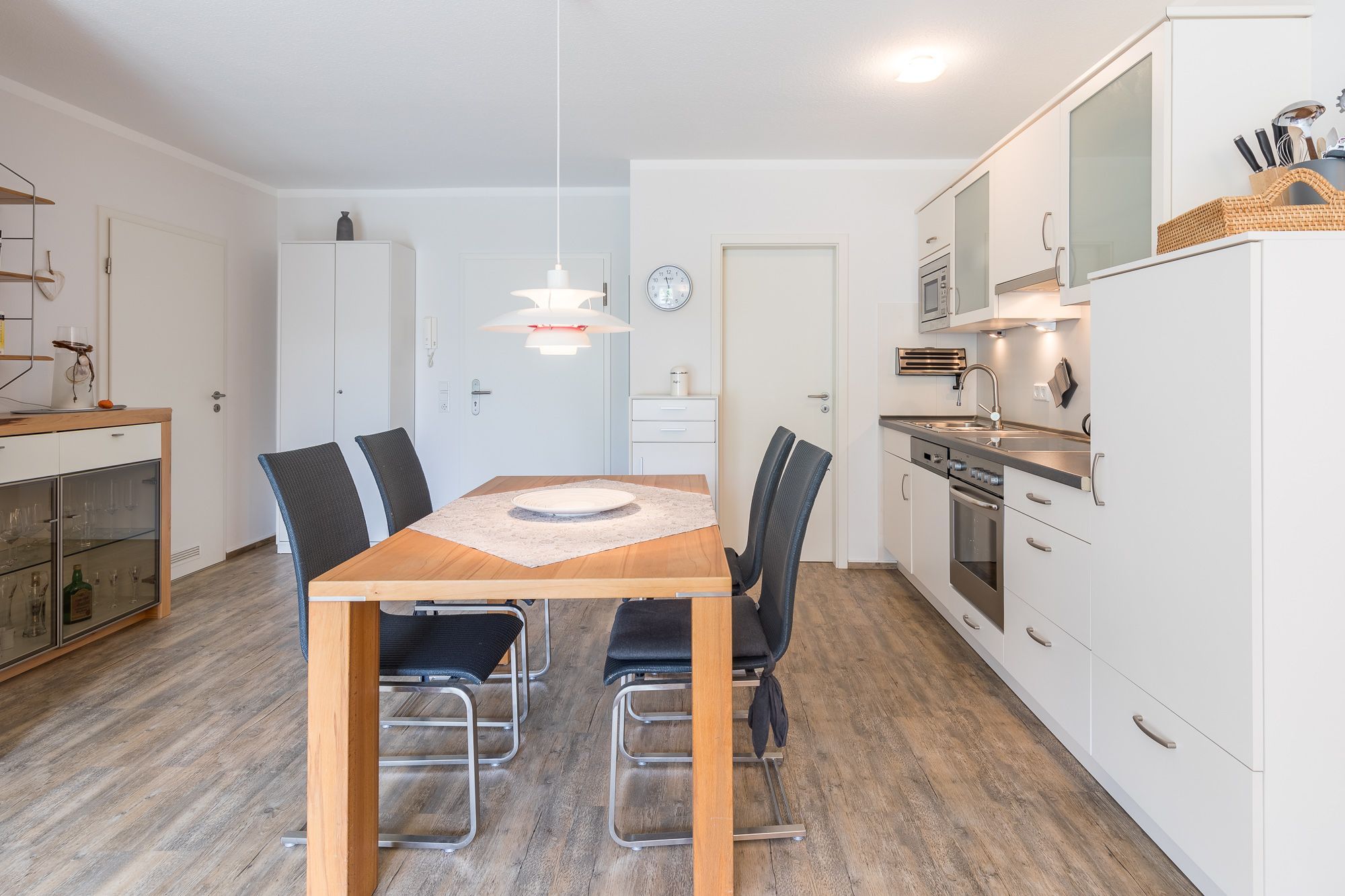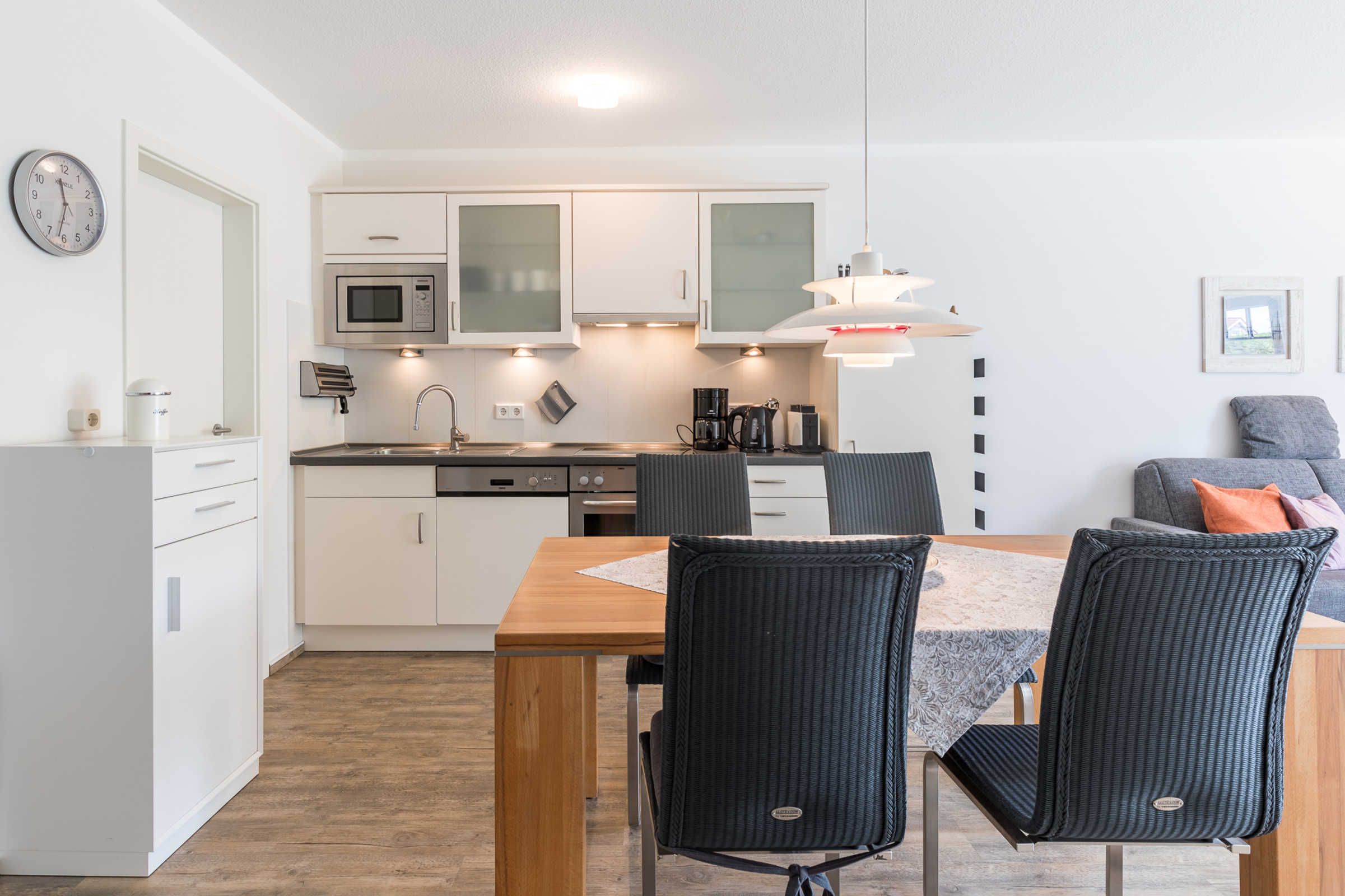 Die moderne Küchenzeile ist im Wohnzimmer integriert und offen gehalten. Hier finden Sie eine sehr gut sortierte Ausstattung, welche sich bestens für Ihre Selbstversorgung eignet. Ebenso befindet sich hier eine gemütliche Essecke, an der Sie gemeinsam speisen können.