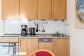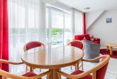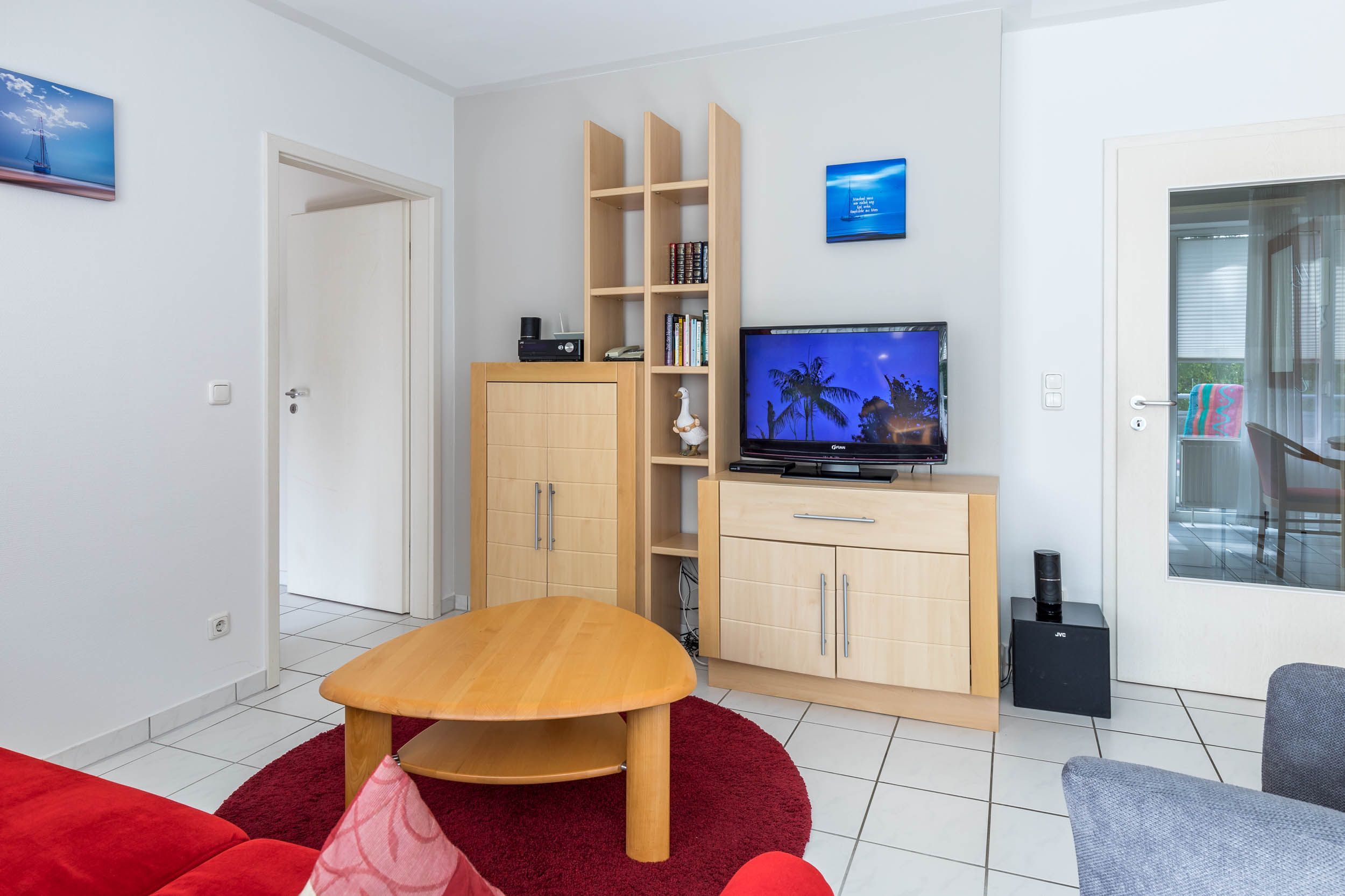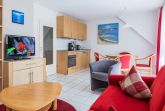 Die gemütliche Wohnung verfügt über einen offenen Wohn- und Essbereich mit integrierter Küchenzeile. Für Sicht- und Sonnenschutz sorgen Plissees. Flatscreen-TV, Radio und DVD-Player sorgen hier für mediale Unterhaltung. Das Sofa im Wohnbereich kann sonst bei Bedarf auch ausgezogen werden (Liegefläche ausgezogen 150x180cm).