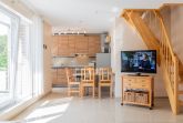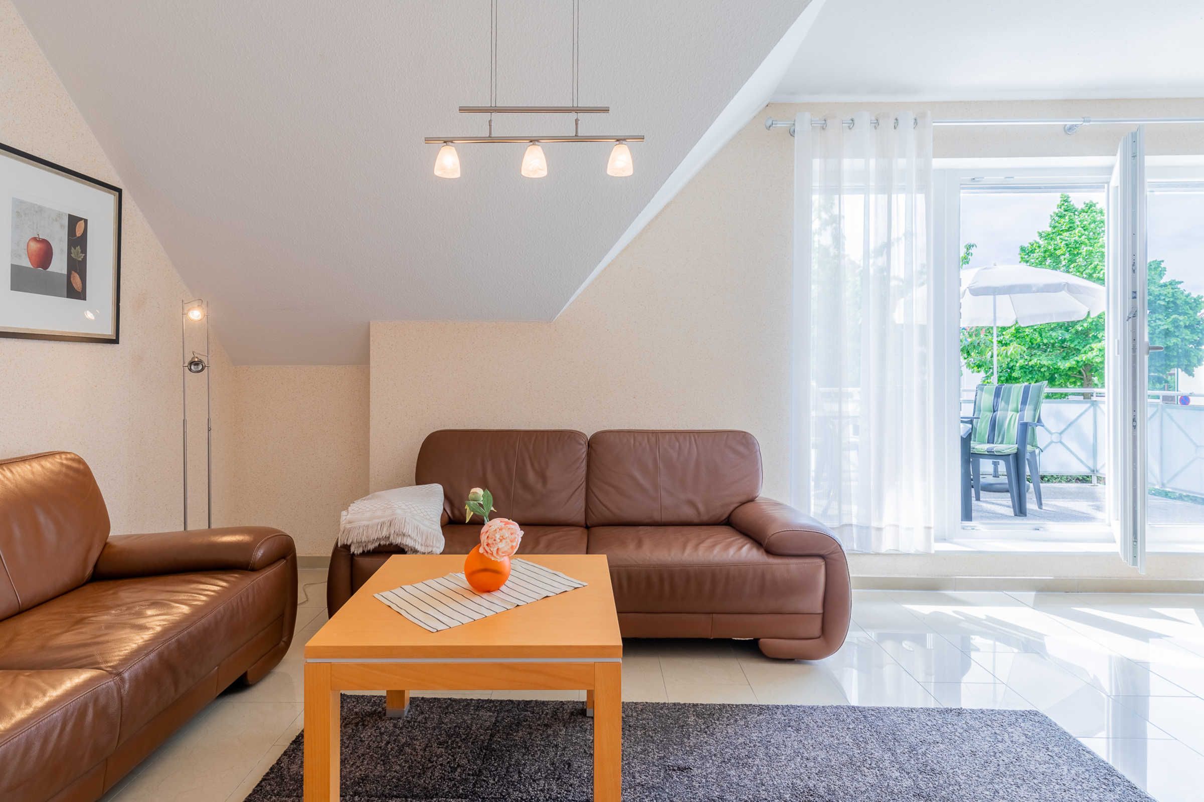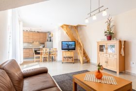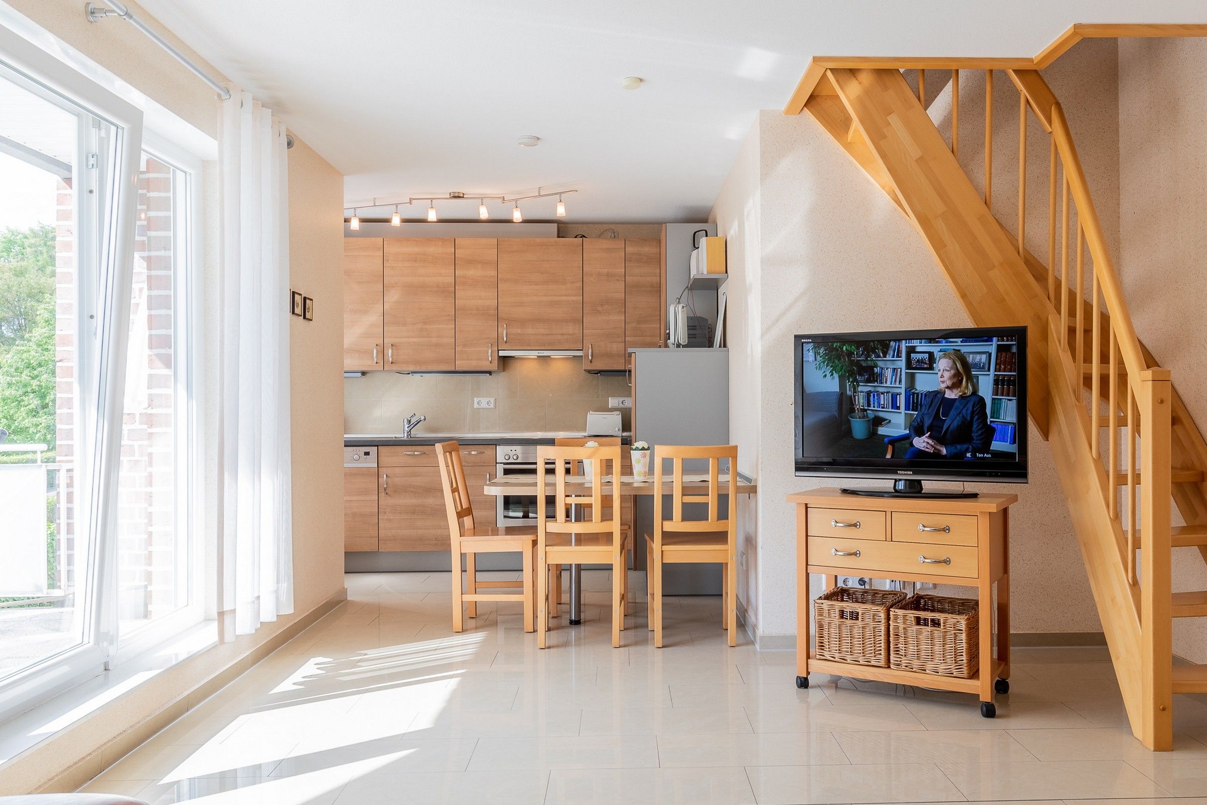 Ein helles Wohnzimmer im unteren Wohnbereich in warmen Farben sorgt mit SAT-TV und Mini-Stereoanlage für Gemütlichkeit, die integrierte Wohnküche mit Essecke für kulinarischen Genuss.