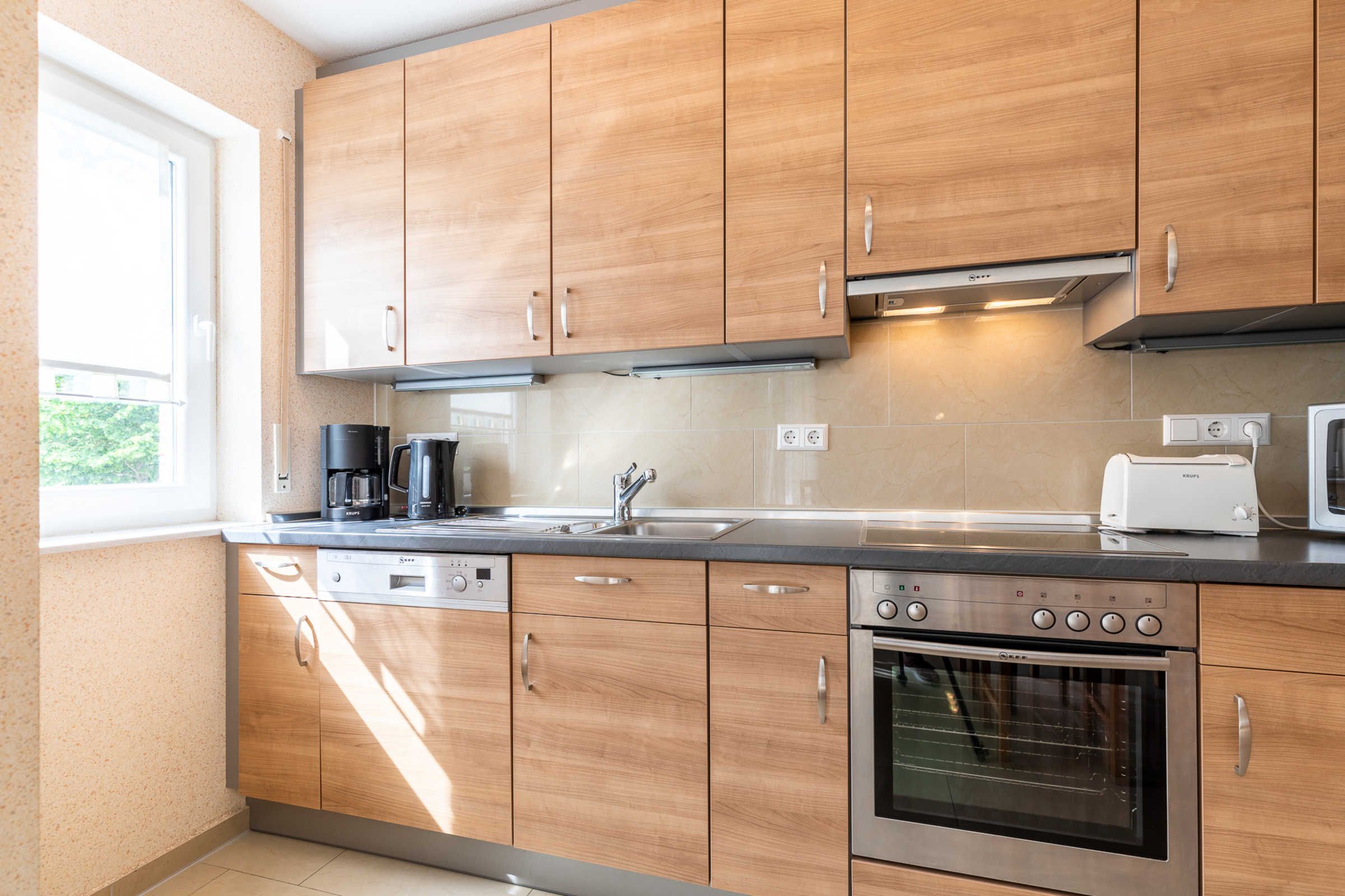 Die moderne Küchenzeile bietet Kühlschrank, Herd/ Ceranfeld, Backofen, Geschirrspüler, Mikrowelle, Elektrokleingeräte sowie ausreichend Geschirr & Co.