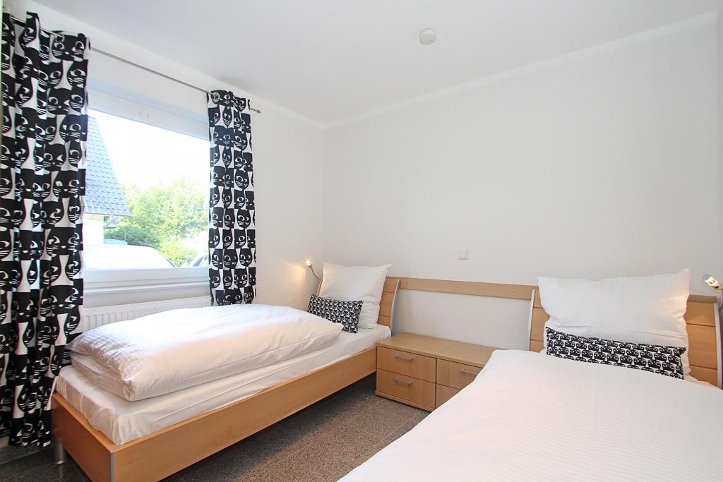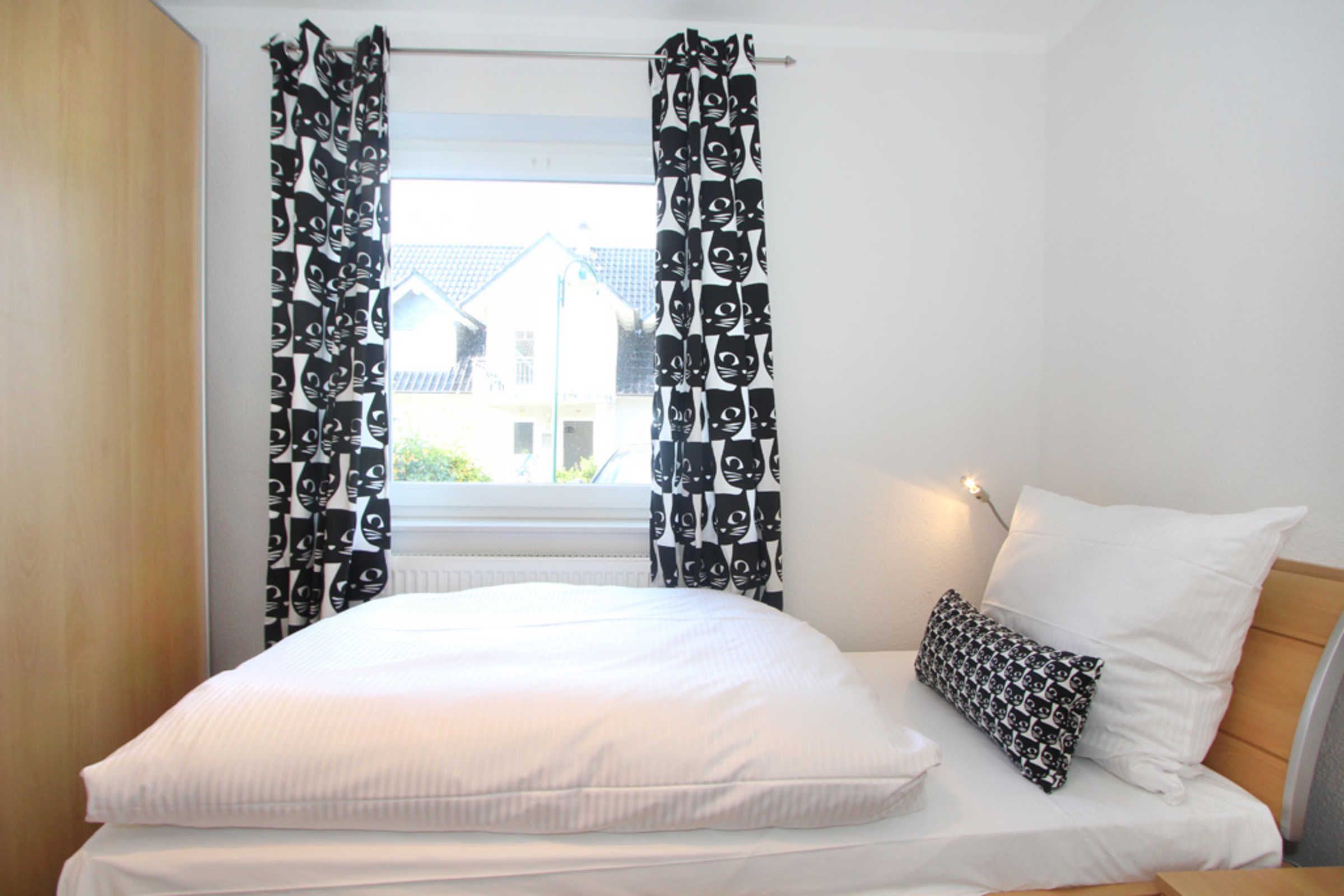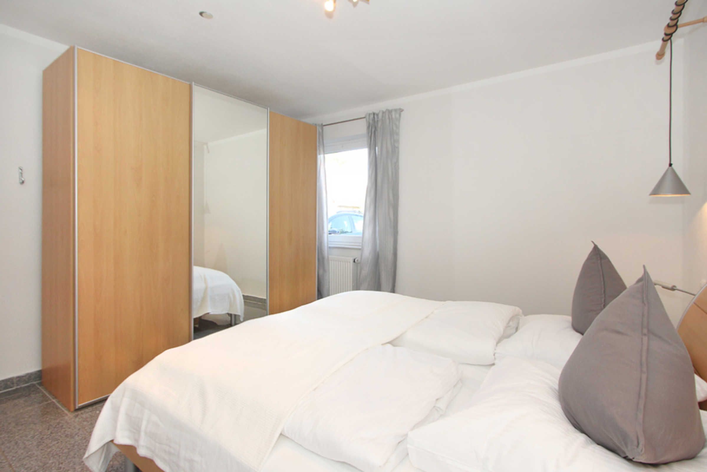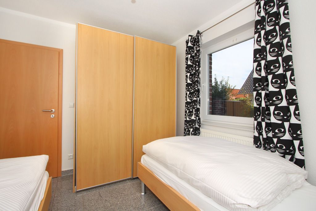Das Schlafzimmer bietet ein Doppelbett (180x200cm), einen großen Kleiderschrank und Platz für das Reisebettchen. Im Gäste-/ Kinderzimmer befinden sich 2 Einzelbetten (je 90x200cm) und ebenfalls ein Kleiderschrank.