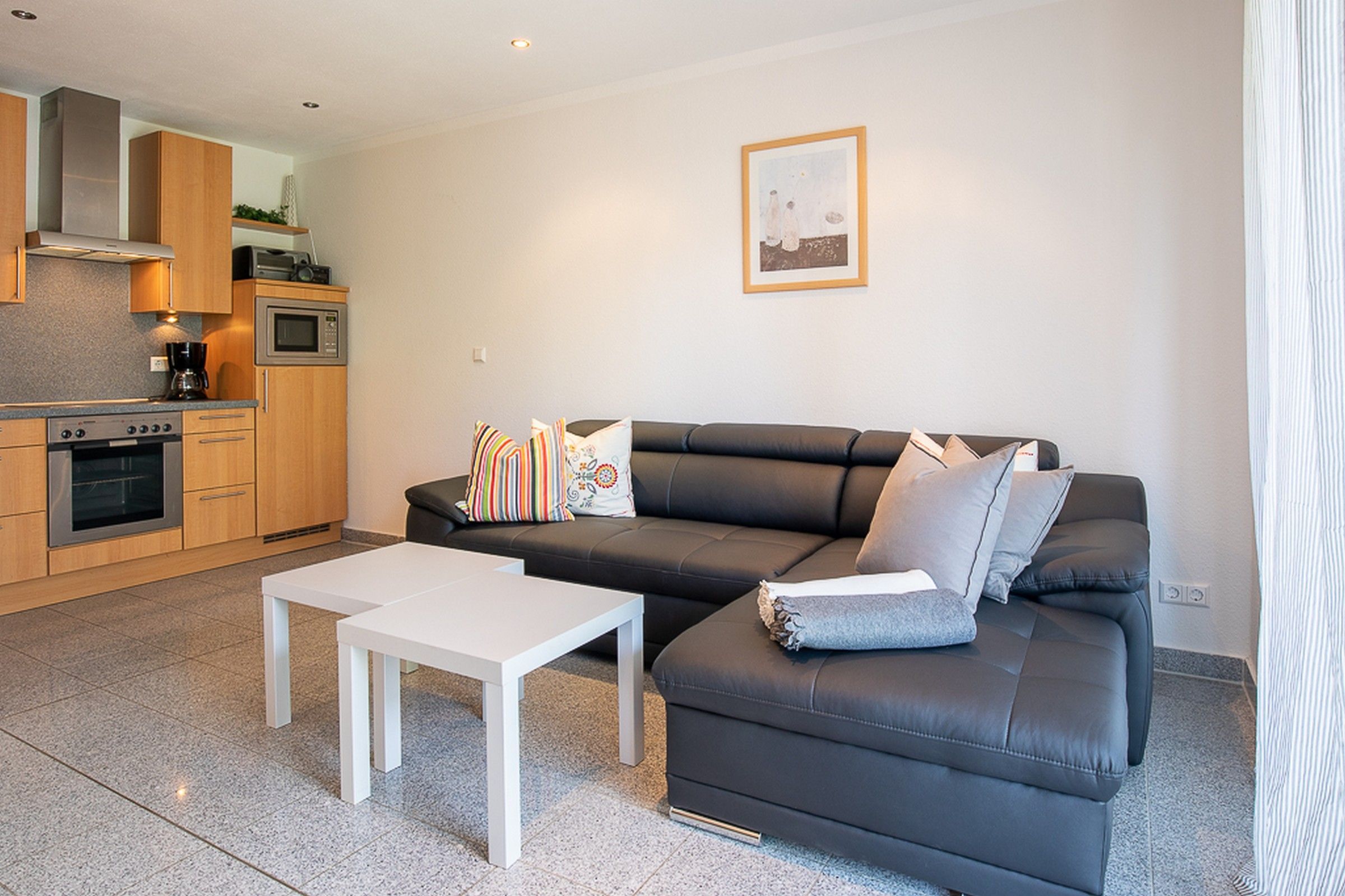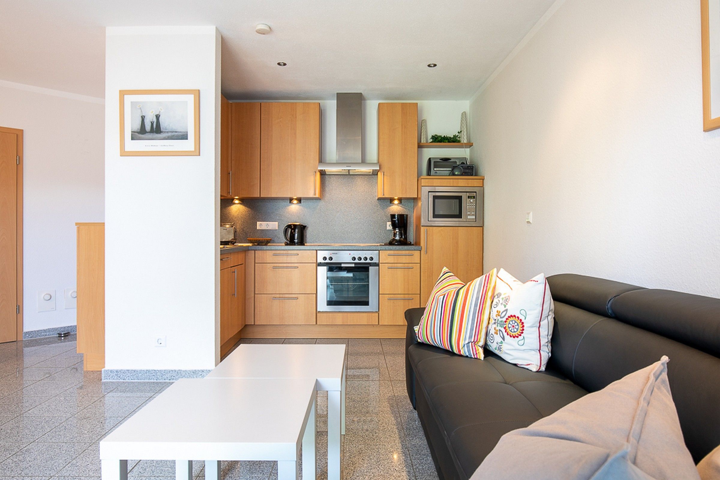 Sie verfügt über einen gemütlichen Wohnbereich mit Flatscreen-TV mit angrenzender moderner Wohnküche und integrierter Essecke für 4 Personen. Ein Reisebettchen kann hier bei Bedarf auch aufgestellt werden.
