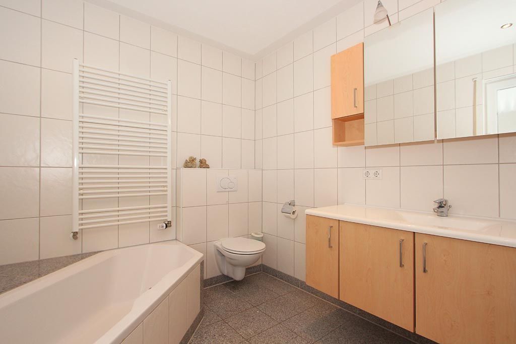 Weiterhin wird Ihnen hier ein großes, helles Bad mit barrierefreier Dusche, Eckbadewanne und WC geboten. Das Fenster spendet Tageslicht und hilft beim Lüften, z.B. nach dem Duschen oder Baden.